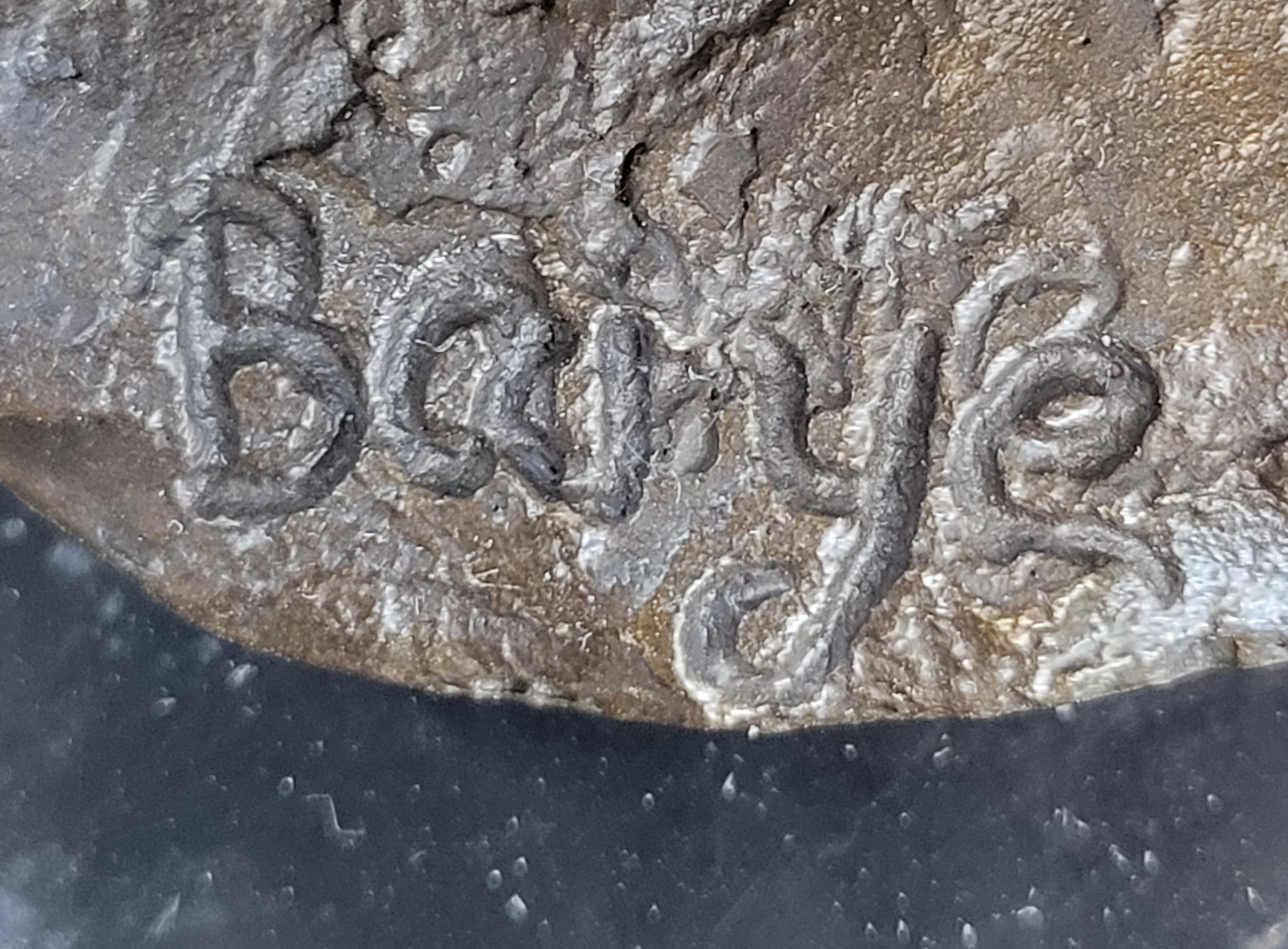 At one time, boars were respected as fierce and brave creatures. Even though they don't appear dangerous in size and demeanor, they should not be underestimated. If surprised or concerned, a boar can and will defend itself and its young with intense vigor. The male lowers its head, charges, and then slashes upward with his tusks. The female, whose tusks are not visible, charges with her head up, mouth wide, and bites. Their tusks continuously grow and serve as tools and as weapons. It would certainly be wise to not be on the receiving end of the charge of a wild boar. In most cultures, boars are usually regarded as a sacred animal. The boar is one of the 12 animals of the Chinese zodiac and is associated with fertility and virility. At one point during the Persian Empire, people would add the adjective "Boraz (Goraz)" (meaning boar) to the end of someone's name to show their bravery and courage. This boar would be an excellent addition to any desk or mantle and would be a great conversation starter! It is made of 100% pure bronze with a dark brown patina and is set on a black marble base. The sculpture is also signed by Barye and holds a stamp from the European Bronze Finery.Bronze Dimensions with Marble Base: Height 7" x Width 11"