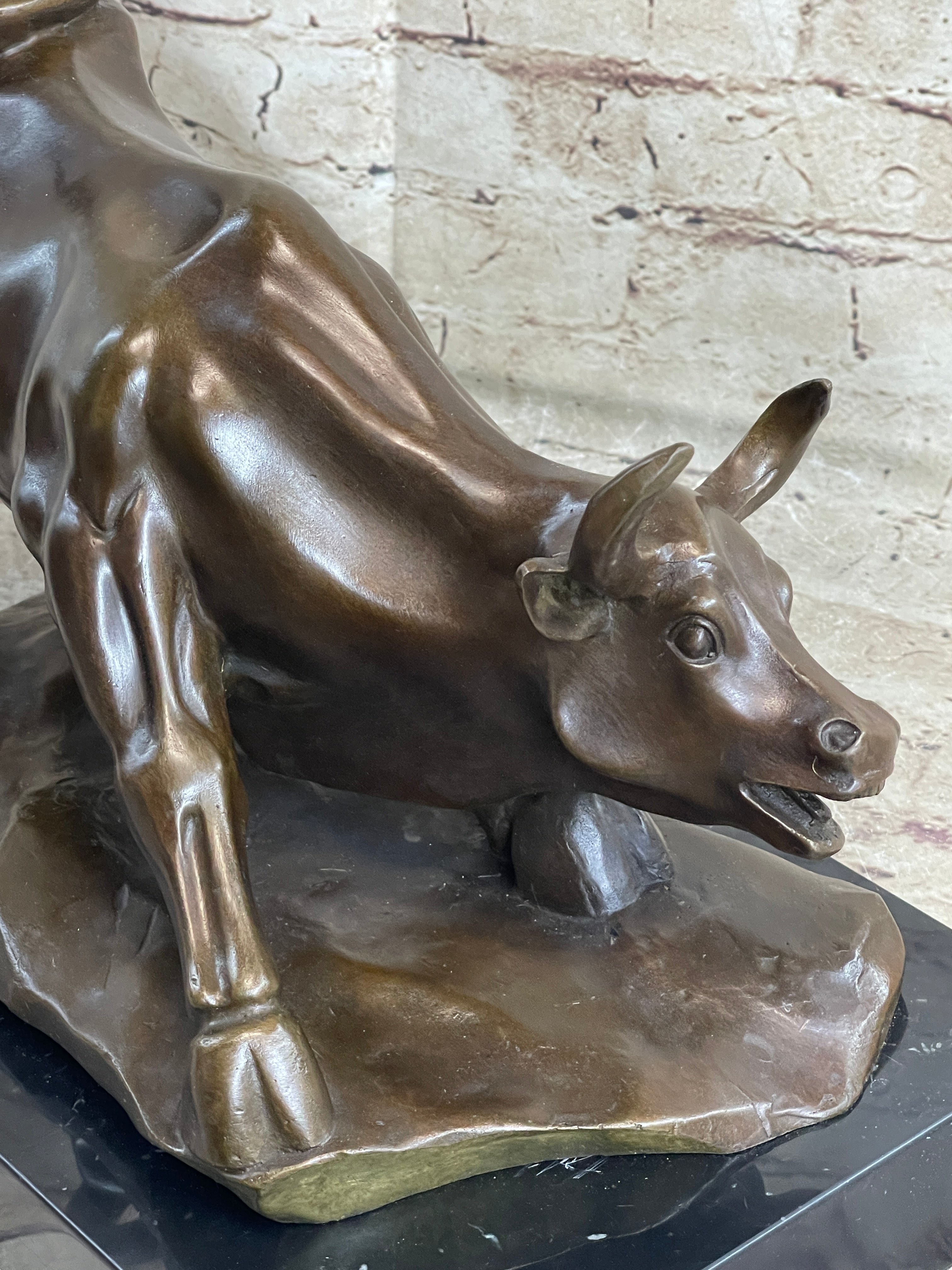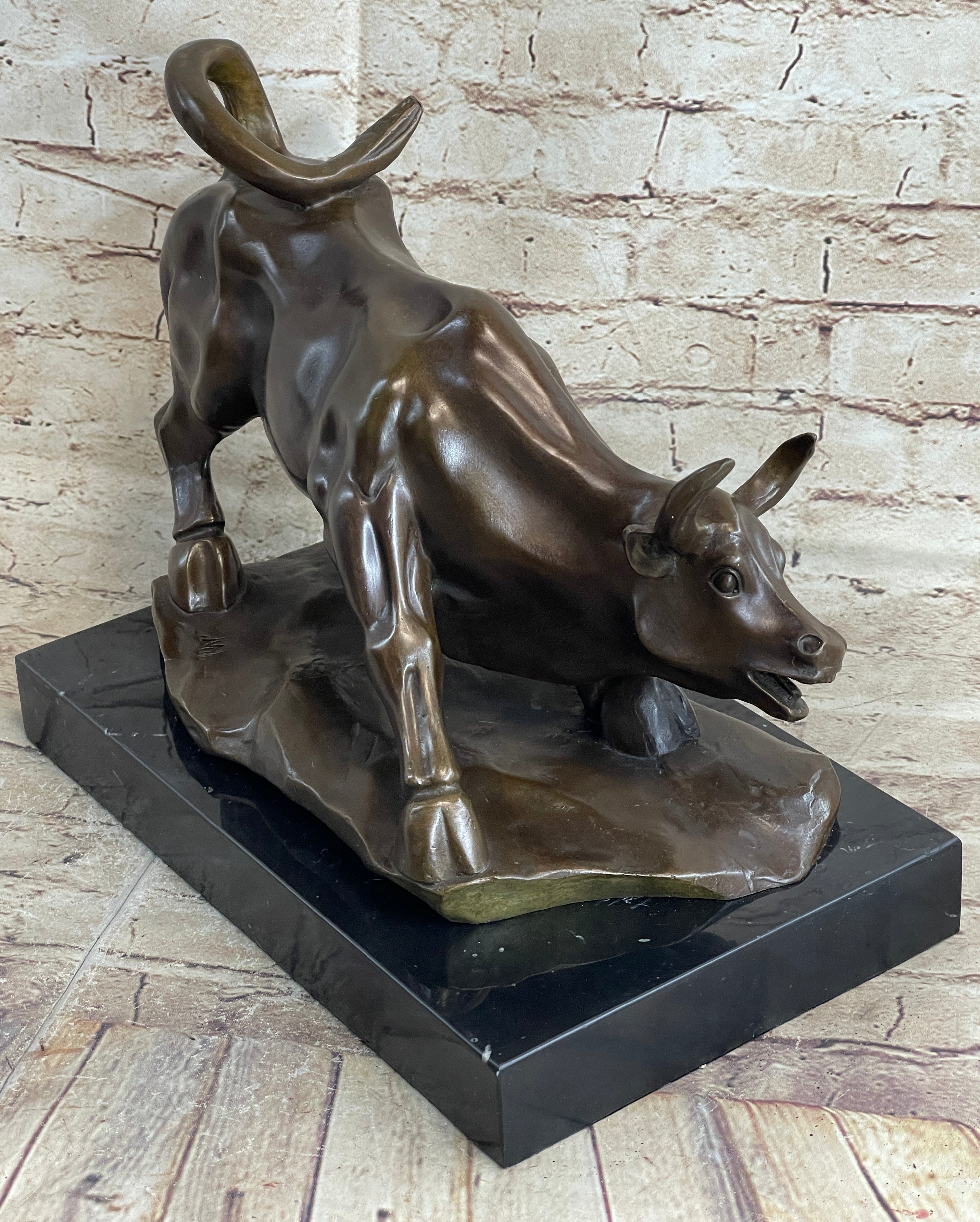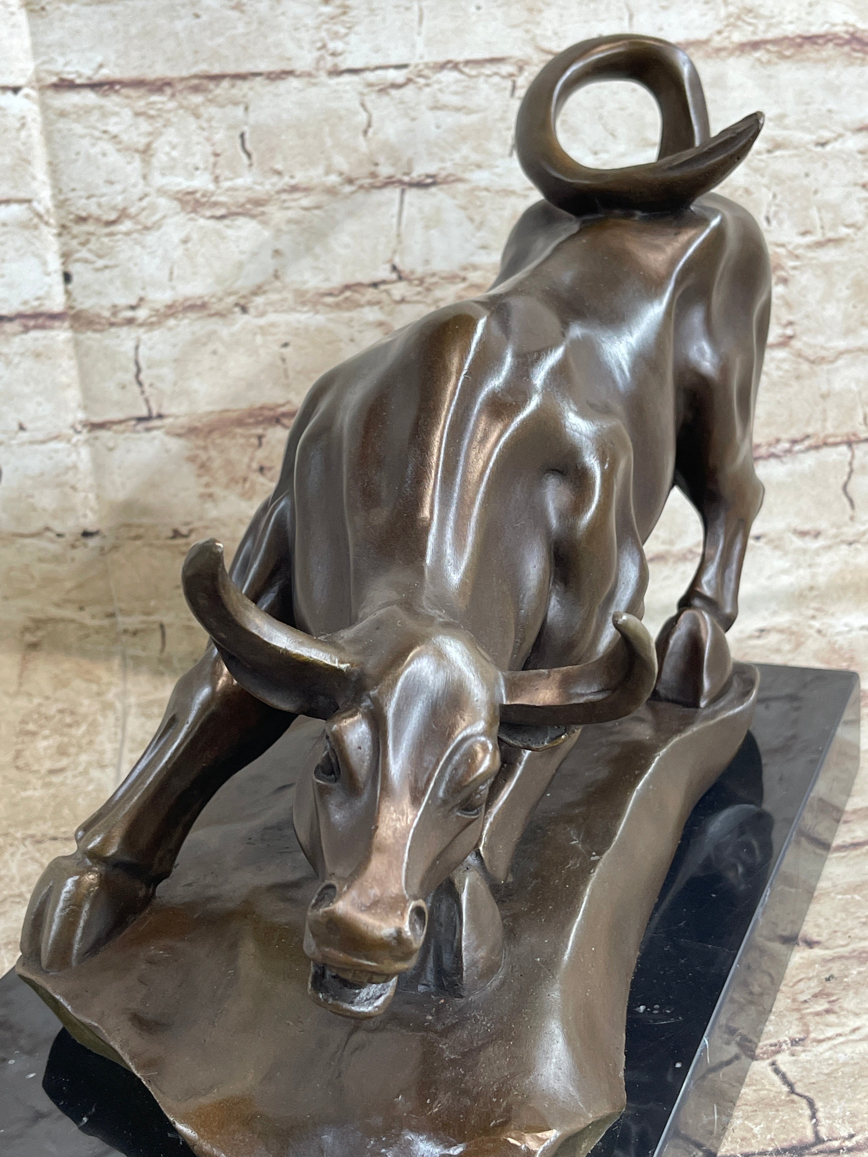 No need to venture to Spain for a good old-fashioned afternoon at a bullfight. The arena is in your home with this Spanish bull sculpture. Bullfighting is a traditional spectacle of Spain, Portugal, some cities in southern France and in several Latin American countries. It can be considered a blood sport for both the bull or the brave matador that faces it in the ring. This brown patina bull is in motion and hunting for its next target. Once he sets his eyes on you there's no stopping him. He digs his hooves in, crouches low, lowers his curled horns and prepares to charge. The details of this handmade sculpture is in the bull's body. The lines of his muscles, were carefully constructed. 100% bronze, this sculpture was cast using the "Lost Wax Method". It is mounted on a round black marble base and signed by the artist Milo.Bronze Dimensions with Marble Base: Height 12" x Width 17"
