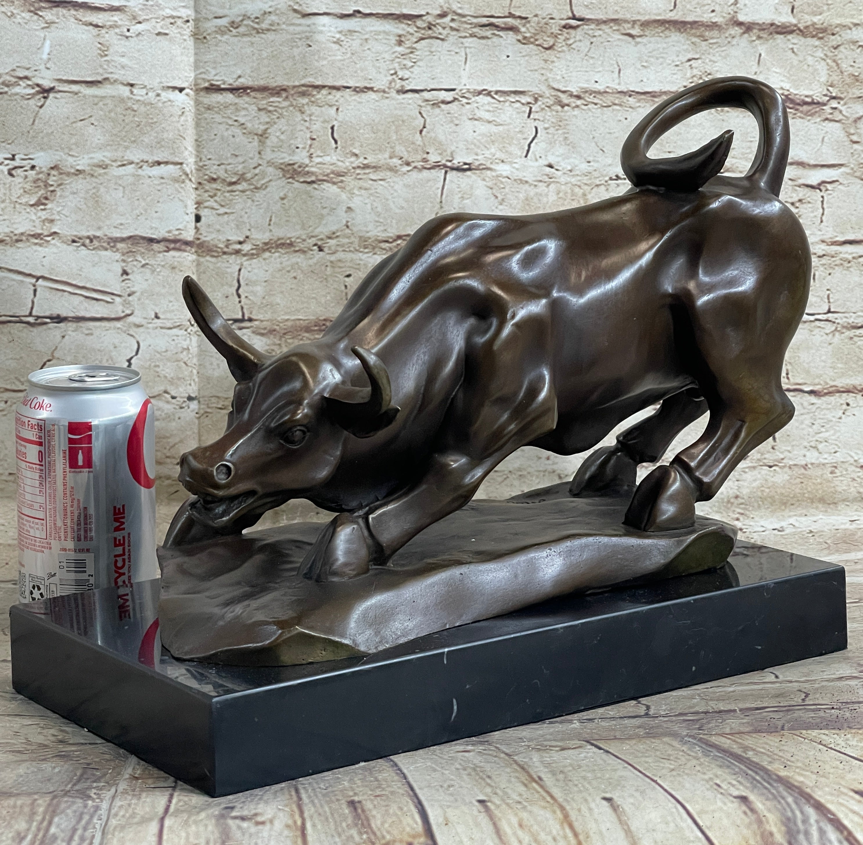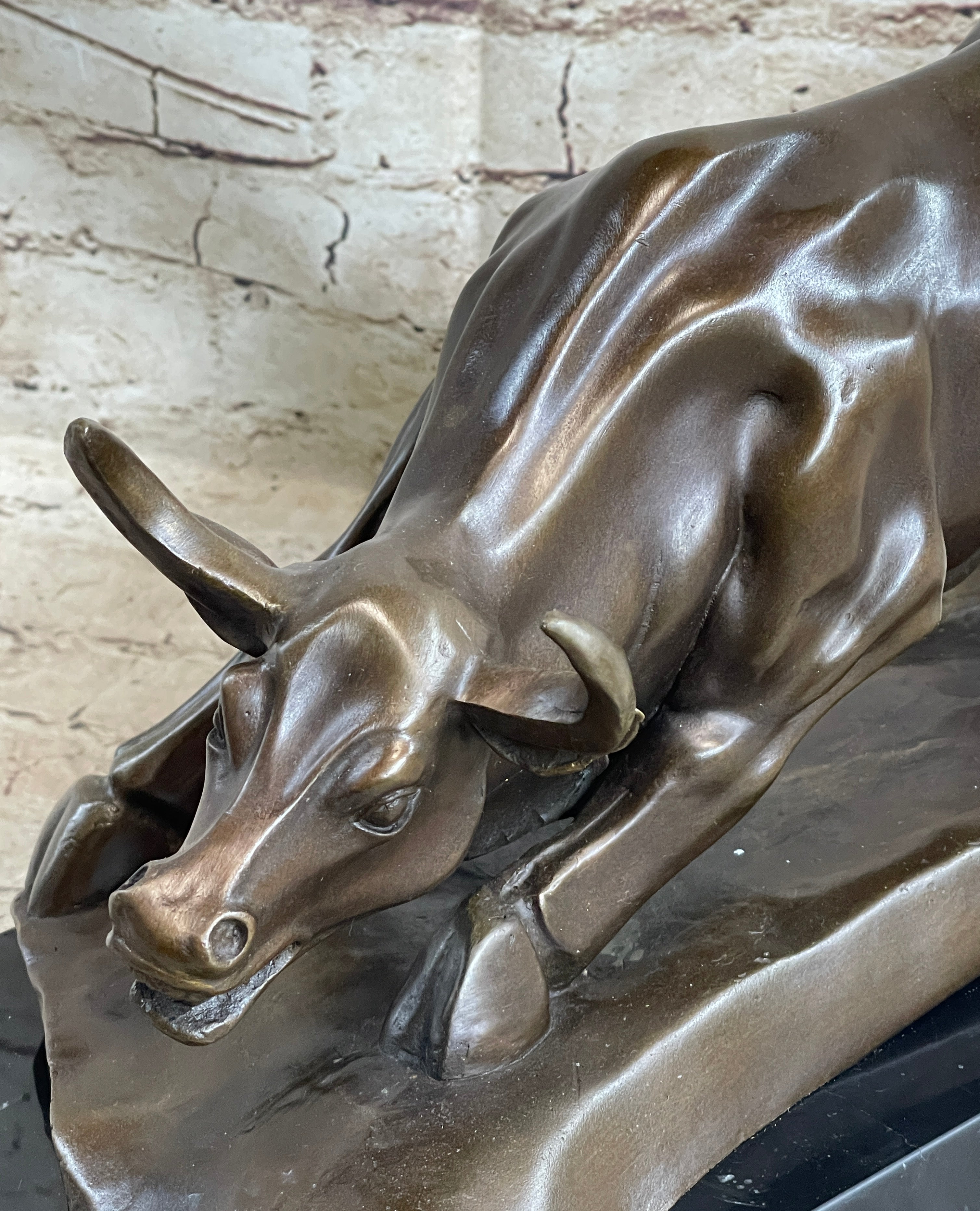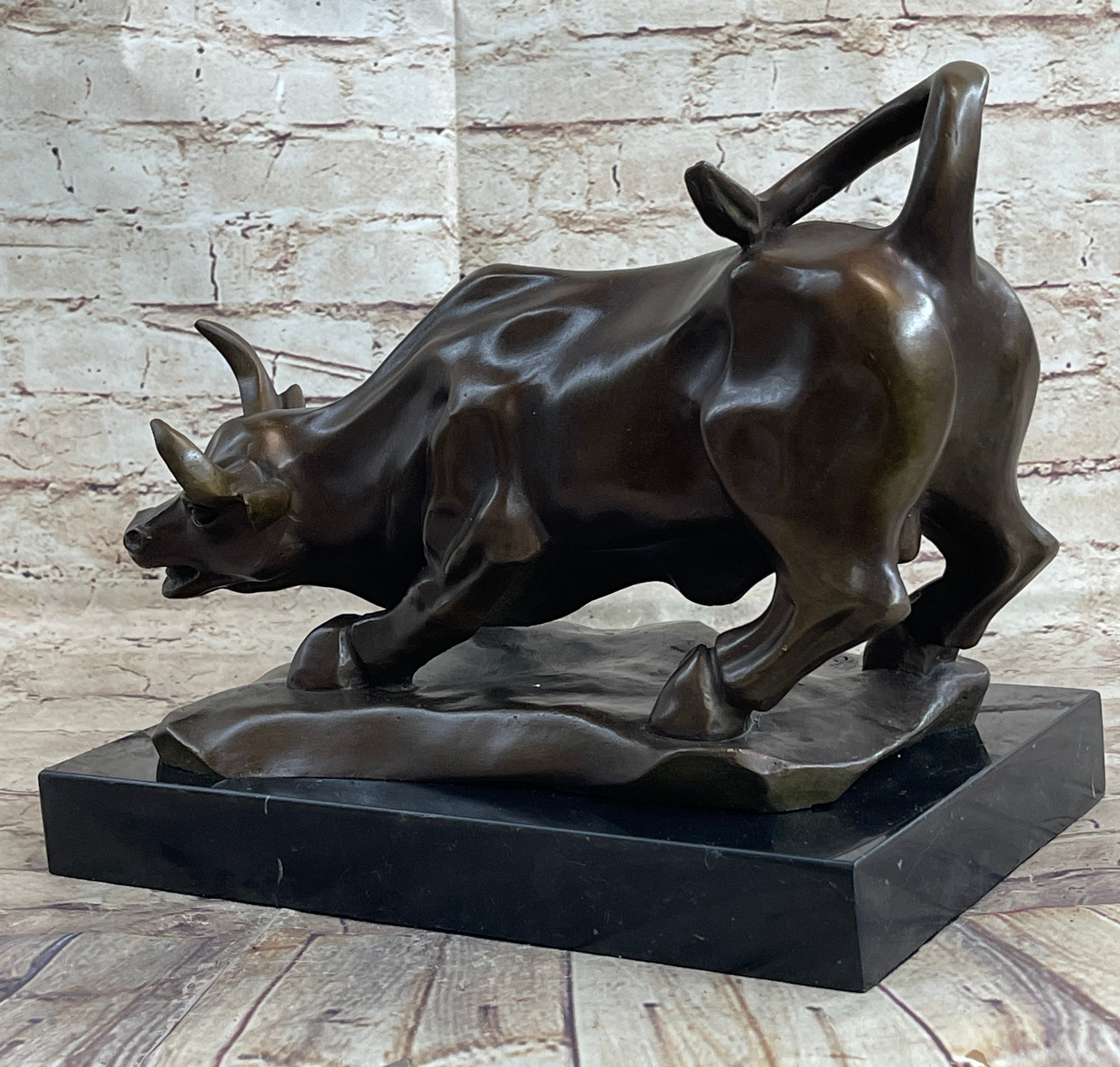 No need to venture to Spain for a good old-fashioned afternoon at a bullfight. The arena is in your home with this Spanish bull sculpture. Bullfighting is a traditional spectacle of Spain, Portugal, some cities in southern France and in several Latin American countries. It can be considered a blood sport for both the bull or the brave matador that faces it in the ring. This brown patina bull is in motion and hunting for its next target. Once he sets his eyes on you there's no stopping him. He digs his hooves in, crouches low, lowers his curled horns and prepares to charge. The details of this handmade sculpture is in the bull's body. The lines of his muscles, were carefully constructed. 100% bronze, this sculpture was cast using the "Lost Wax Method". It is mounted on a round black marble base and signed by the artist Milo.Bronze Dimensions with Marble Base: Height 12" x Width 17"