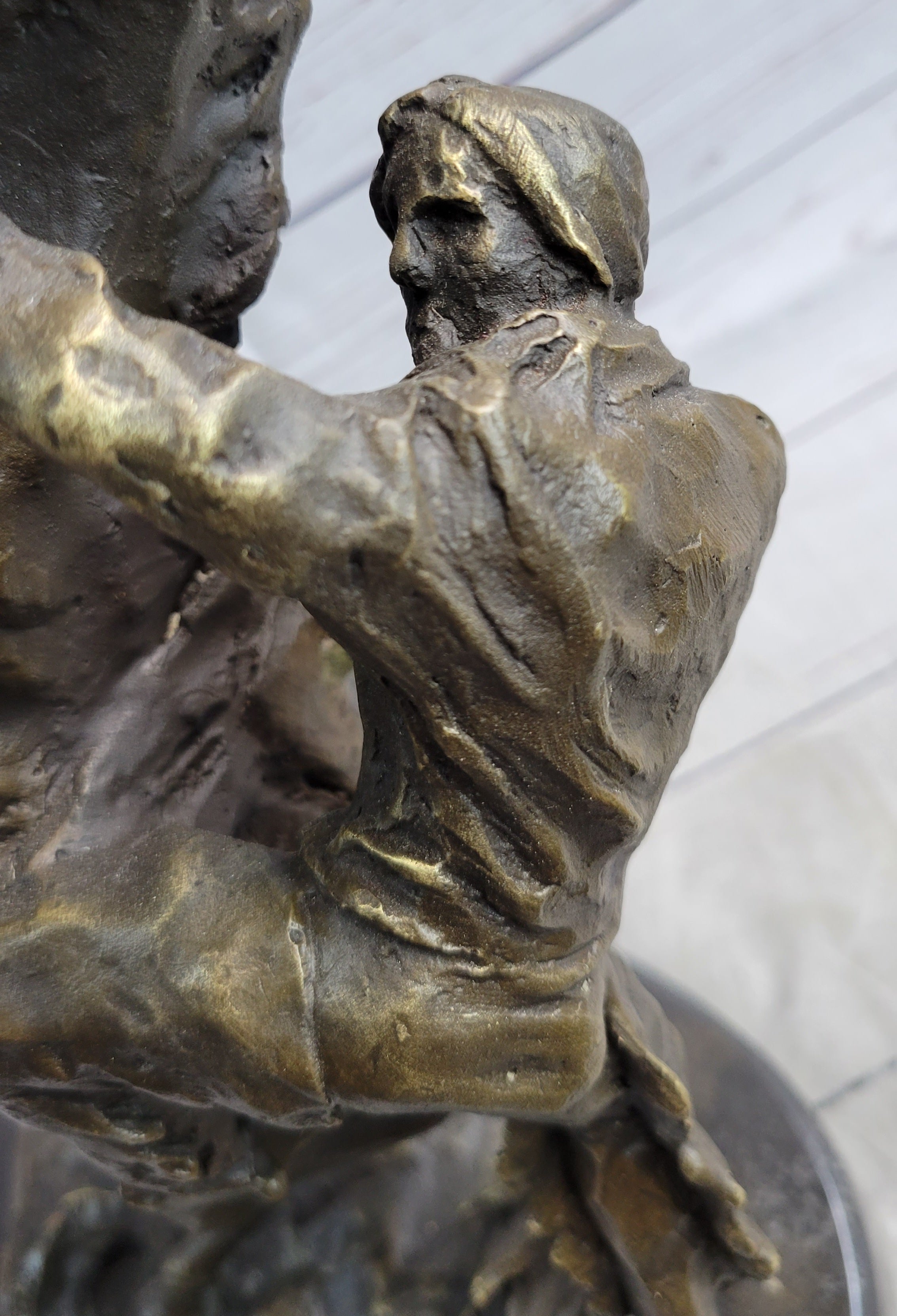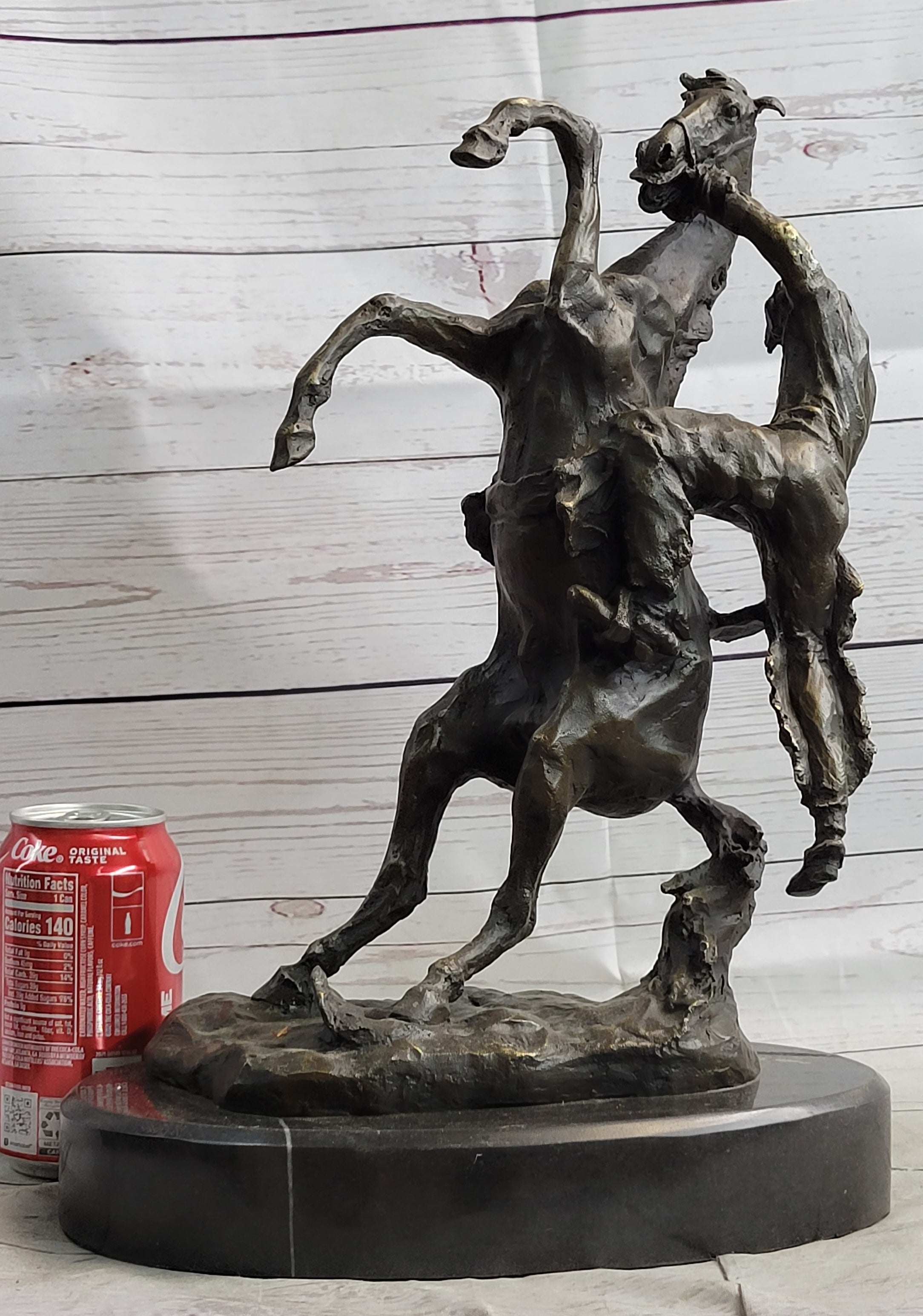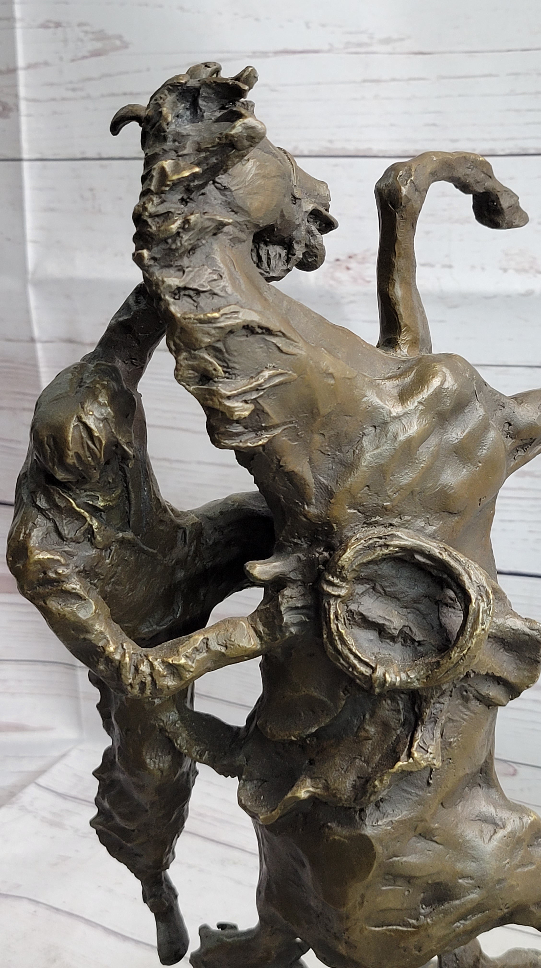 Experience a moment frozen in time, where disaster looms just seconds away. This mesmerizing sculpture captures the intense scene of a horse and rider on the brink of falling backward. In this dramatic moment, the horse resolutely refuses to succumb to the demands of rodeo or any attempt to break its spirit. The horse wrangler mirrors the horse's vertical defiance, both refusing to yield.