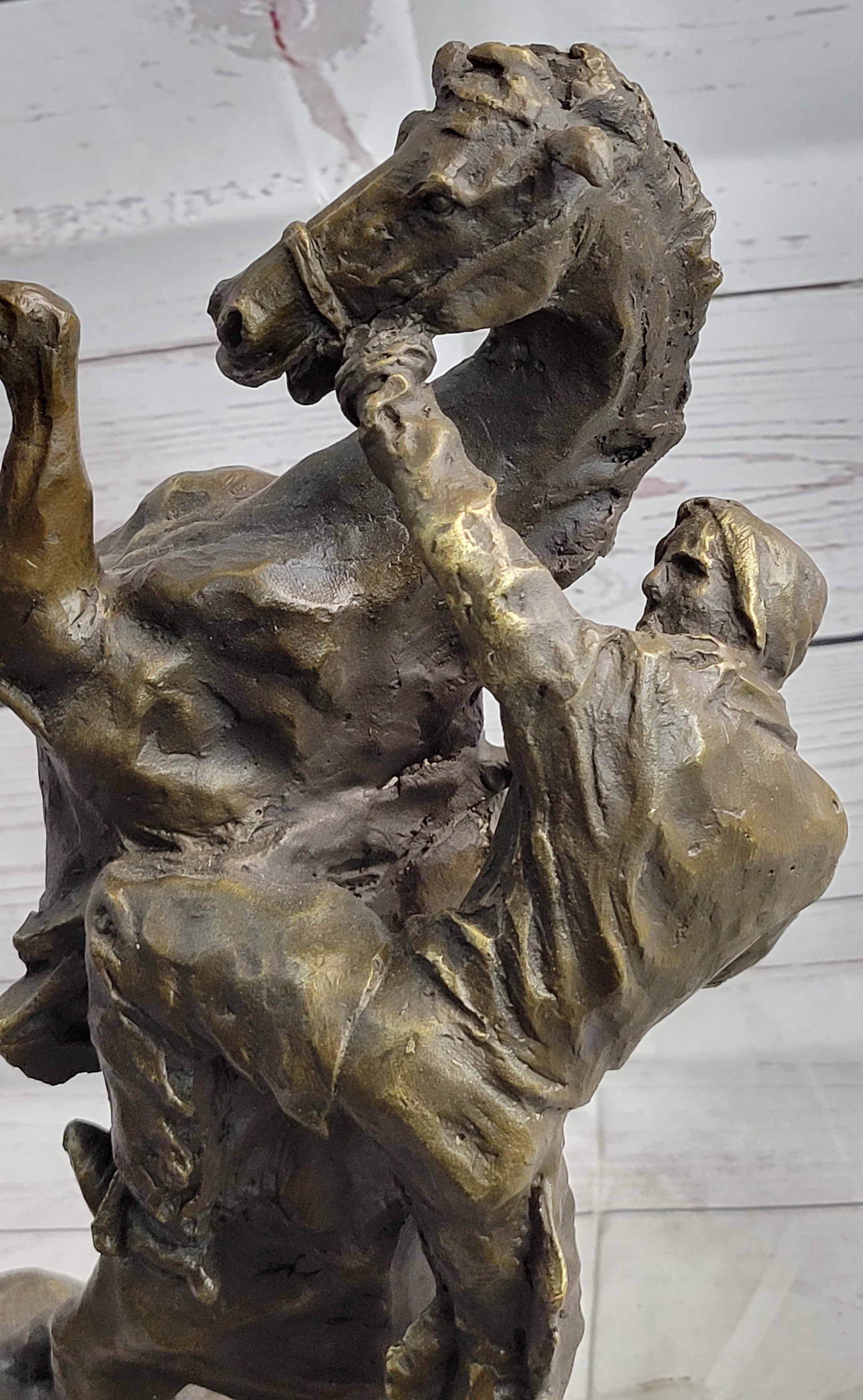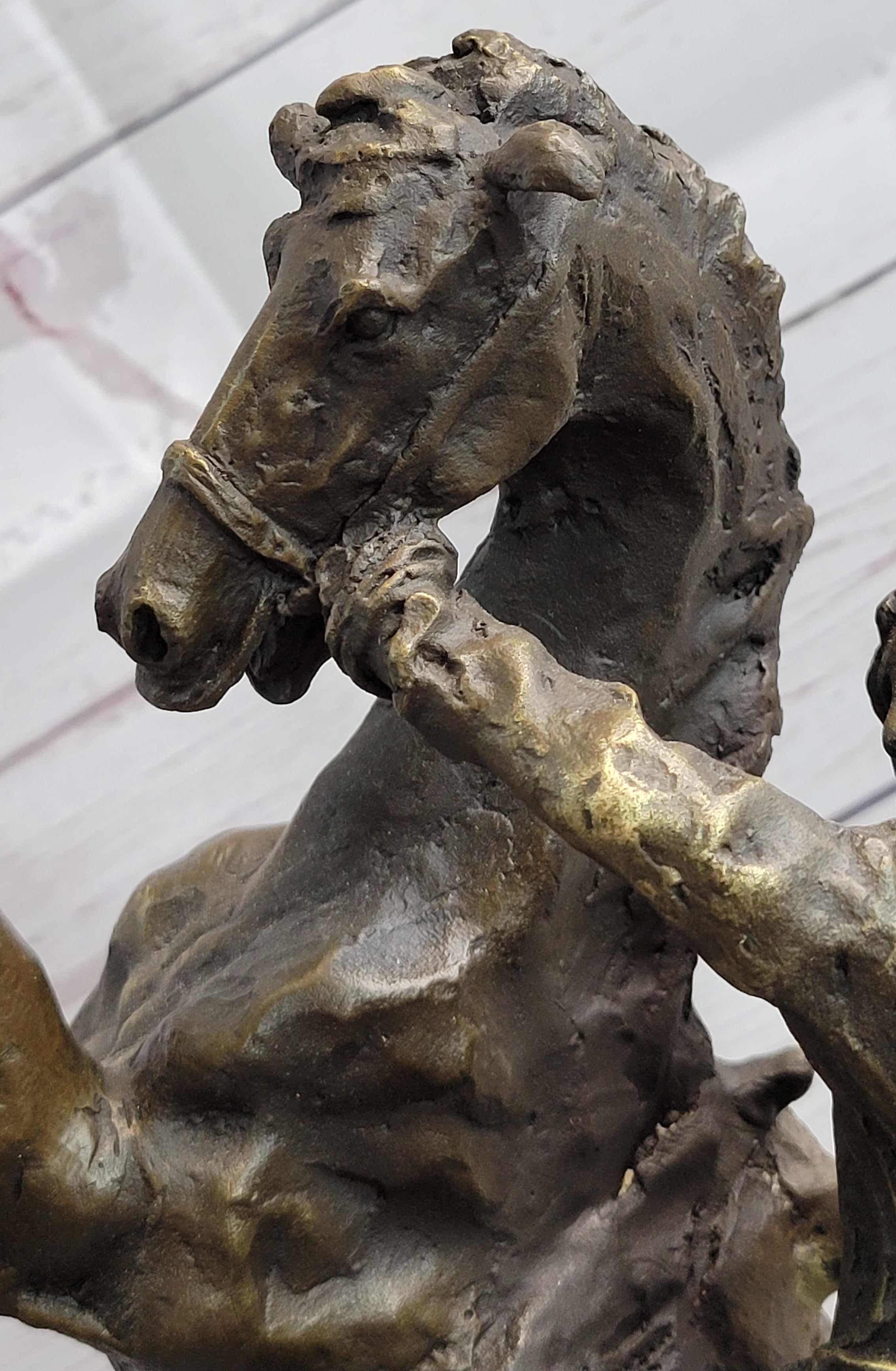 Invite the spirit of defiance and strength into your space with this extraordinary bronze sculpture. It serves as a poignant reminder of the indomitable spirit of both horse and rider, captured in a timeless moment of unwavering determination.Bronze Dimensions with Marble Base: Height 15" X Width 10"