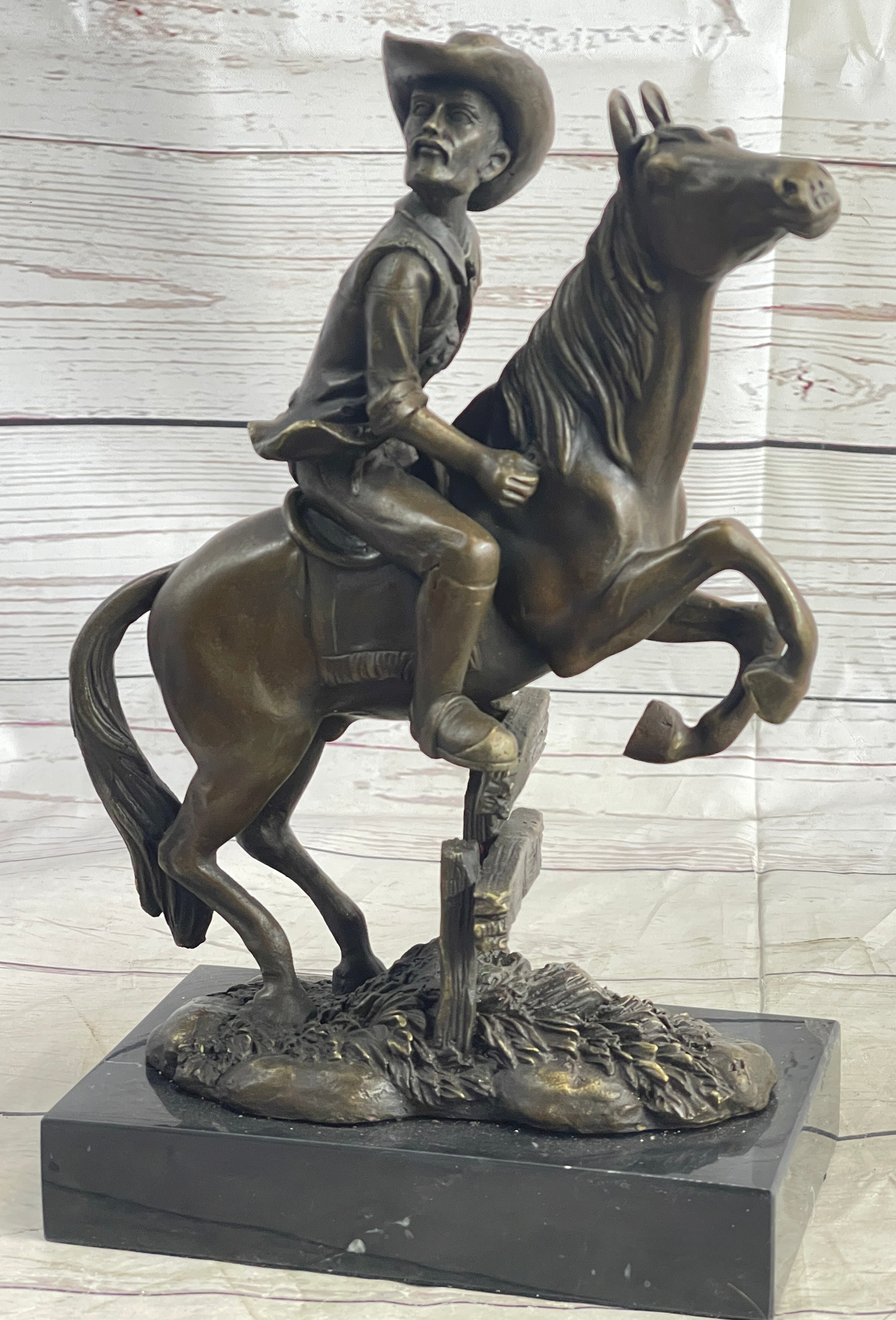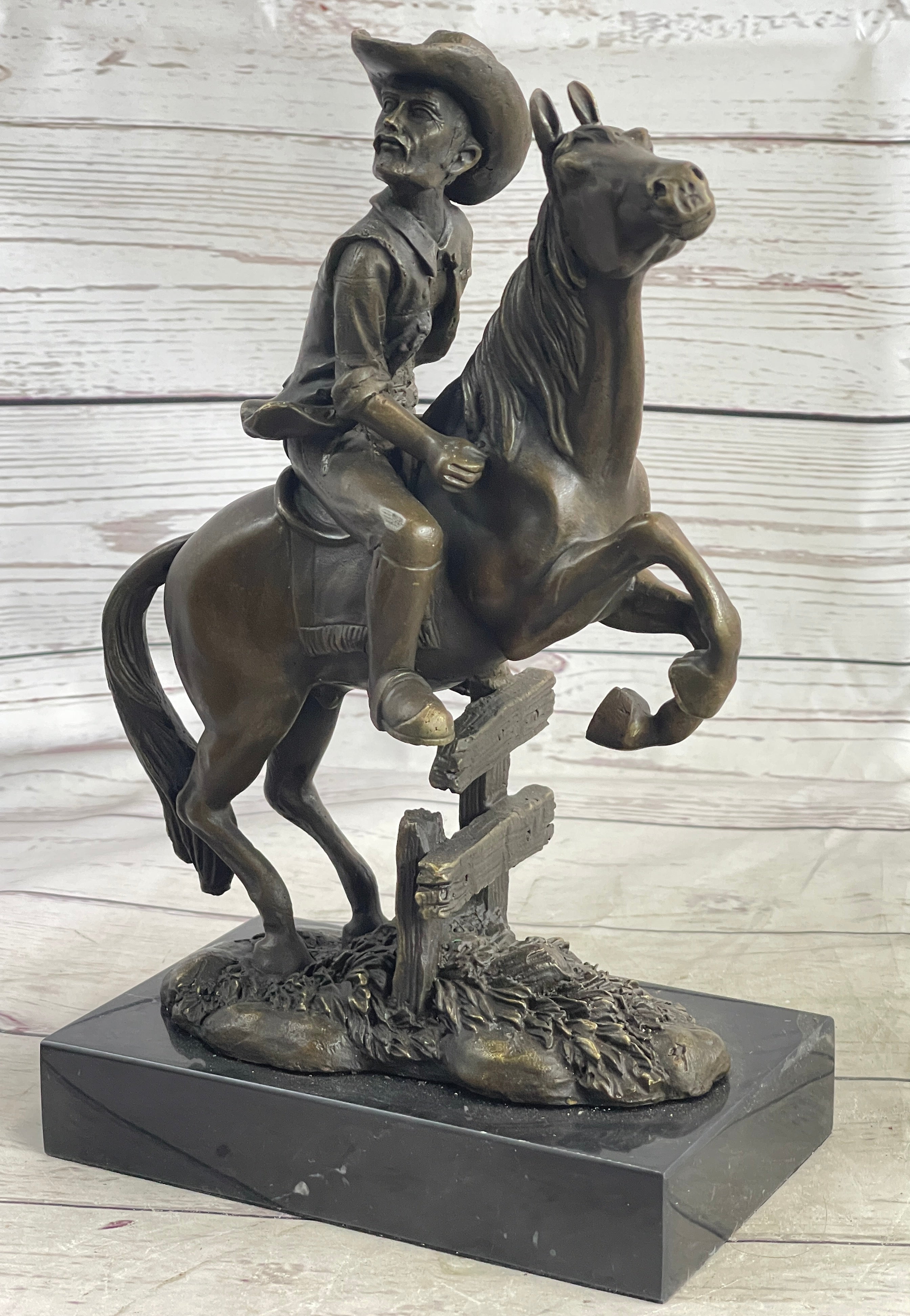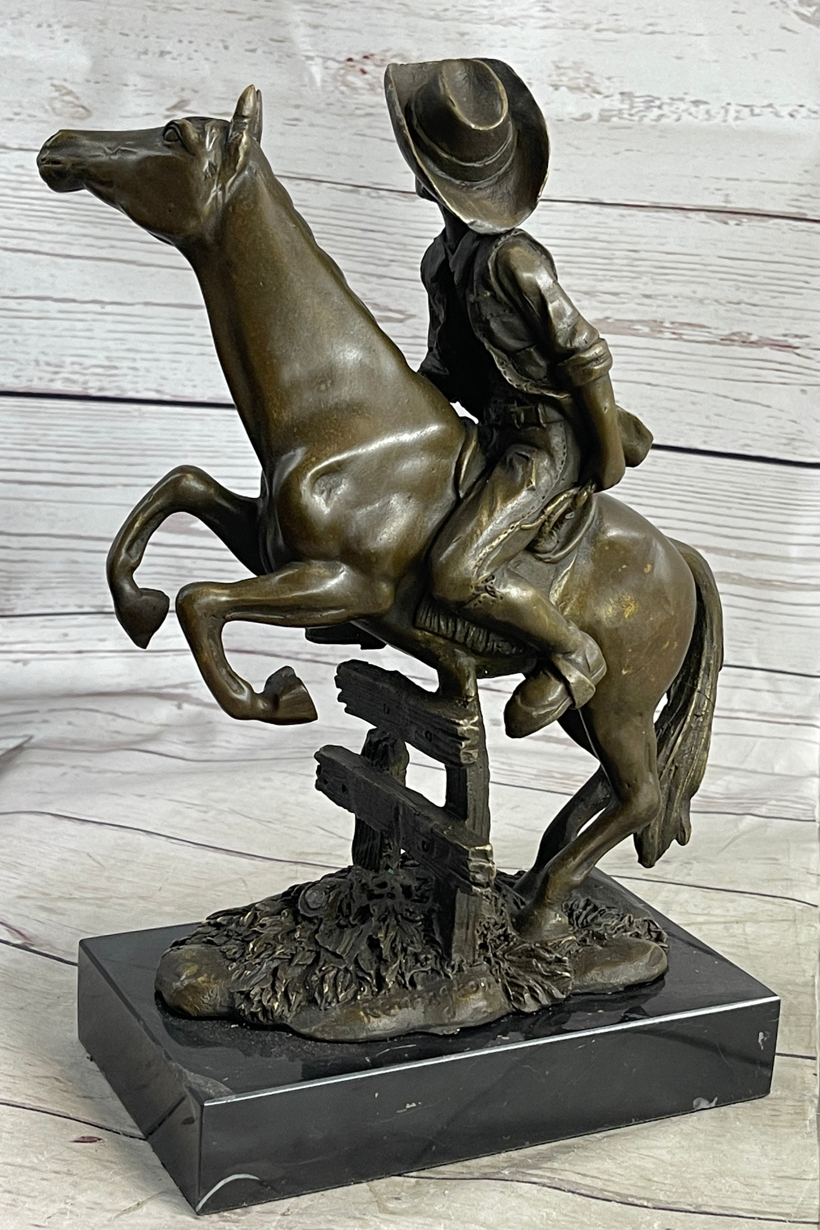Cowboy on Horseback Hopping a Fence Bronze Sculpture Statue Western Decor