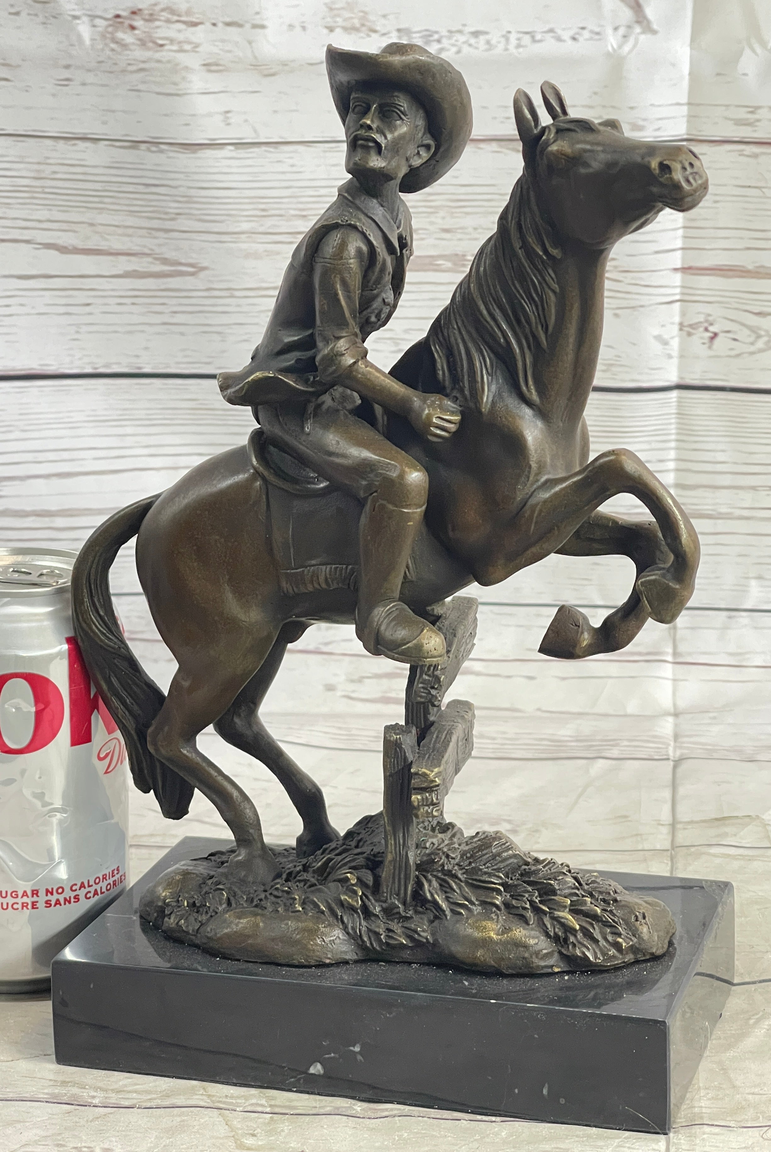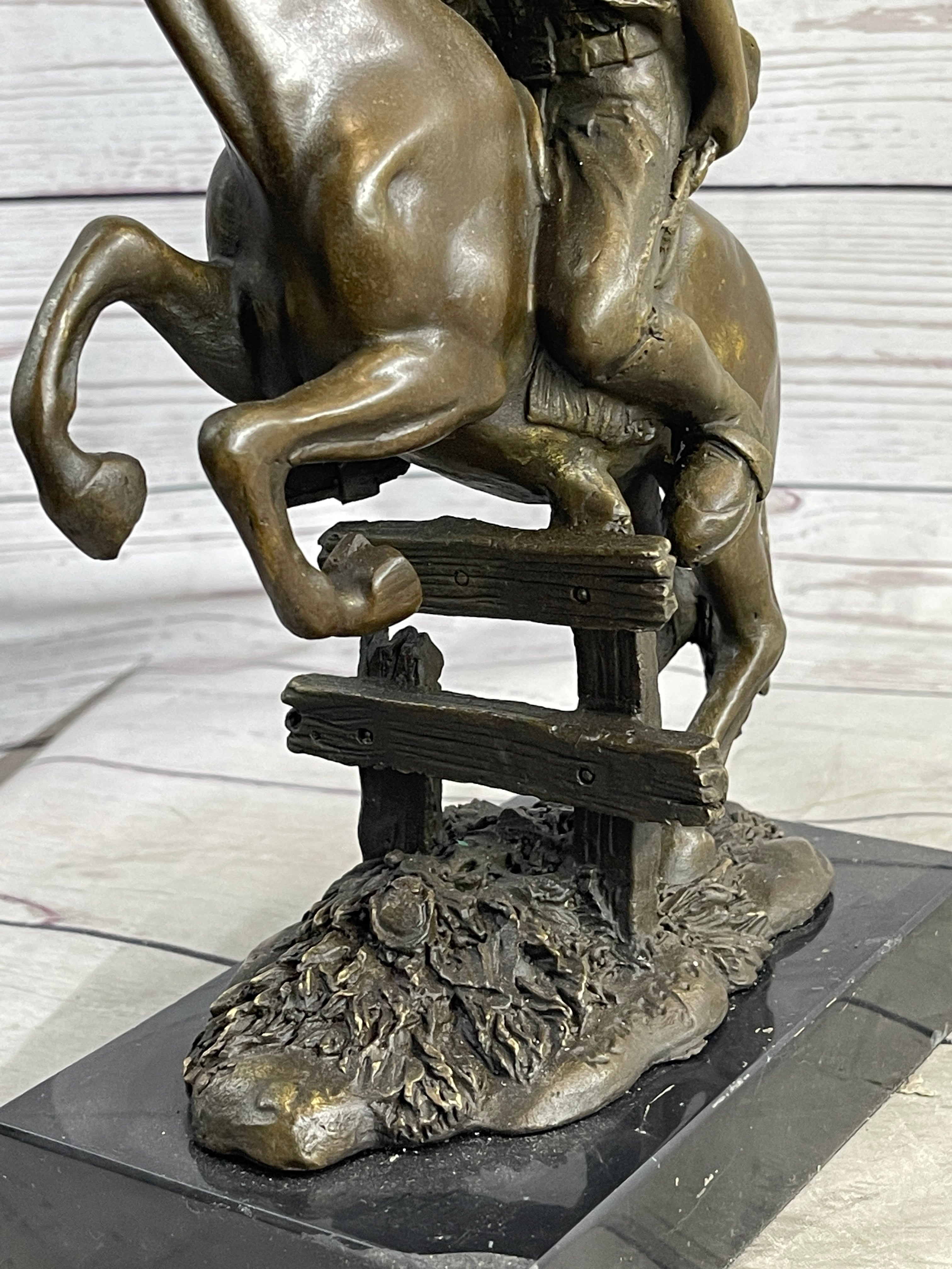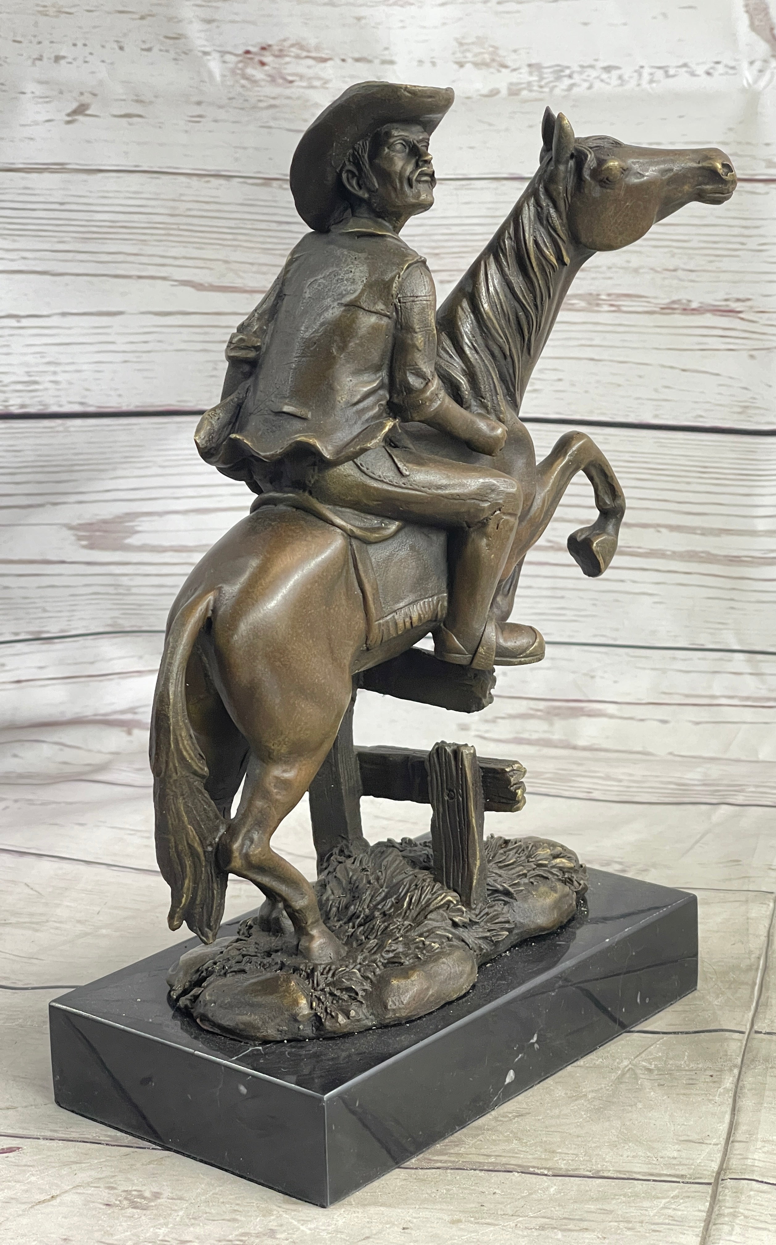 Cowboy on Horseback Hopping a Fence Bronze Sculpture Statue Western Decor