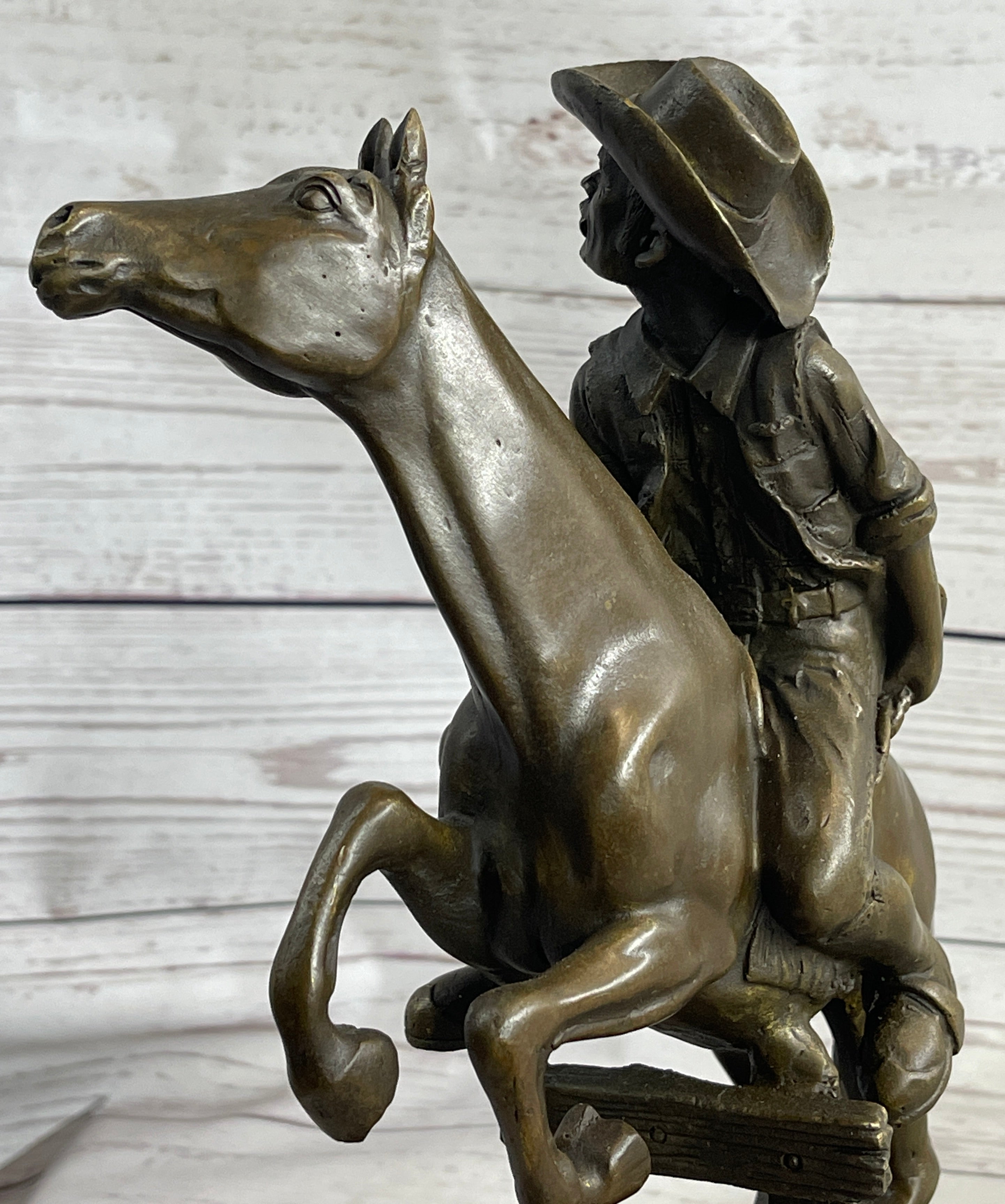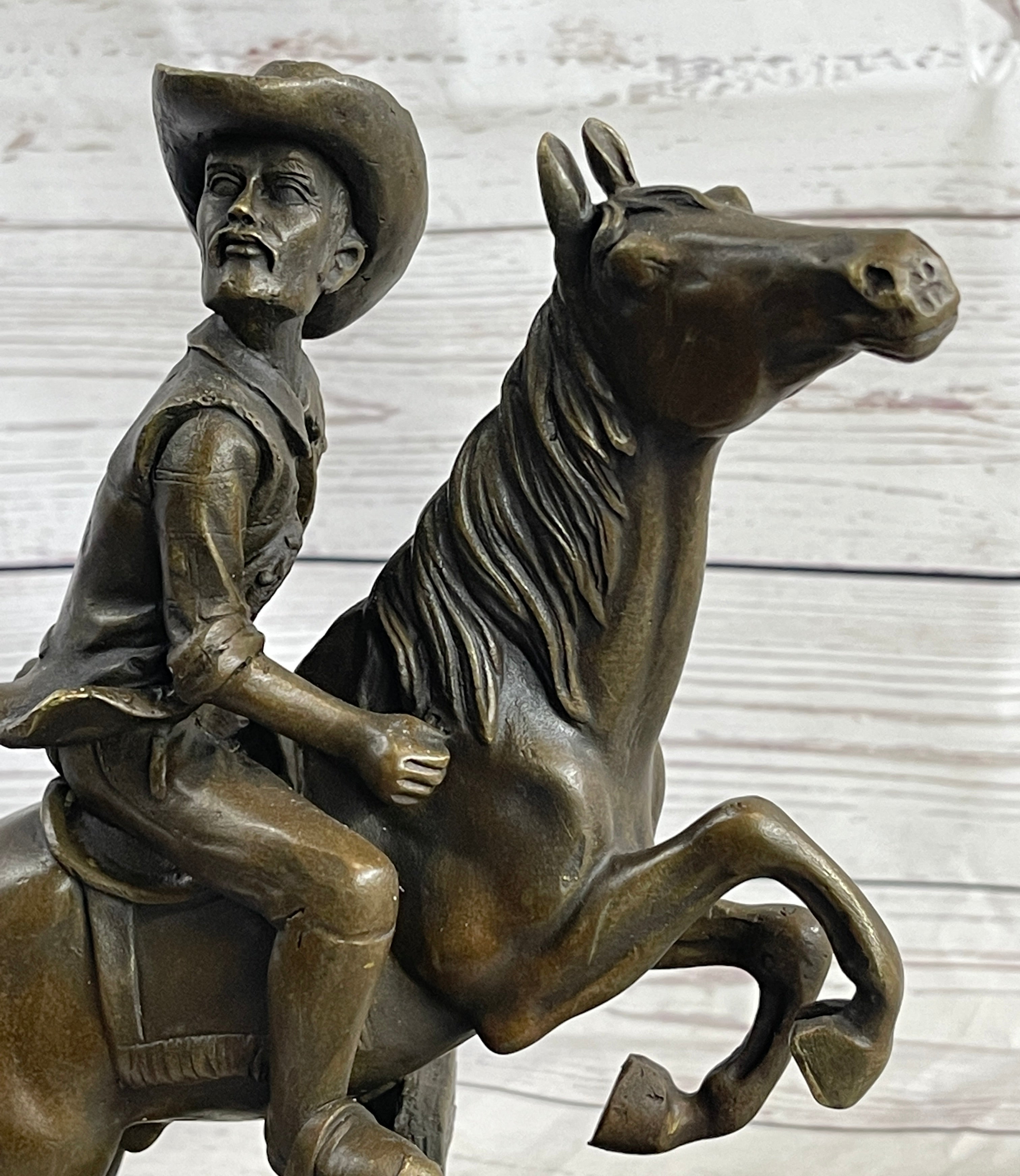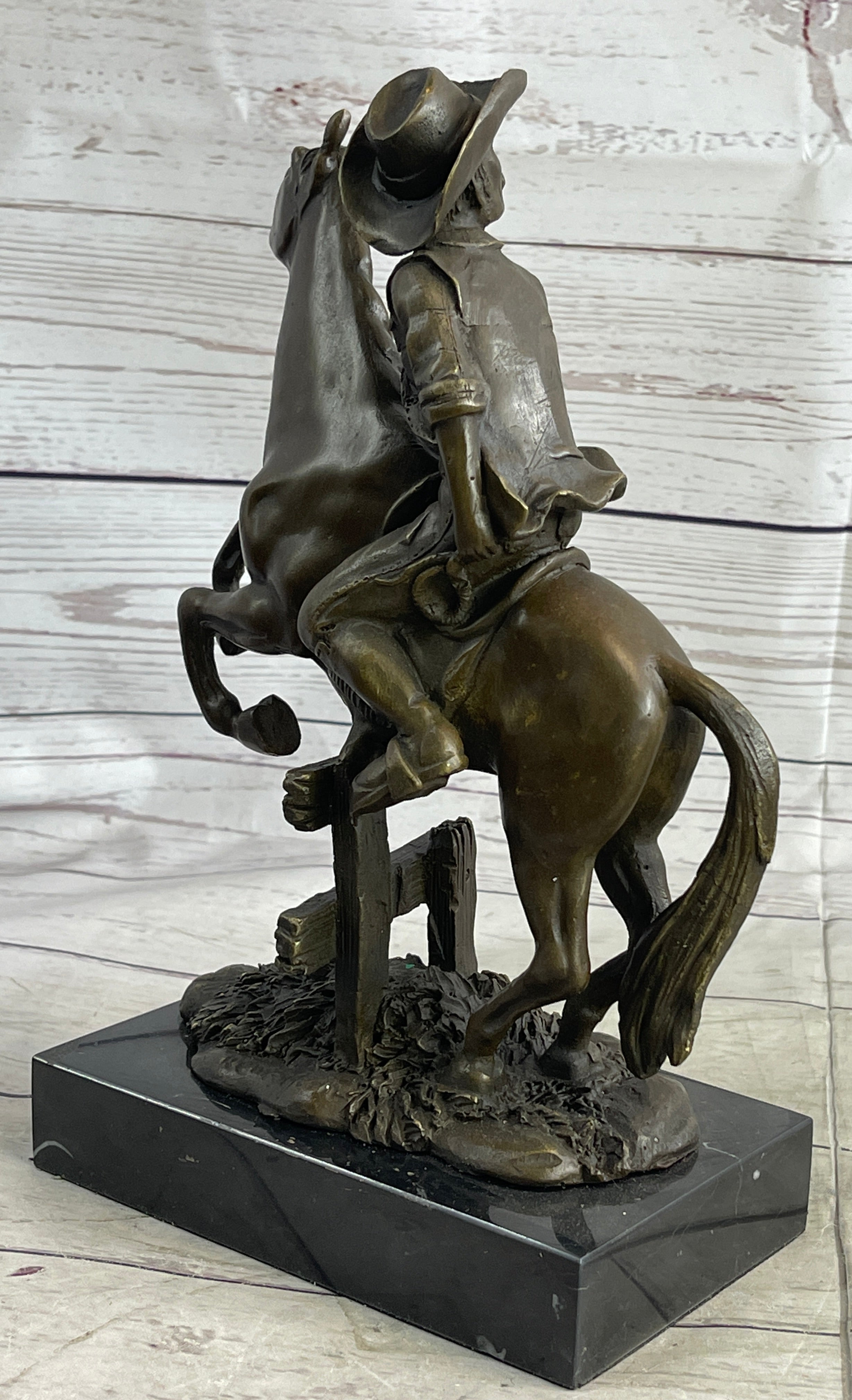 This dynamic bronze sculpture captures the untamed spirit of the American West, featuring a cowboy riding his horse at full speed through rugged terrain. With one hand gripping the reins and the other raised high, clutching a whip, the cowboy is poised for action. His traditional attire — wide-brimmed hat, chaps, and neckerchief — lends an air of authenticity and timeless western grit. The horse, powerful and alert, rears on its hind legs, ready to surge forward with unrelenting energy. The piece conveys raw motion and intensity, a moment frozen in bronze.