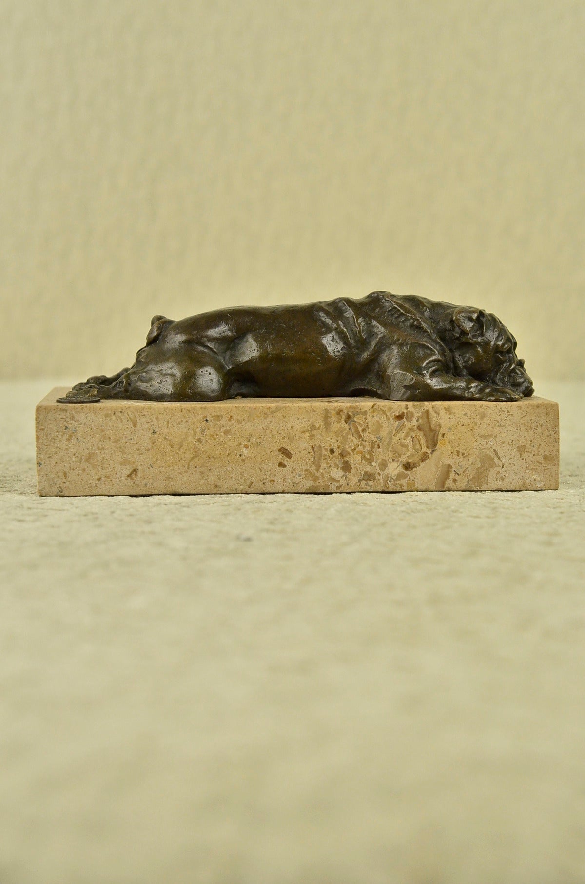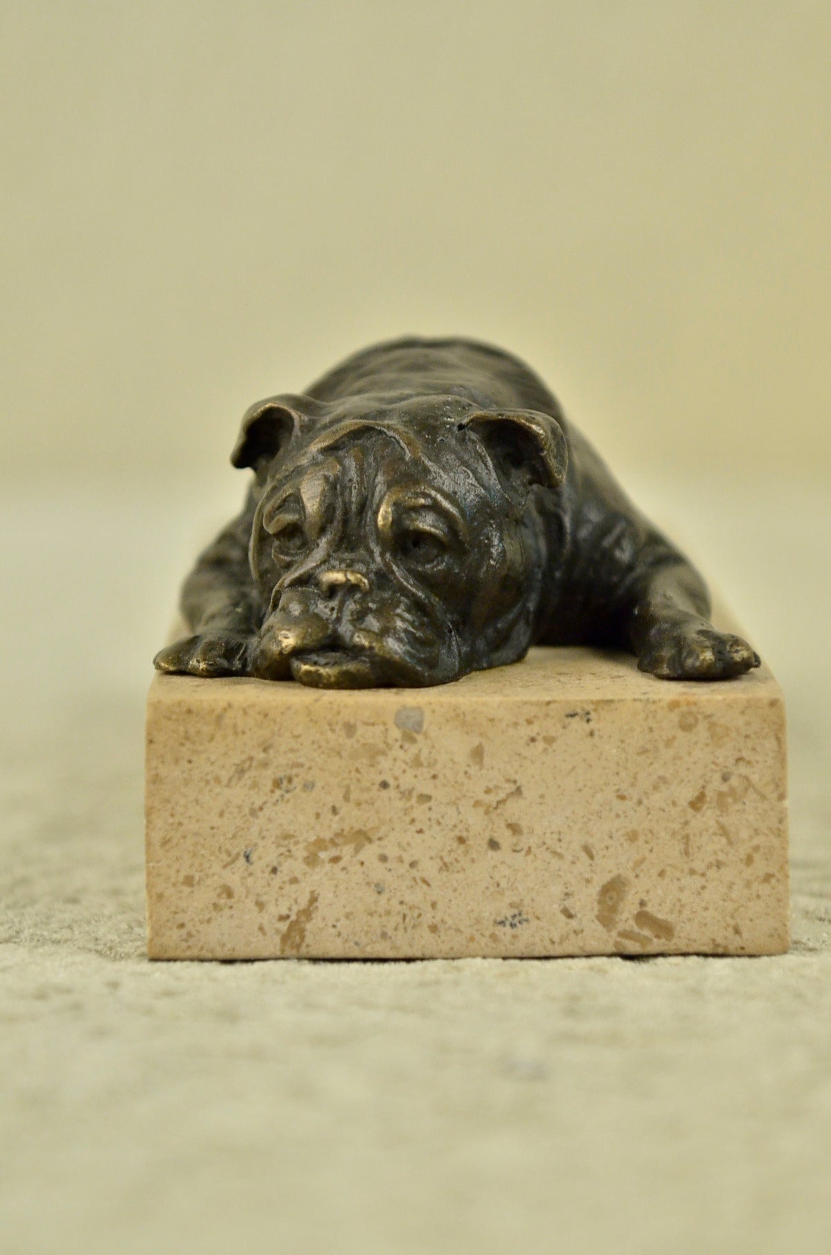 This adorable bronze sculpture shows the sweetest little bulldog lying on his belly sprawled out on the marble. With the cutest and very lifelike facial features this bronze is sure to add a touch of sweetness to your décor. You can see the folds of in his skin on his back as he lays down they look like a ripple effect in water. His short stubby paws are highlighted with bits of gold patina and so is his small curly tail. This is the perfect gift to give to the bulldog owner or lover in your life! This sculpture was cast using the "Lost Wax Method" and is mounted on a marble base. This sculpture is signed by the artist Nick.Original or Reproduction: Original