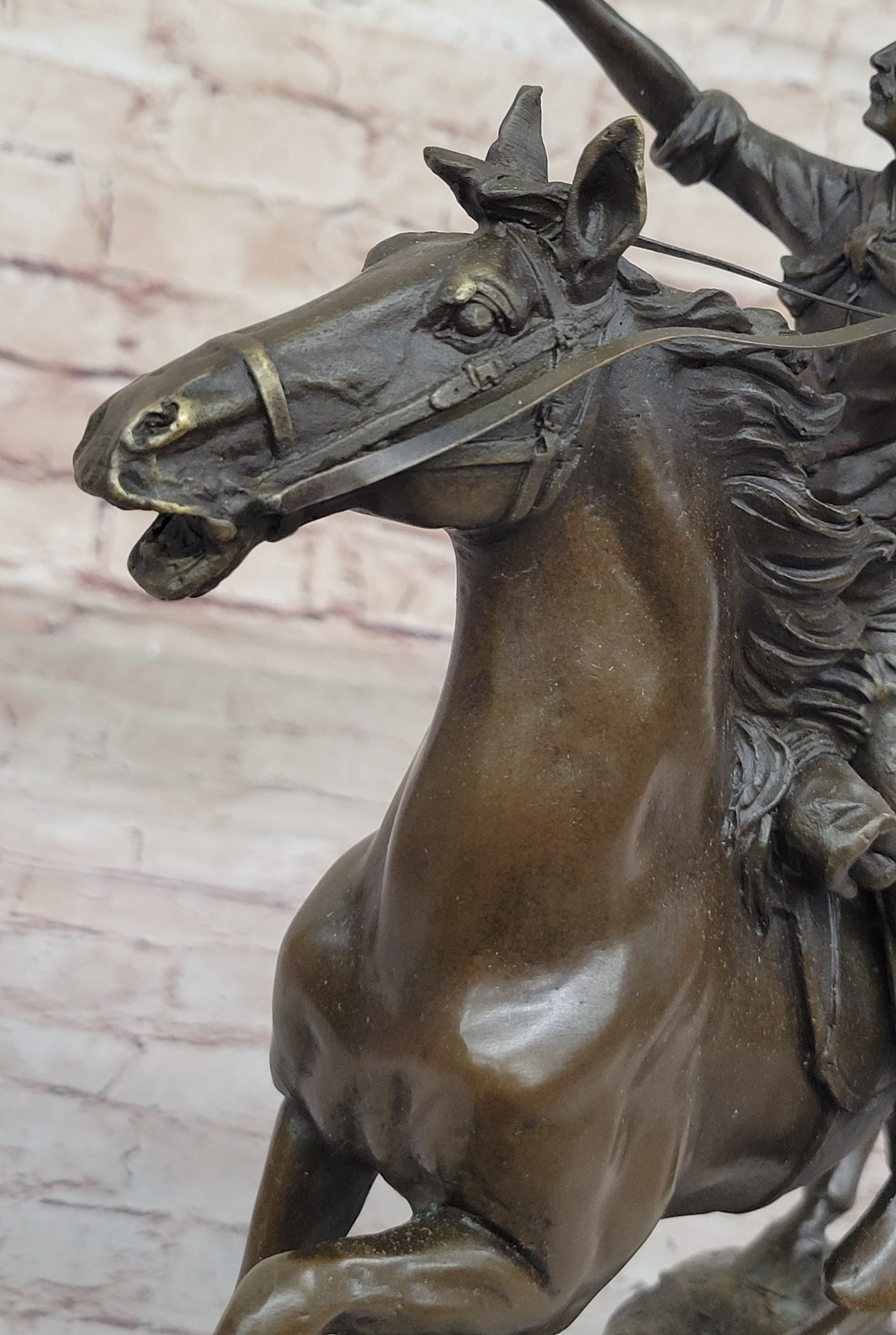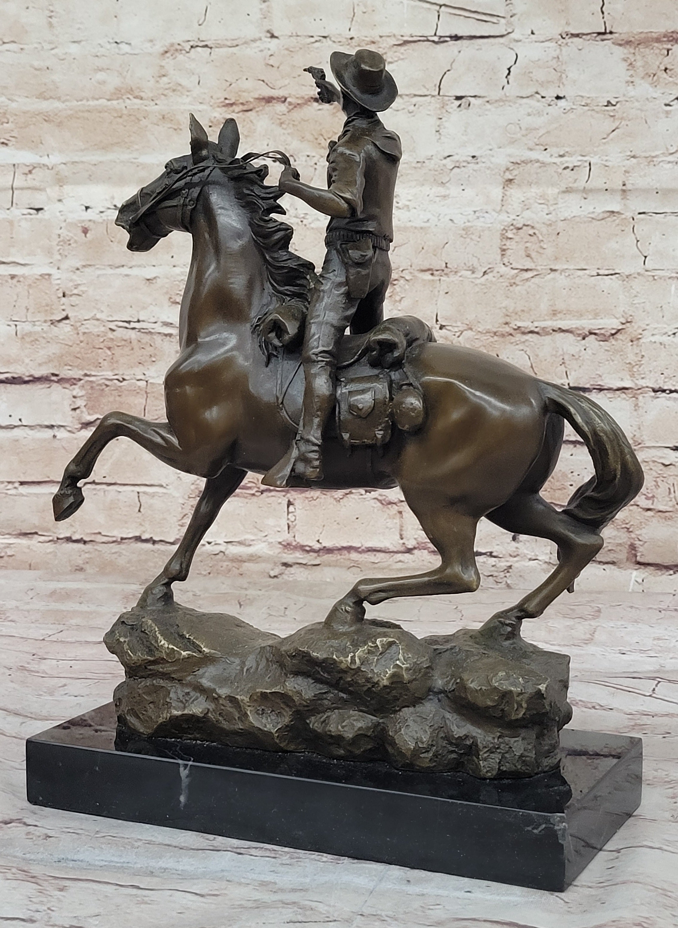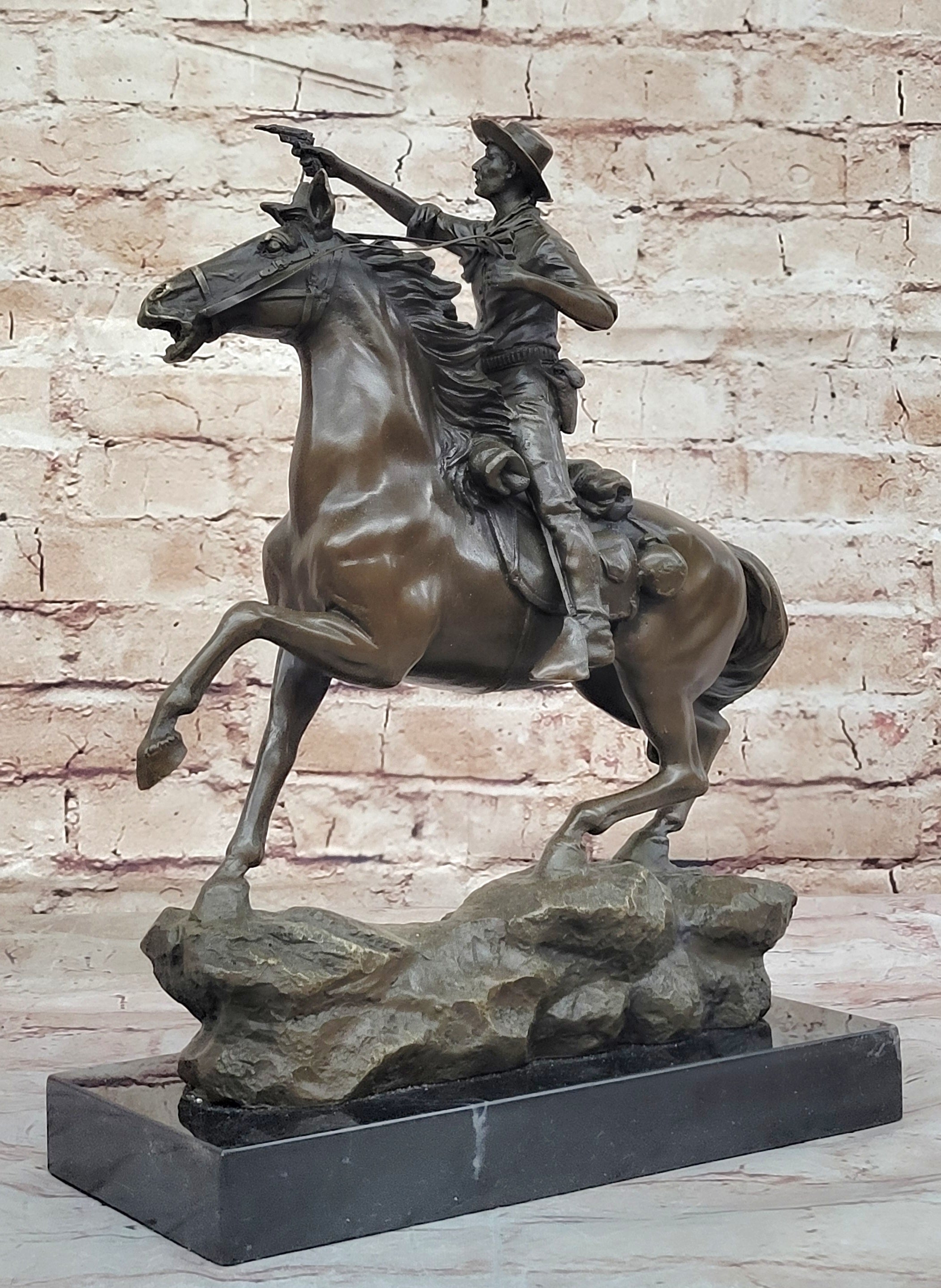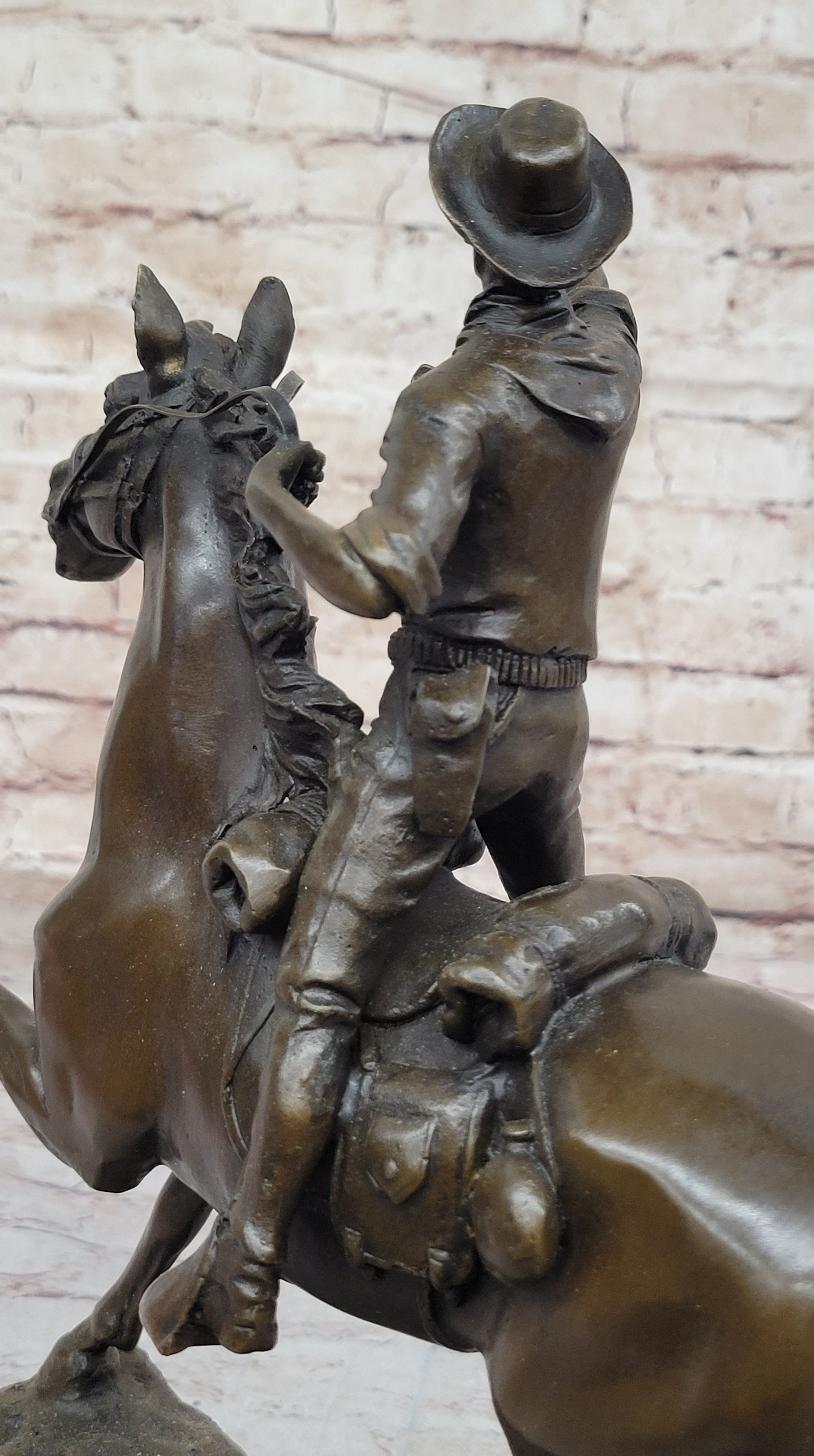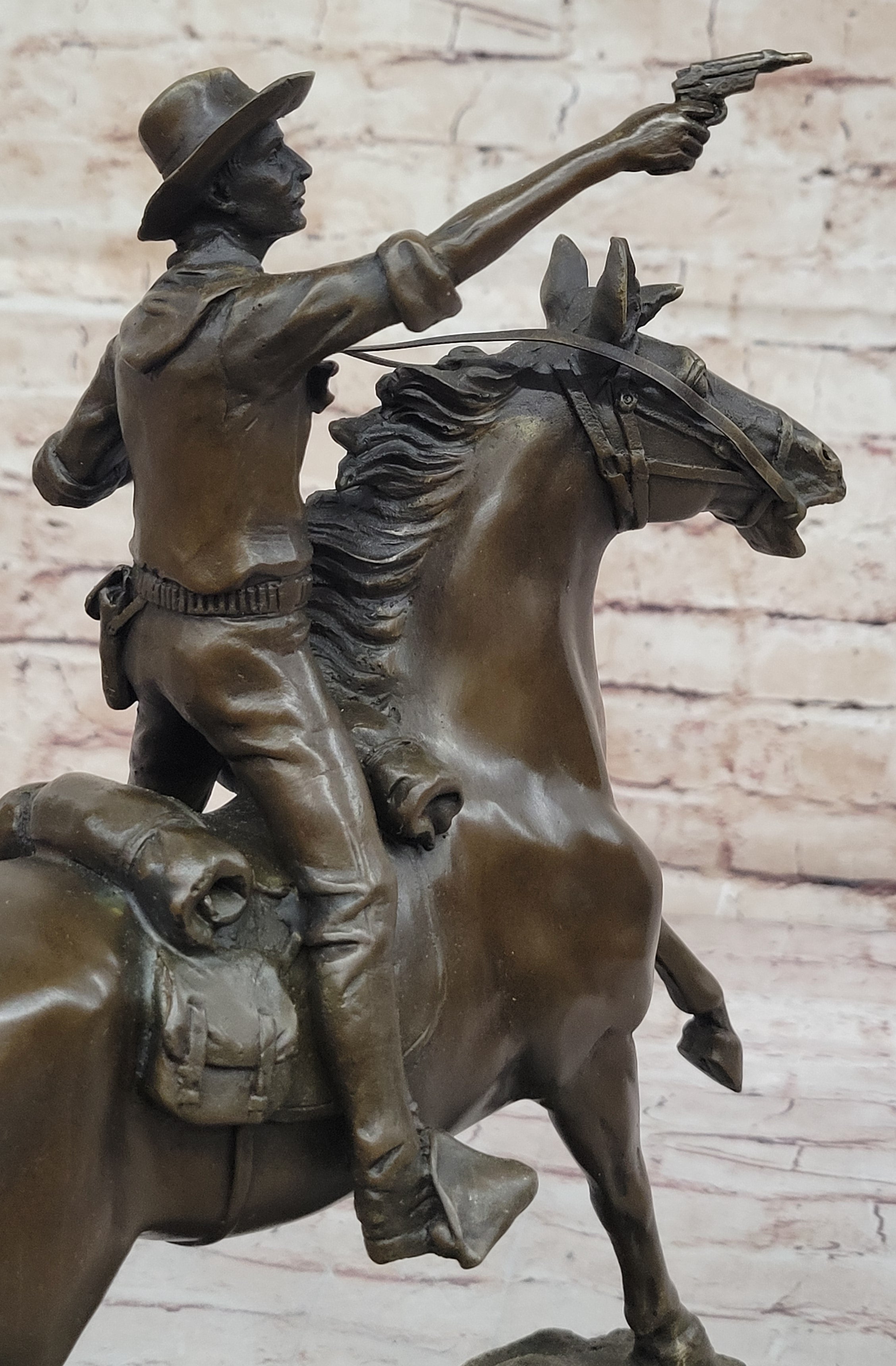 Whether displayed in a Western-themed collection or as a standalone statement piece, Karl Kauba's Cowboy on Horse Solid Bronze Sculpture invites you to relive the excitement of the Old West. This handcrafted masterpiece stands as a tribute to the artist's mastery and the timeless allure of Western art, making it a cherished addition to any art enthusiast's collection.Bronze Dimensions with Marble Base: Height 13.5" X Width 11"
