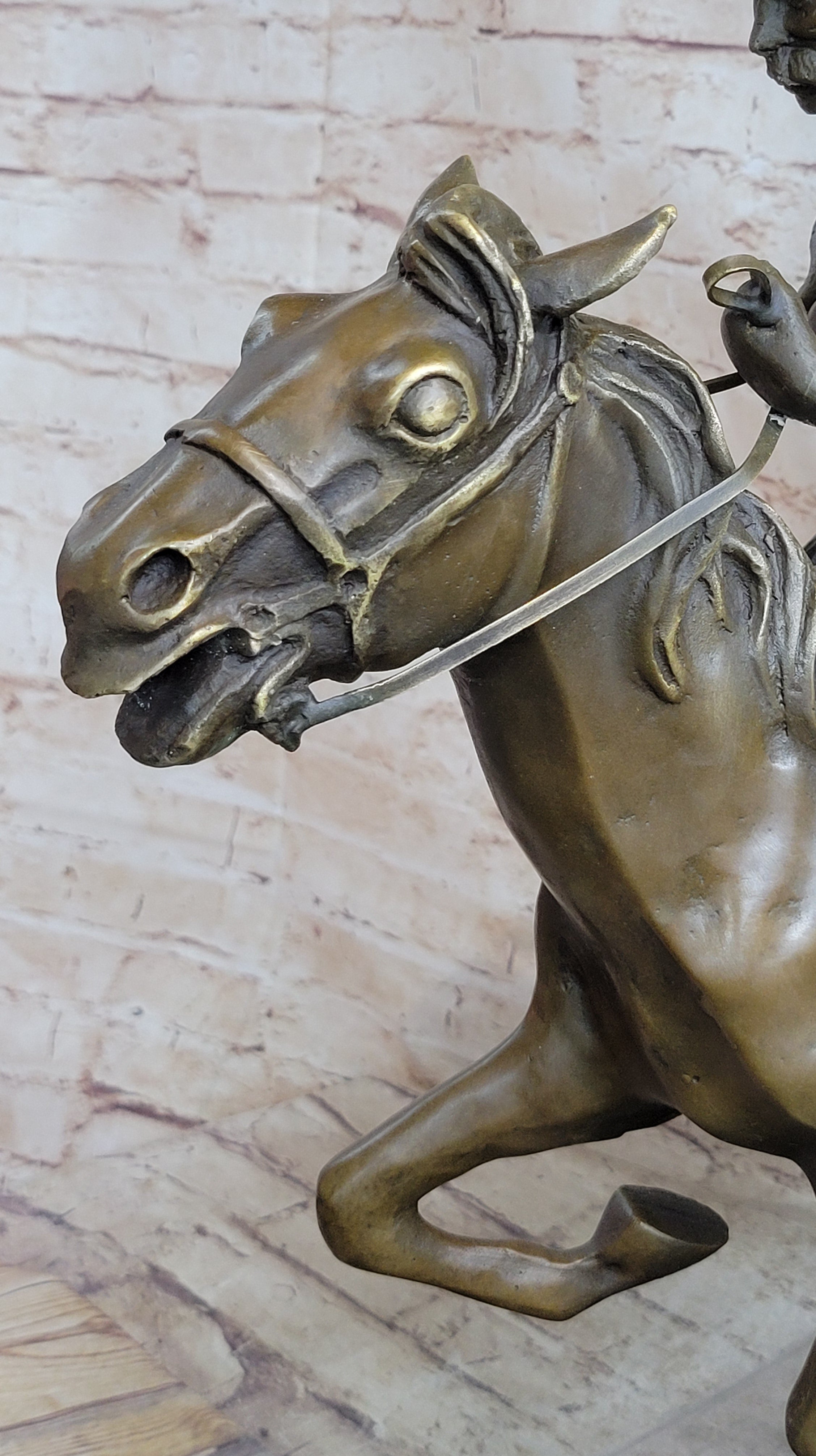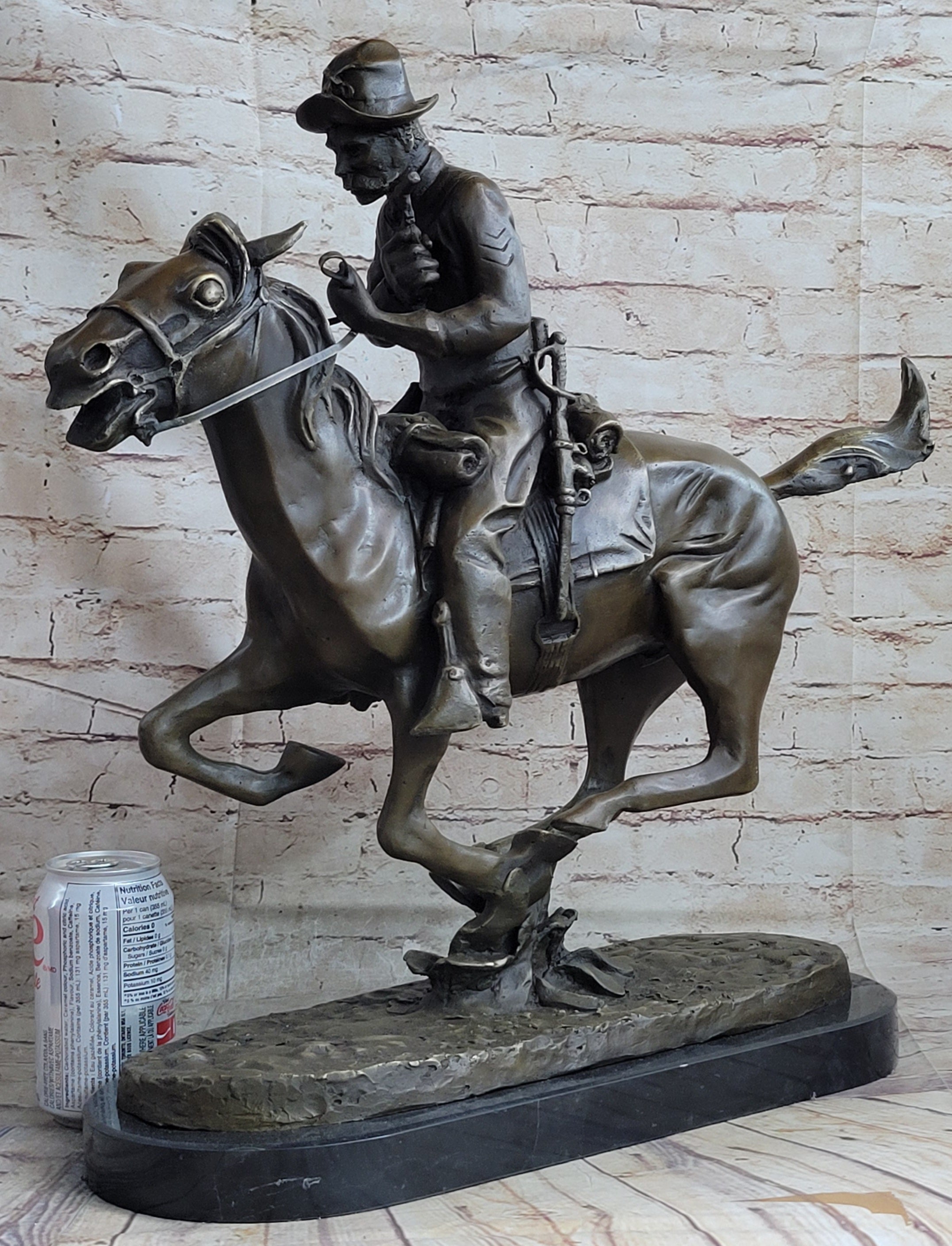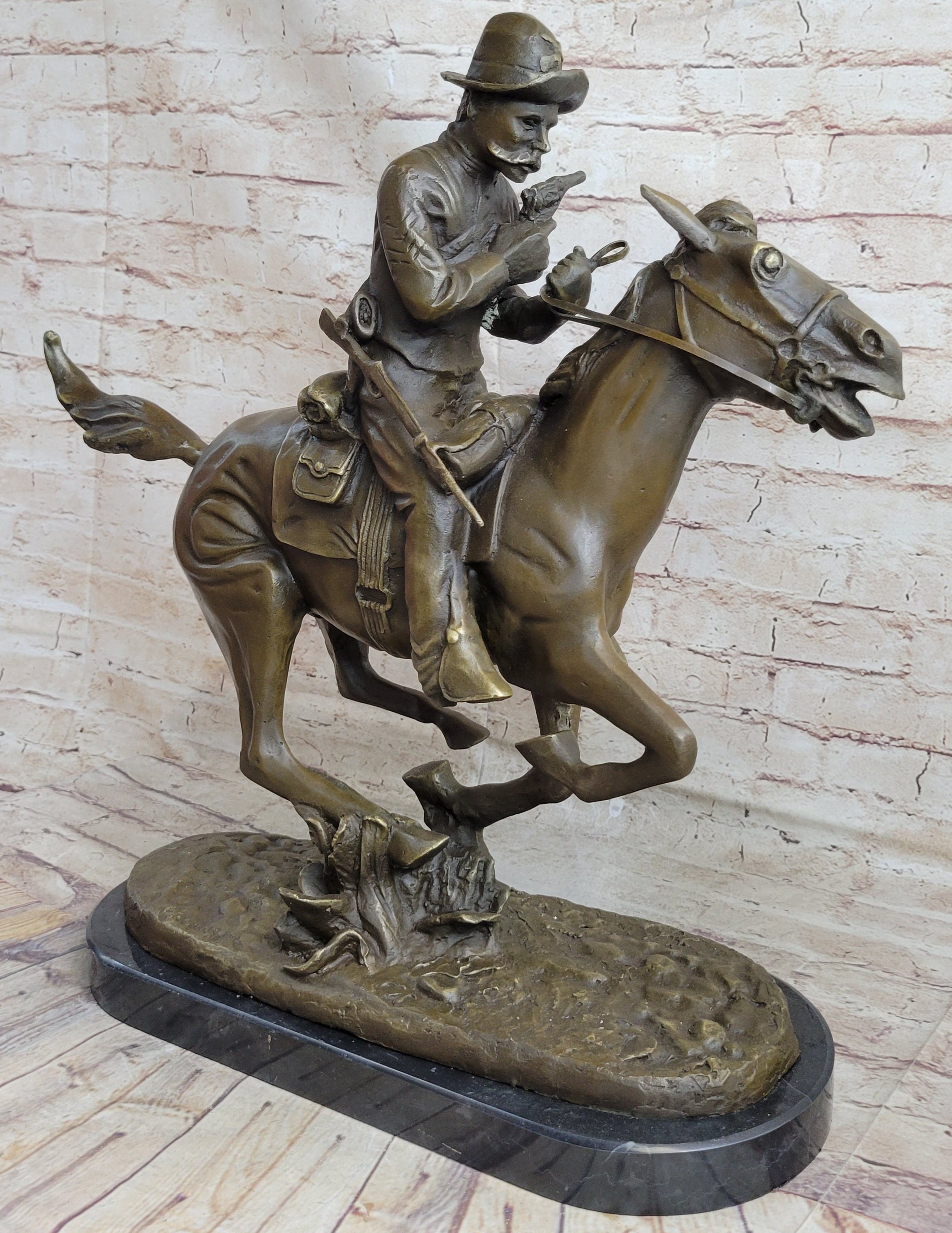 Capture the timeless beauty of Frederic Remington's iconic art with this exquisite bronze sculpture. Handmade with meticulous attention to detail, this 100% American bronze piece is cast using the traditional "Lost Wax Casting" process, ensuring exceptional quality and durability. The dark patina finish with hand-applied highlights adds depth and texture, creating a truly unique and captivating artwork. Each sculpture is individually hand-rubbed to enhance the intricate details, making it a one-of-a-kind masterpiece. Mounted on a stunning marble base, this reproduction statue bears the signature of Remington , paying homage to his artistic legacy.