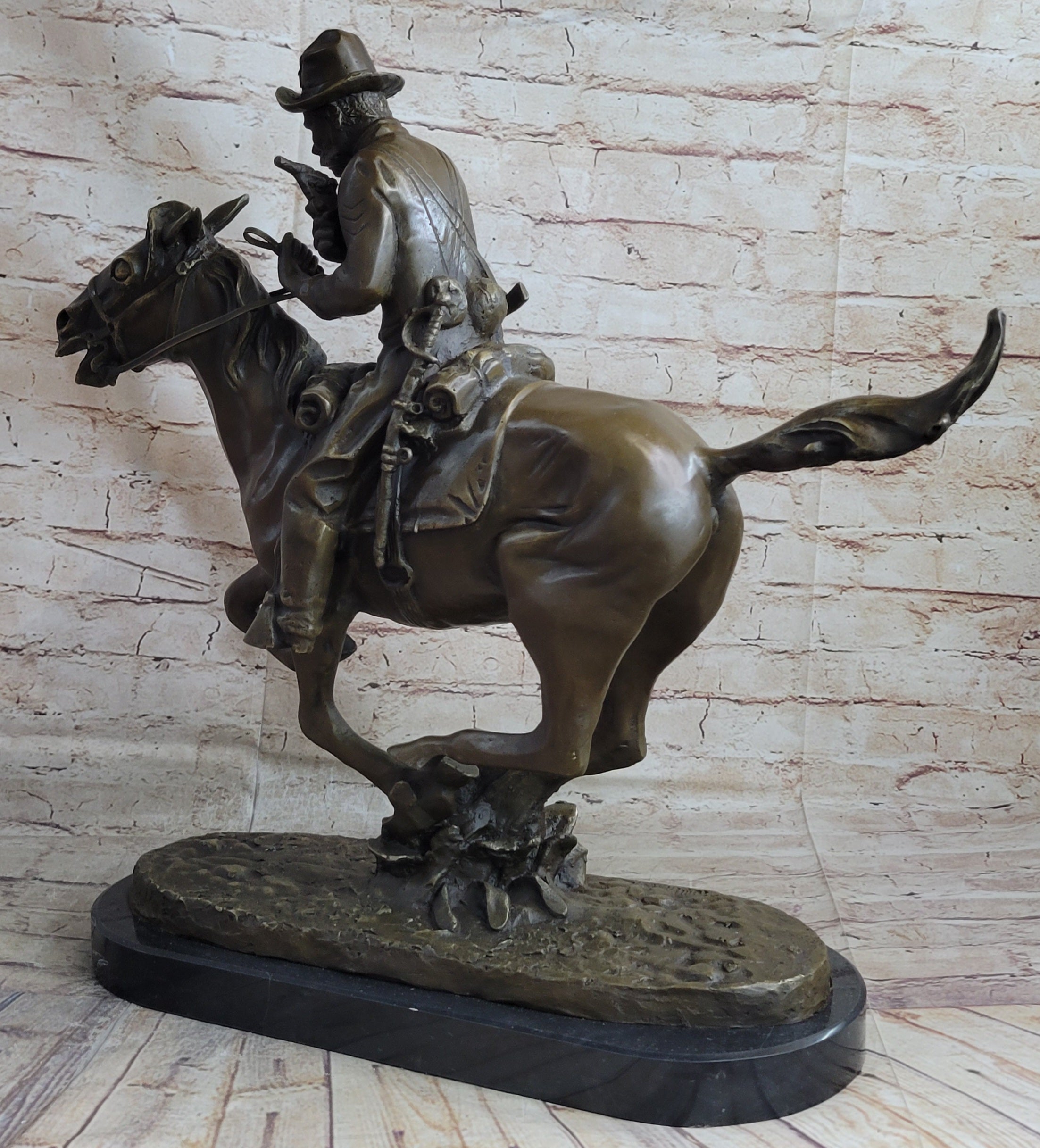Large Remington Tribute 2 Cowboy and Horse w Gun Bronze Sculpture Marble Statue