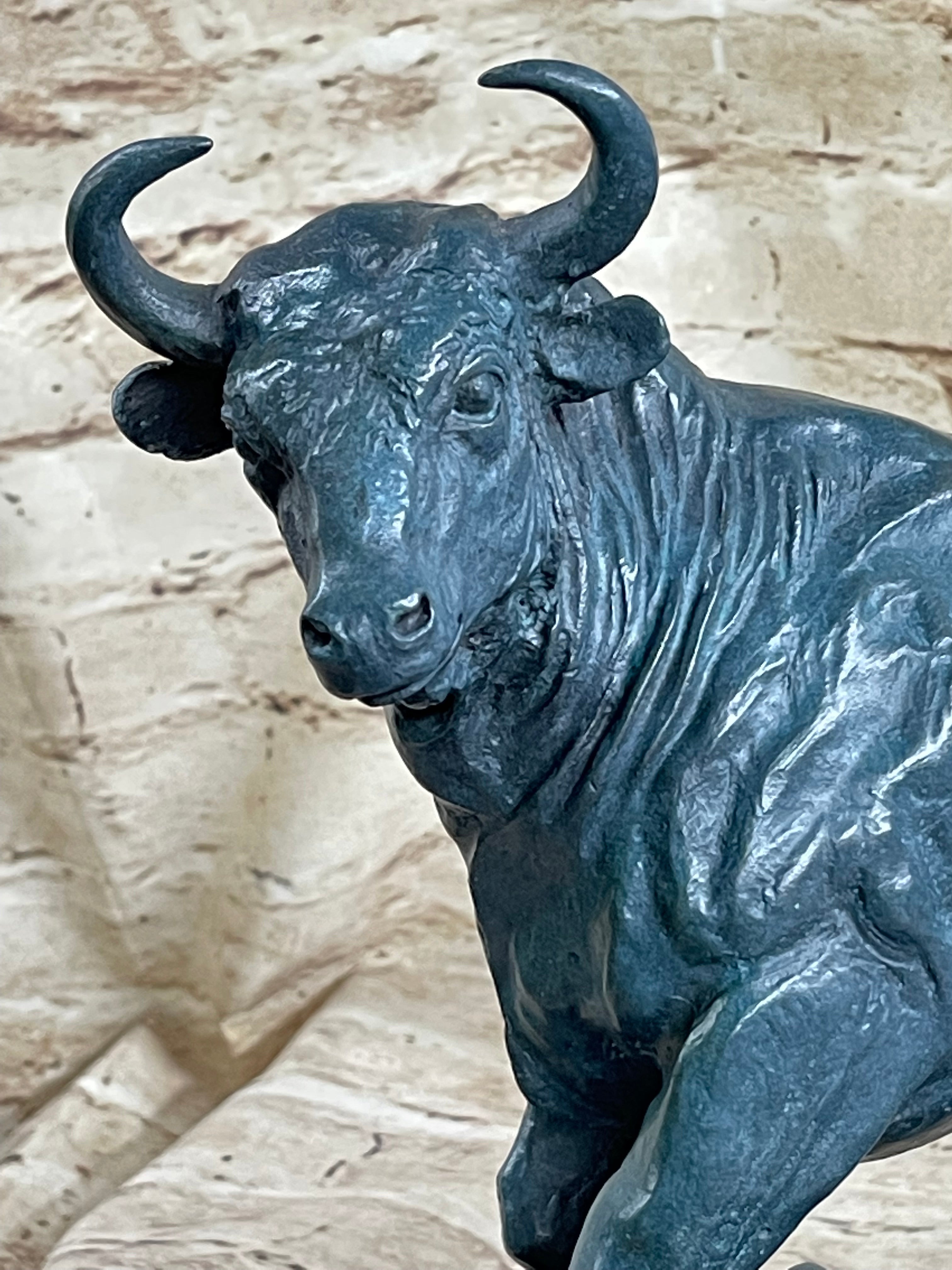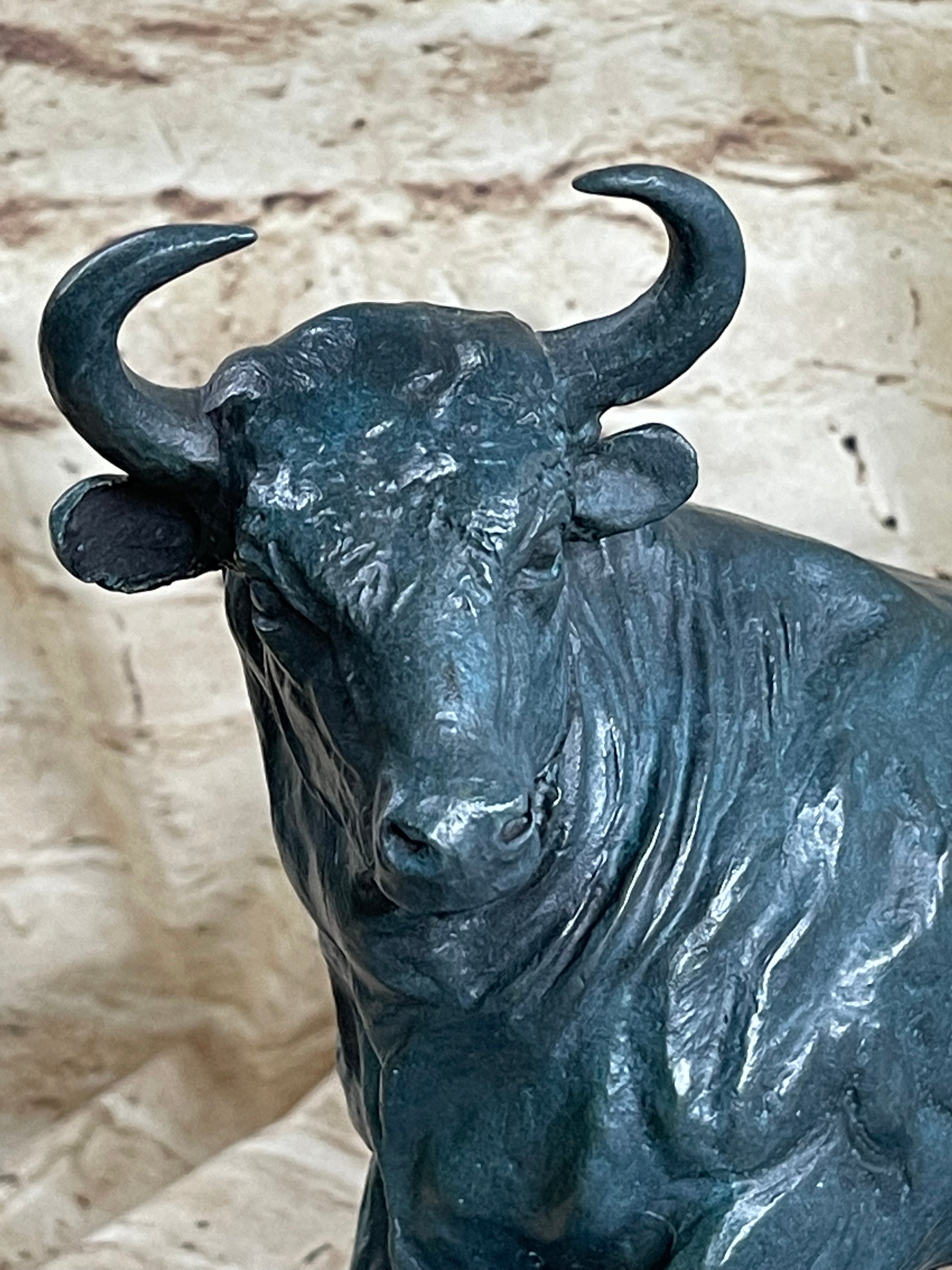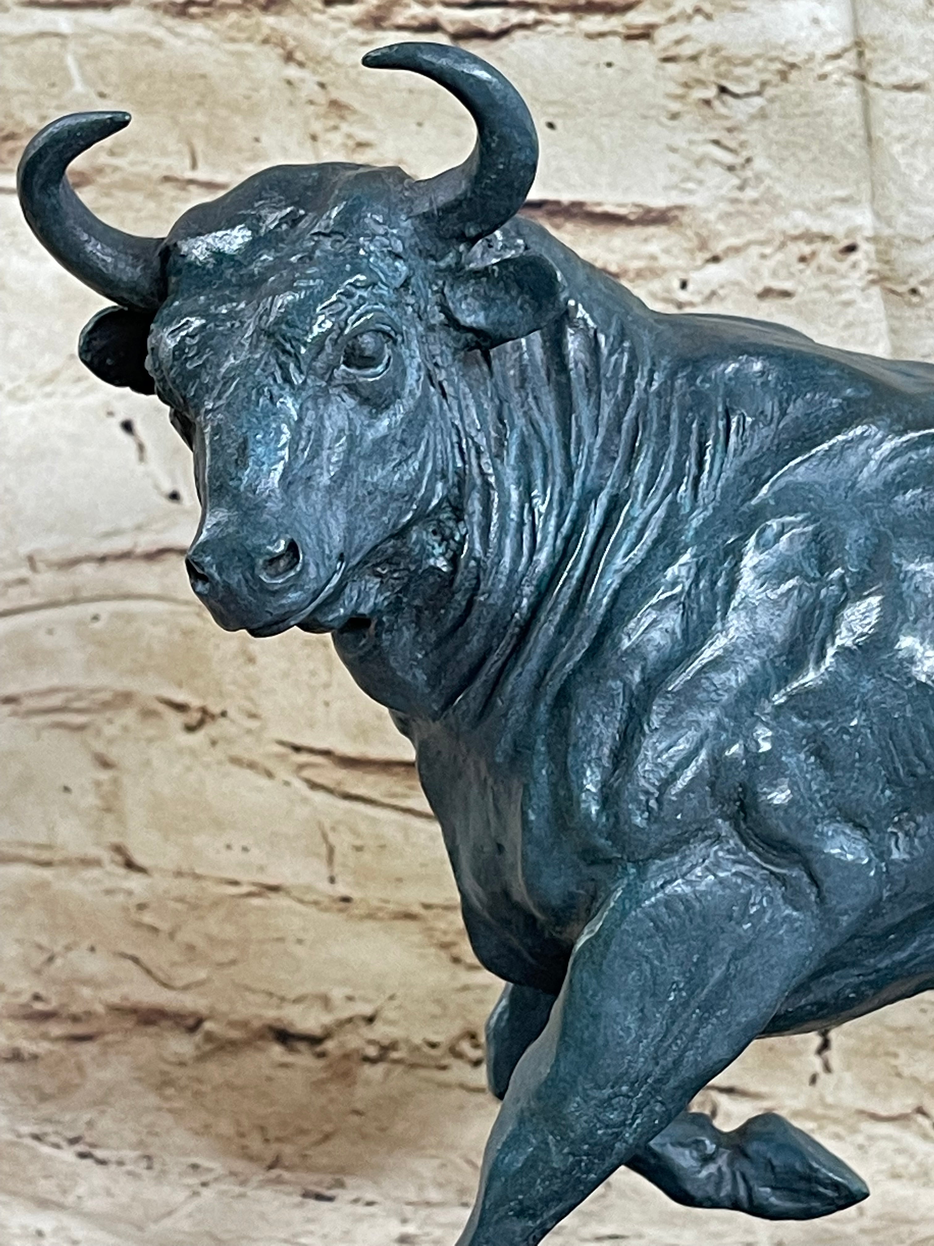 This magnificent sculpture portrays a large bull with a captivating green patina, frozen in motion as it hunts for its next target. With an unwavering gaze, once it sets its eyes on you, there is no deterring its determined charge. It digs its hooves into the ground, lowers its formidable horns, and barrels forward with unstoppable force.