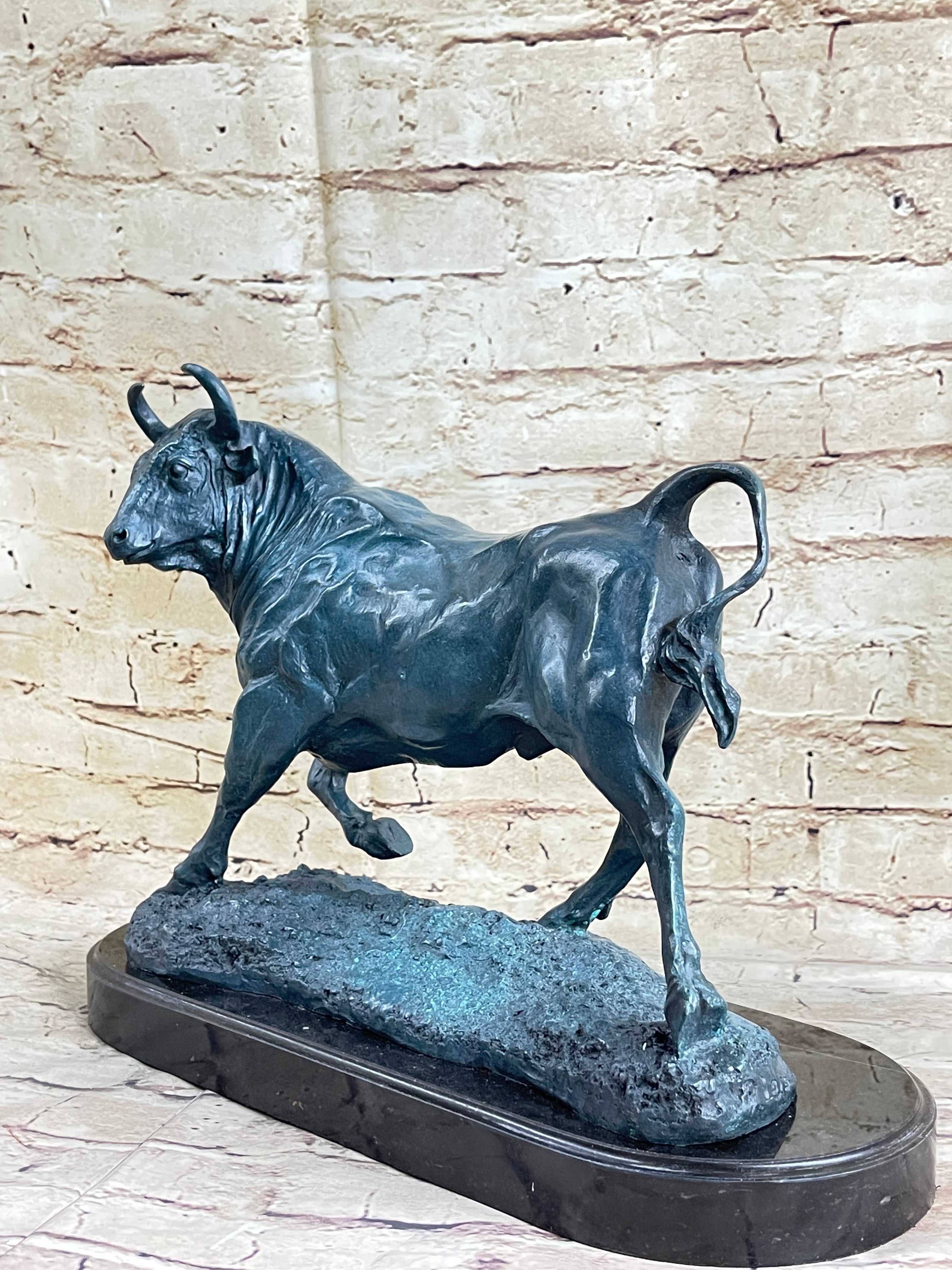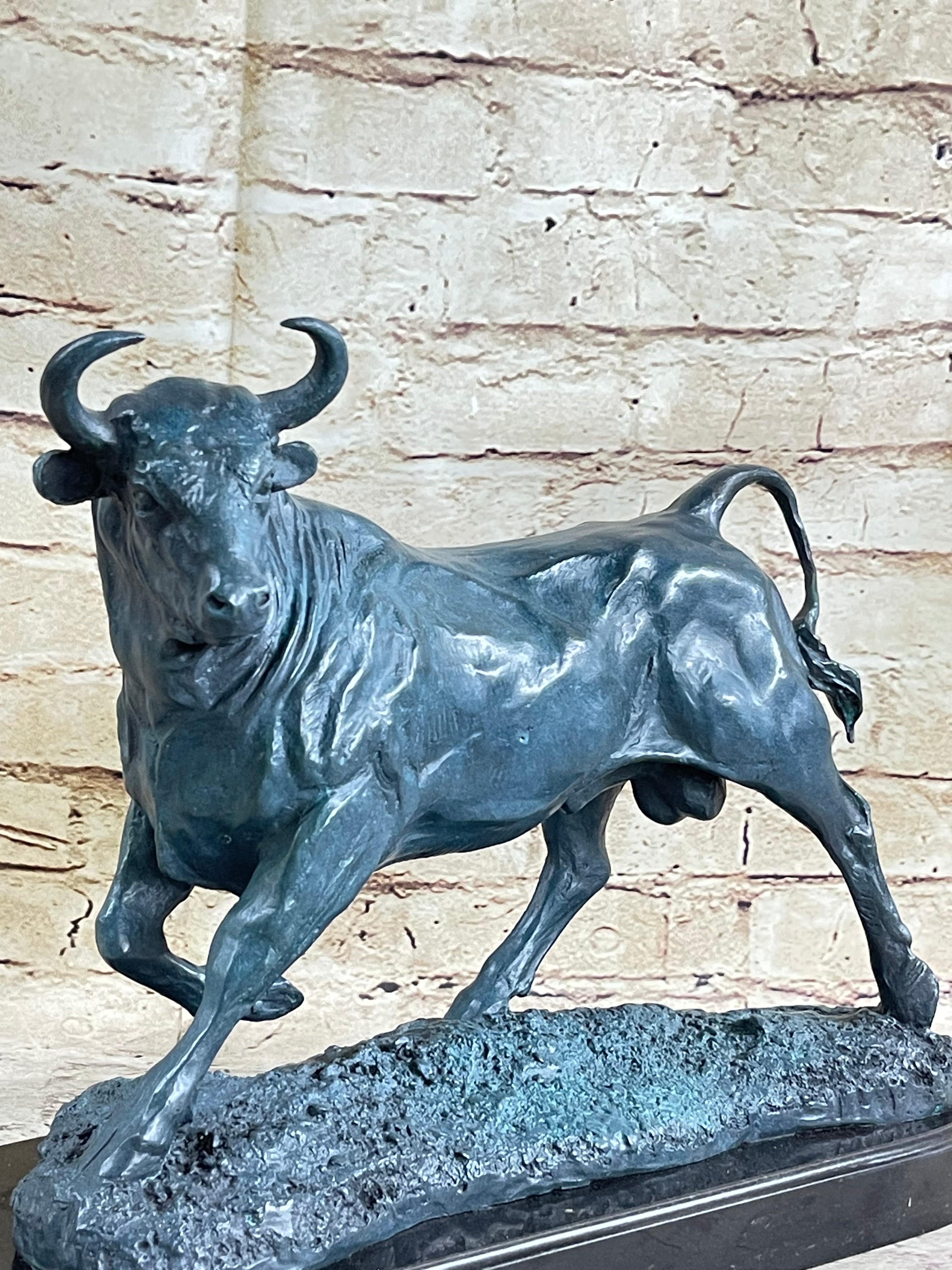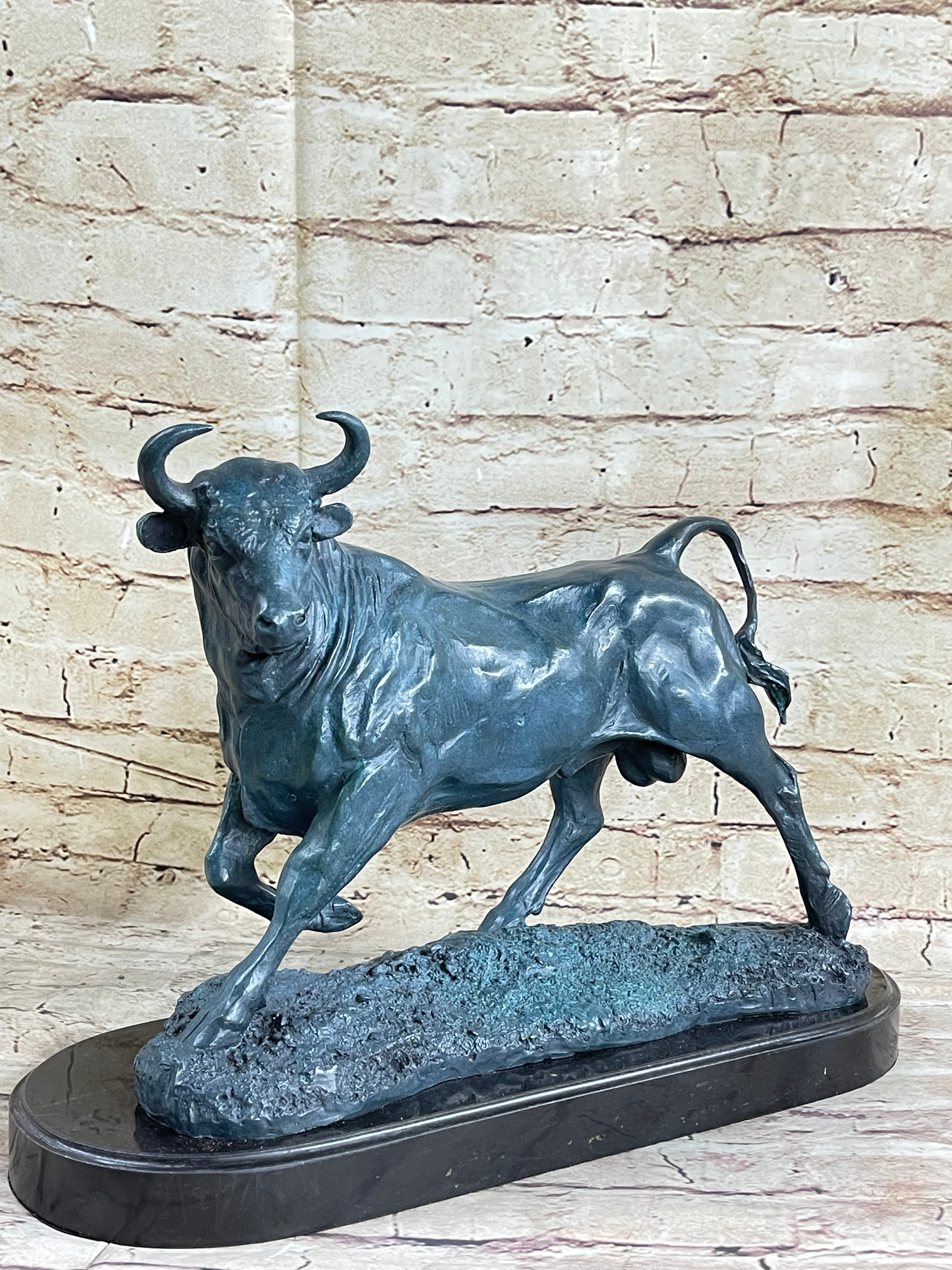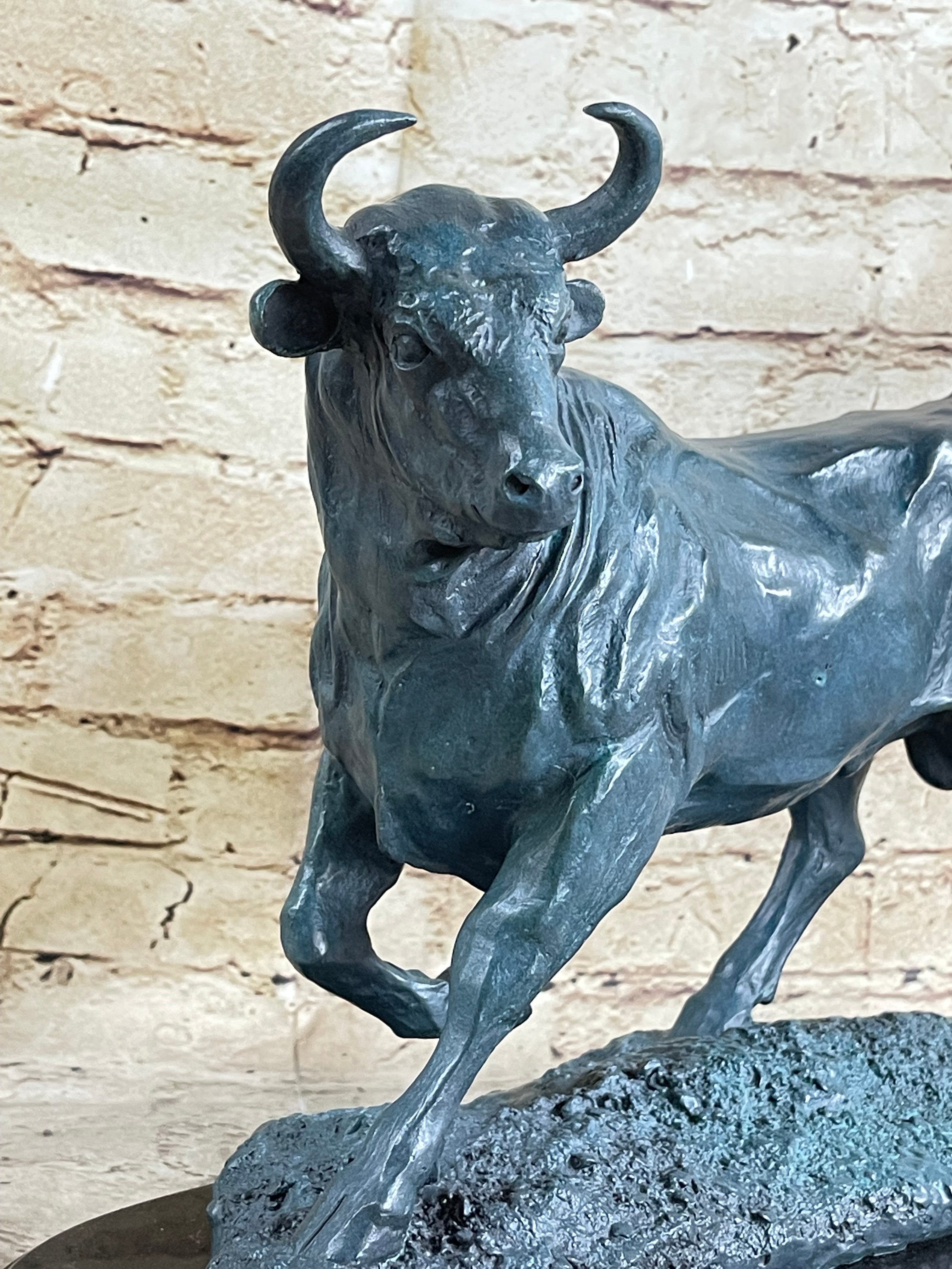 This magnificent sculpture portrays a large bull with a captivating green patina, frozen in motion as it hunts for its next target. With an unwavering gaze, once it sets its eyes on you, there is no deterring its determined charge. It digs its hooves into the ground, lowers its formidable horns, and barrels forward with unstoppable force.