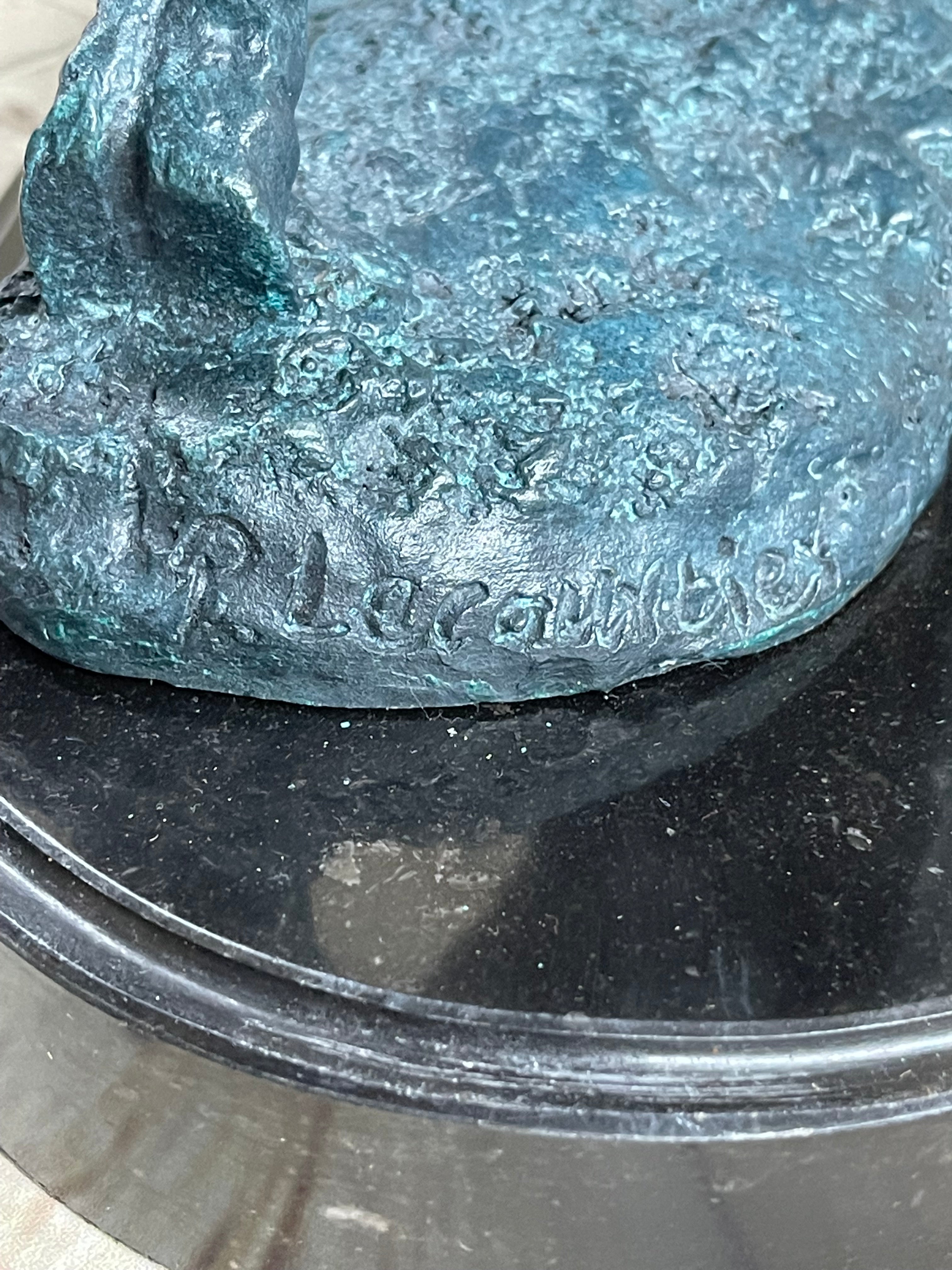 To elevate its presence, the sculpture is mounted on a round black marble base, providing stability and enhancing its visual impact. It is proudly signed by the esteemed artist, P. Lecourtier, attesting to its quality and craftsmanship.