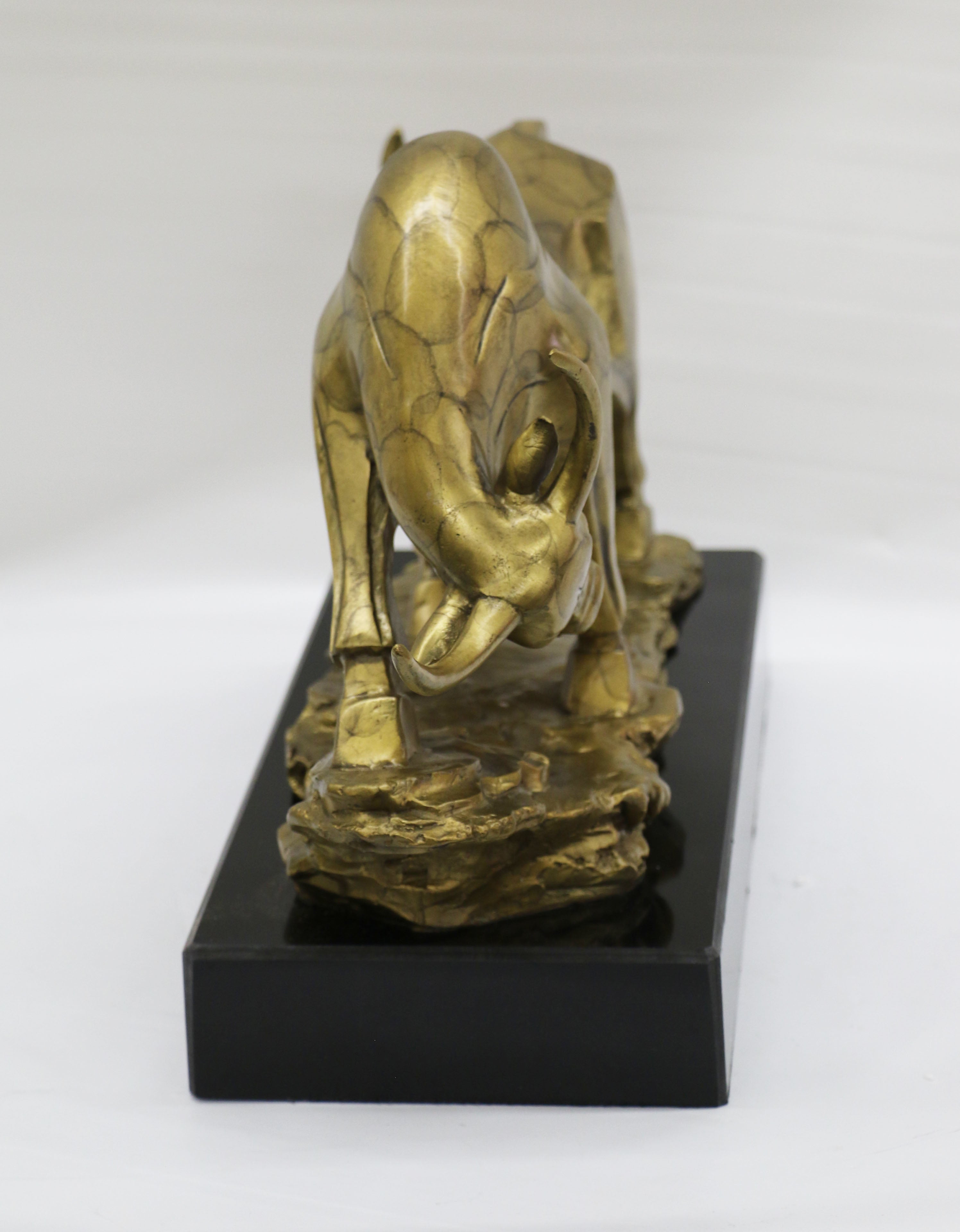 This Limited Edition bronze sculpture depicts a wall street Bull. He bends down keeping his hind legs on high dry ground just in case anything decides to attack or he needs to get out of the lake in a jiffy. His horns are majestic and his face is furious. This bronze sculpture was cast using the “Lost Wax Method” and has a multi color Gilt patina. It is mounted on a marble base and is handmade. This Limited Edition sculpture is signed and numbered by artist Miguel Lopez.Bronze Dimensions with Marble Base:Height 11.5" x Width 18"