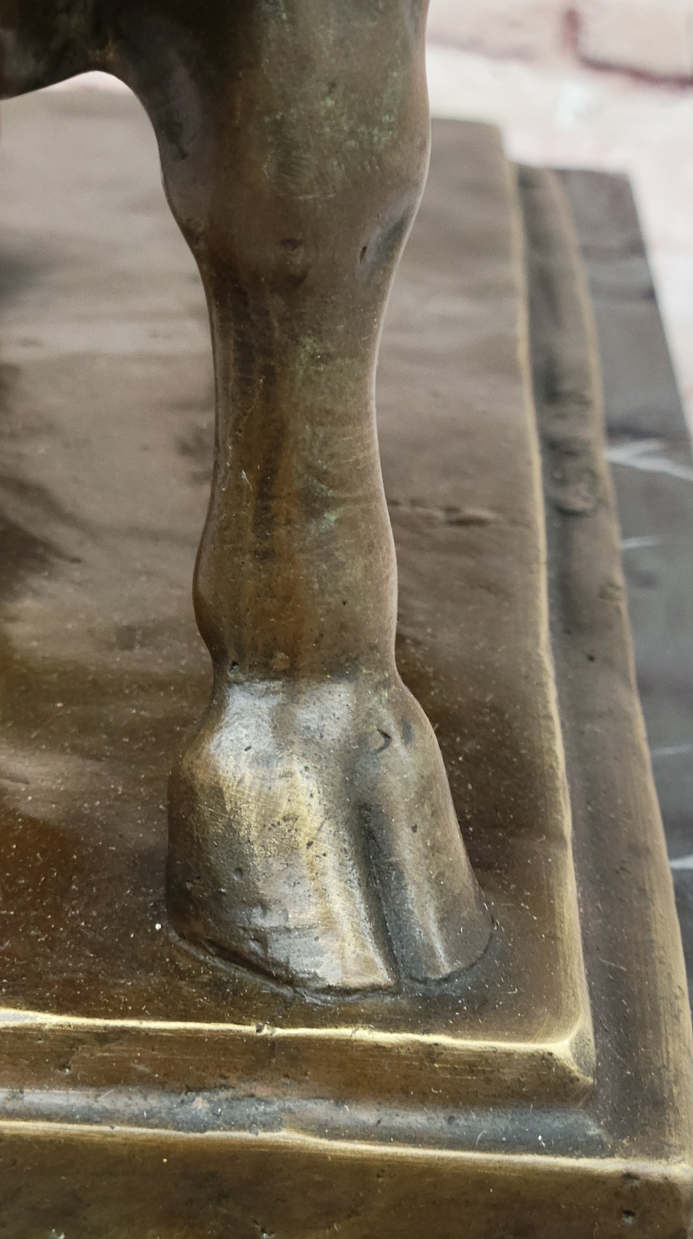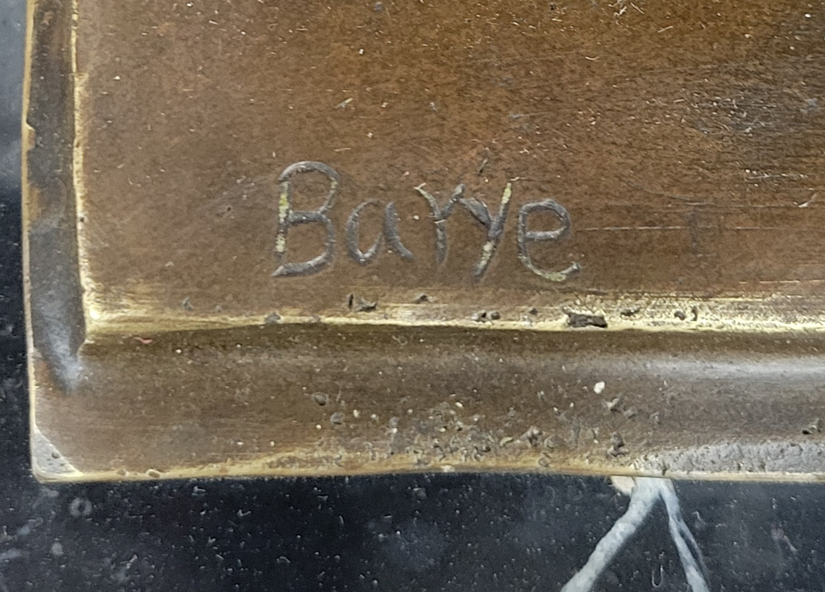 Signed by the renowned French artist Barye, this 100% bronze sculpture is a true work of art, showcasing the artist’s mastery of form and texture. Whether displayed in a home, office, or gallery, it will be a lasting testament to the beauty and majesty of the animal kingdom.Bronze Dimensions with Marble Base: Height 13" X Width 19"