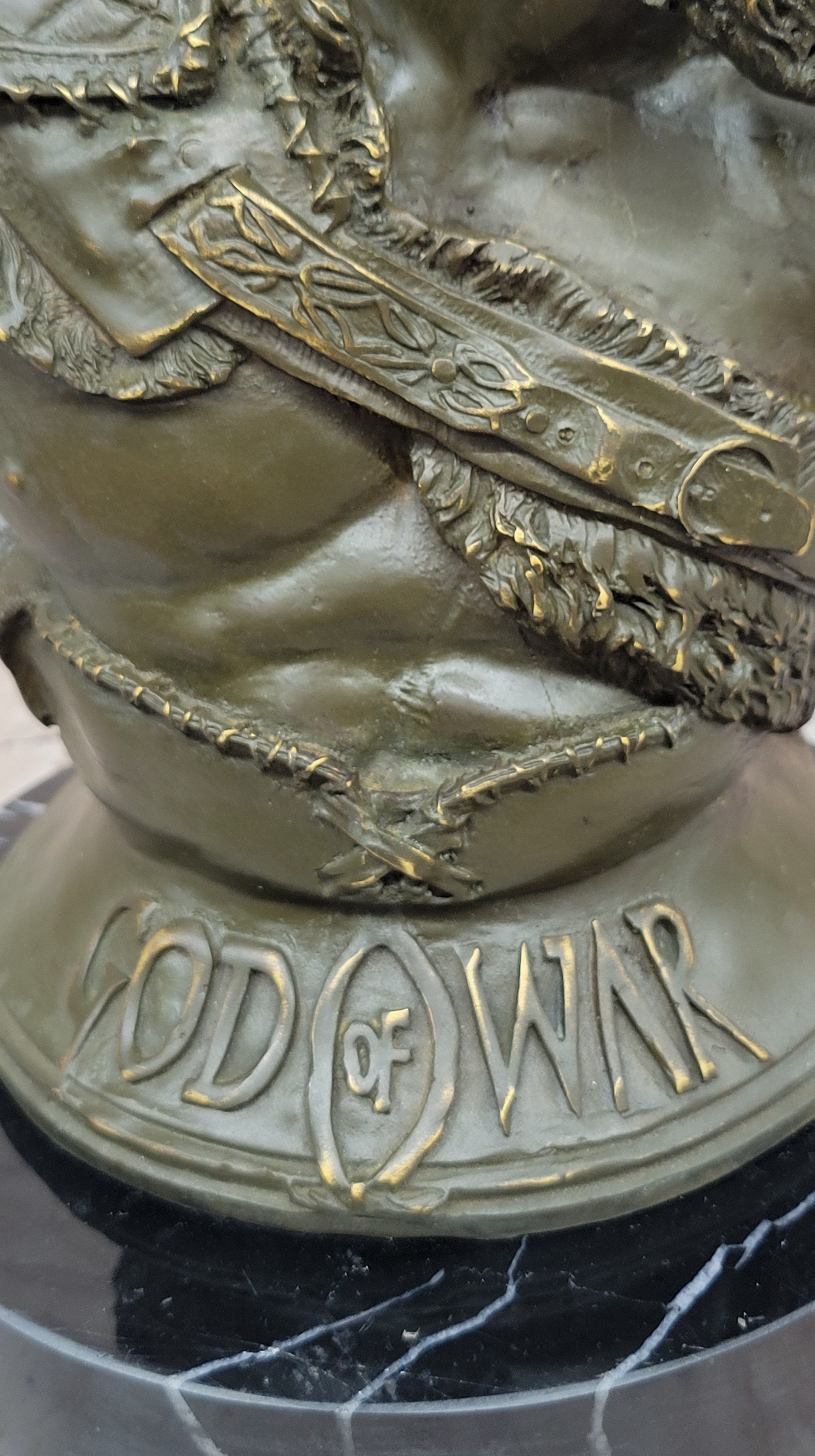 Mounted on a round black marble base, this piece offers both stability and sophistication, making it an exceptional collectible for fans of mythology, video game art, or fine bronze sculpture. A true conversation starter and centerpiece, this signed Kratos bust stands as a tribute to power, vengeance, and timeless storytelling.Bronze Dimensions with Marble Base: Height 12" X Width 8"