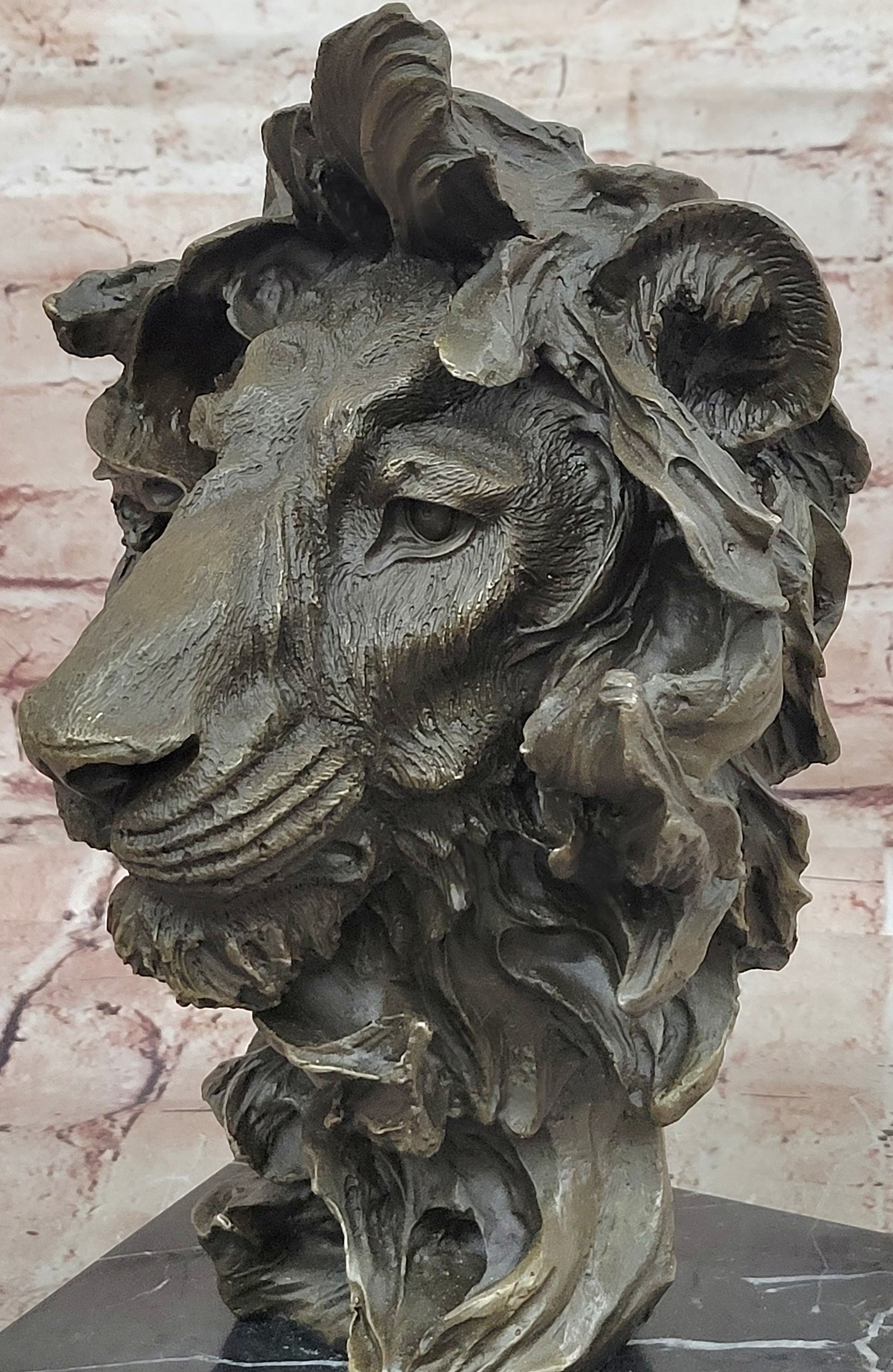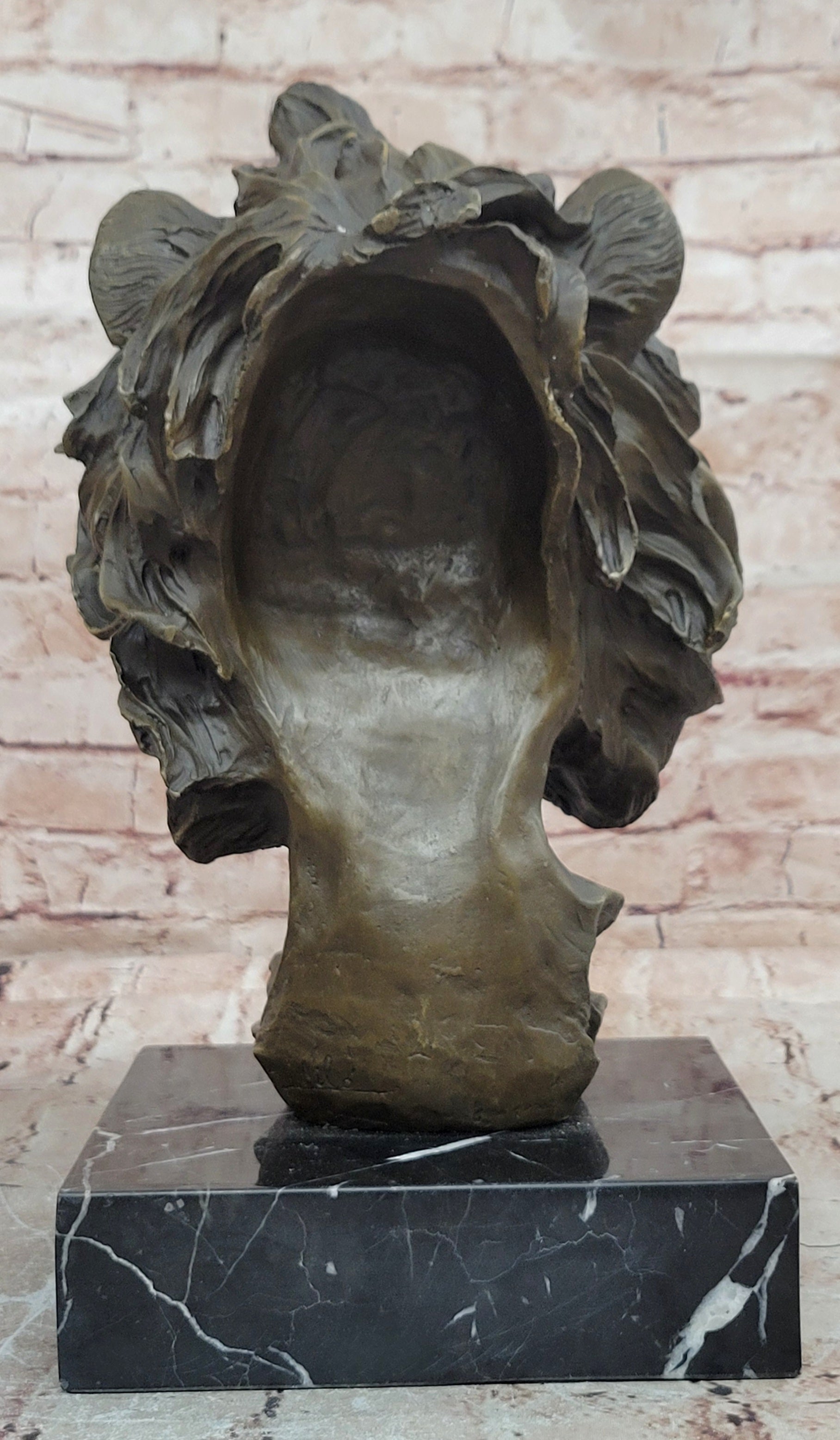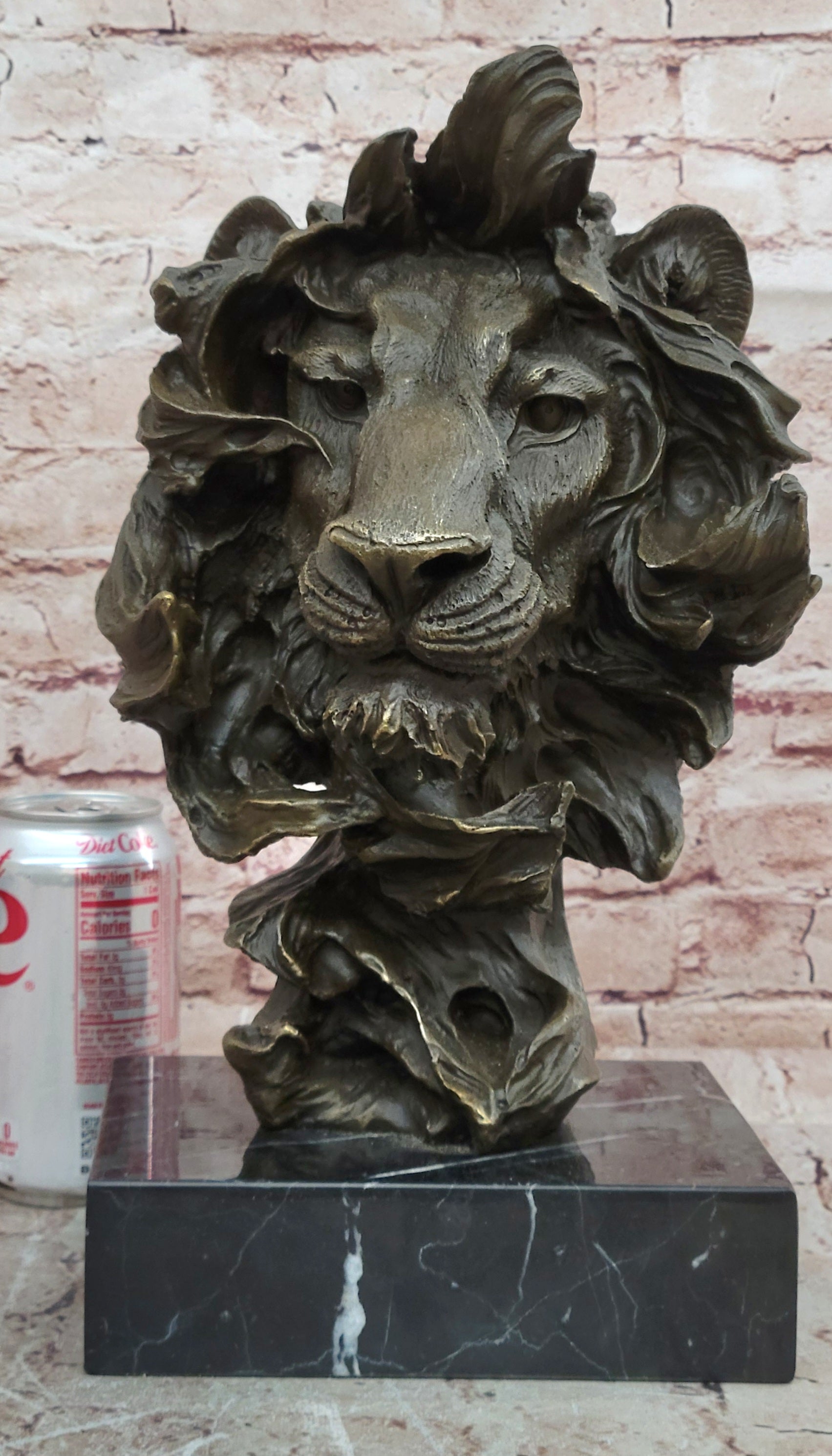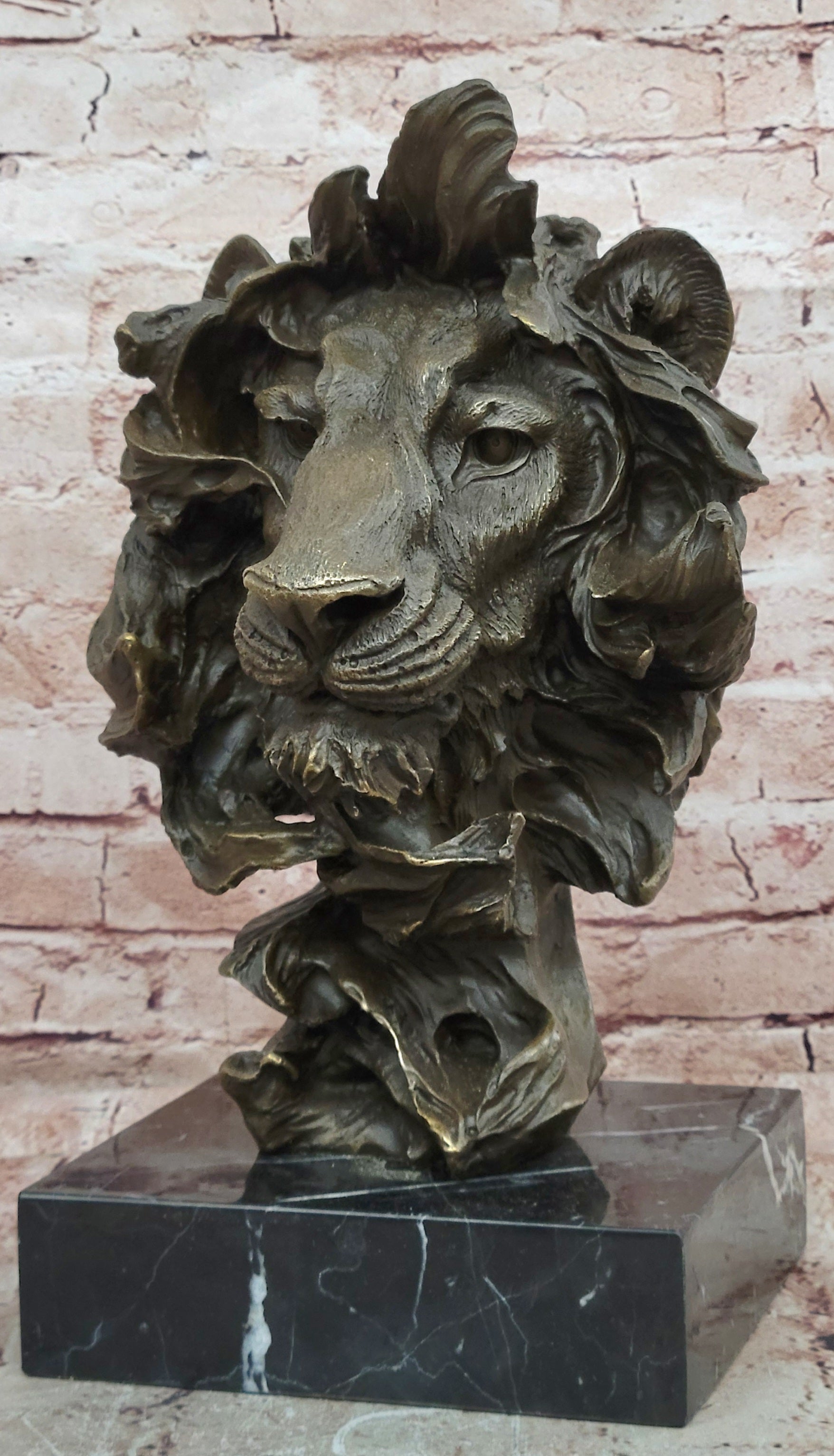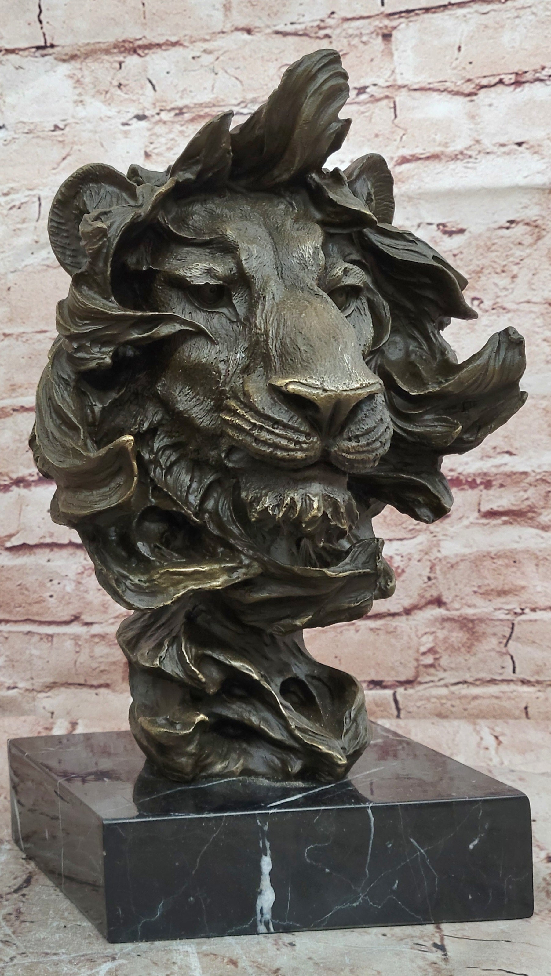Hand made using the traditional lost wax casting method, this sculpture is crafted in genuine bronze, ensuring durability and fine detail. A rich brown patina enhances the depth and character of the lion’s features, while the piece is mounted on a polished black marble base, adding contrast and elegance.