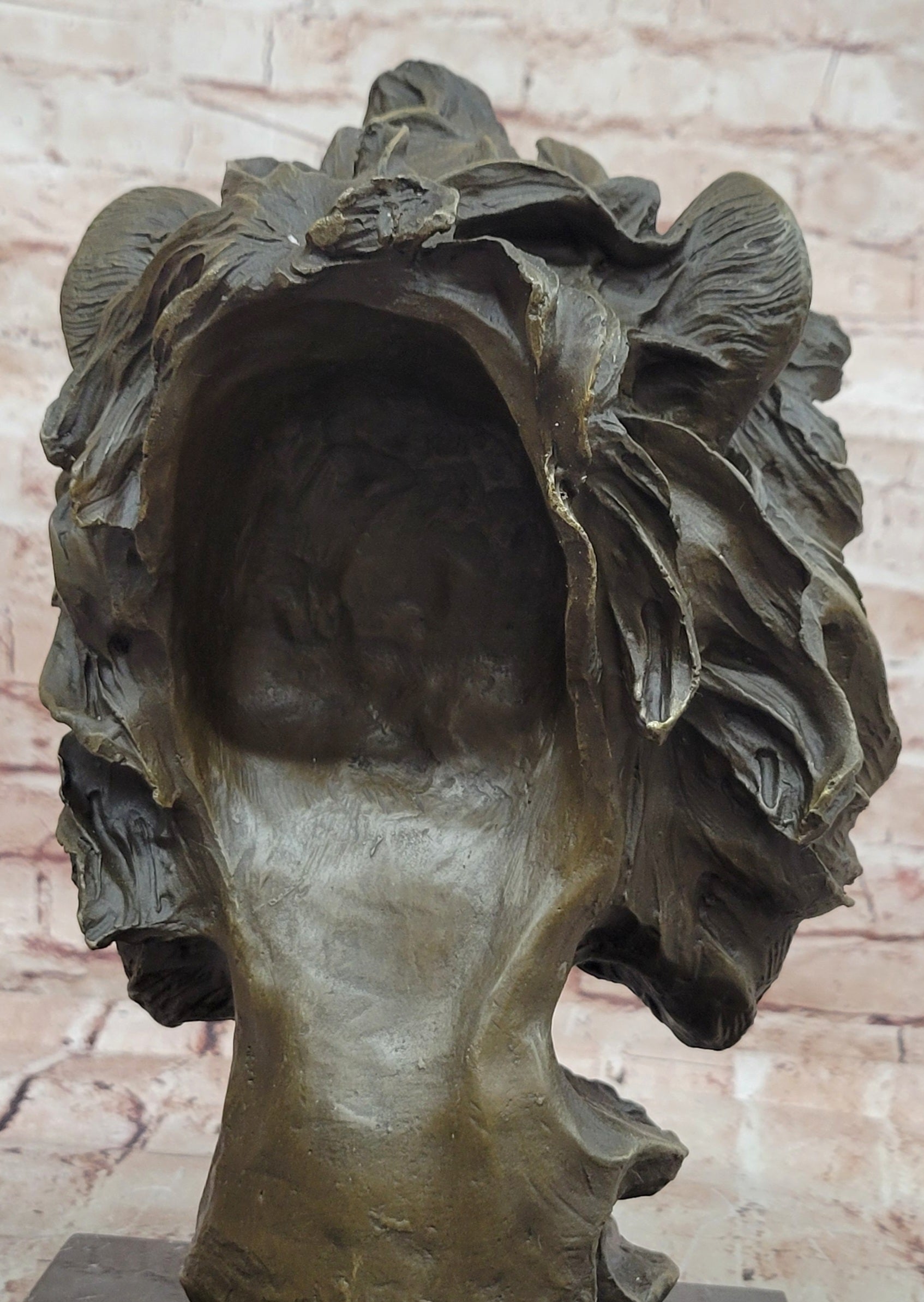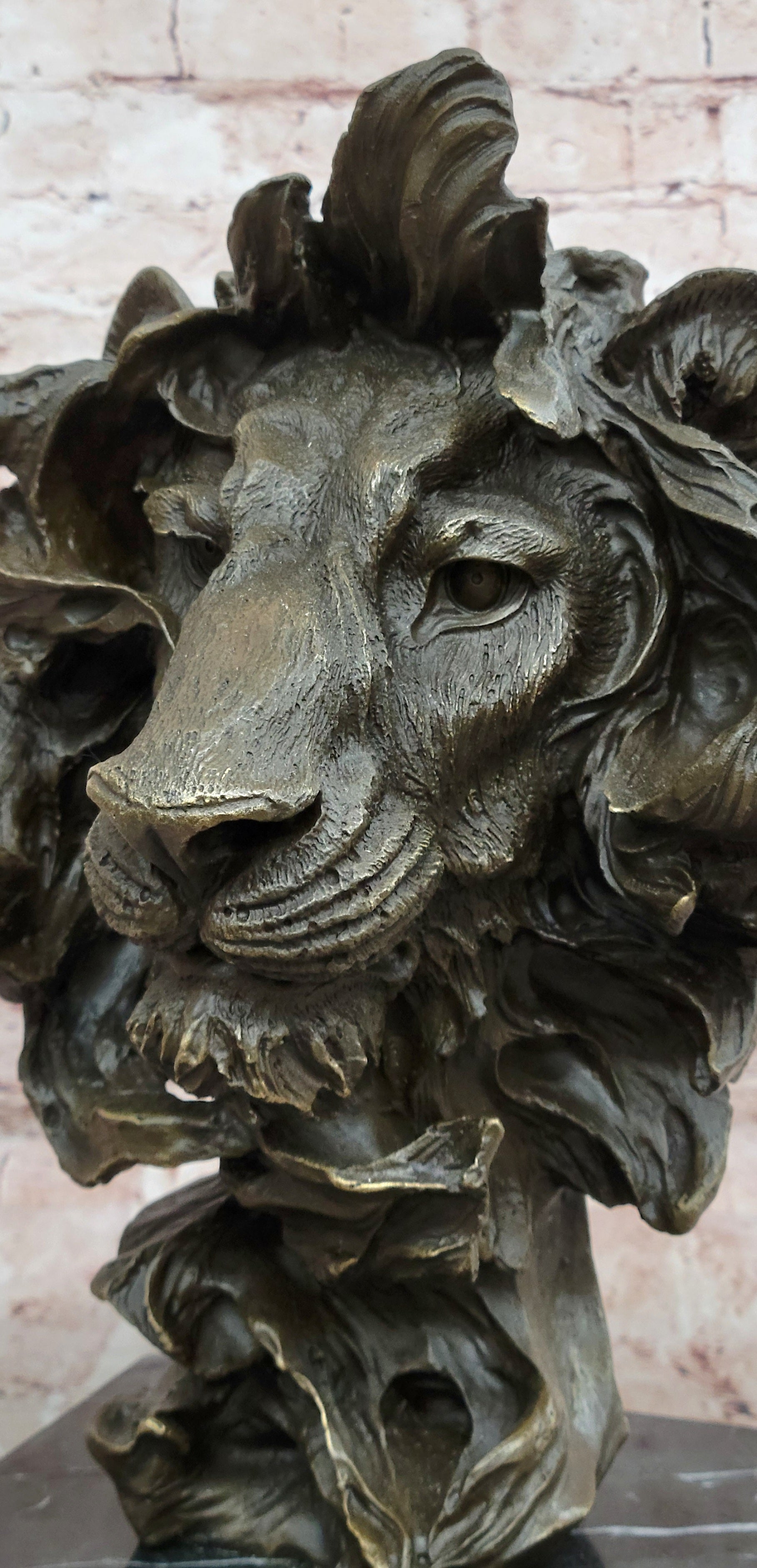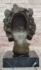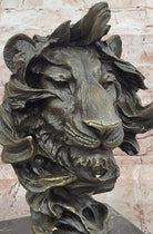 Bronze Lion Head Bust Sculpture with Flowing Mane on Marble Base