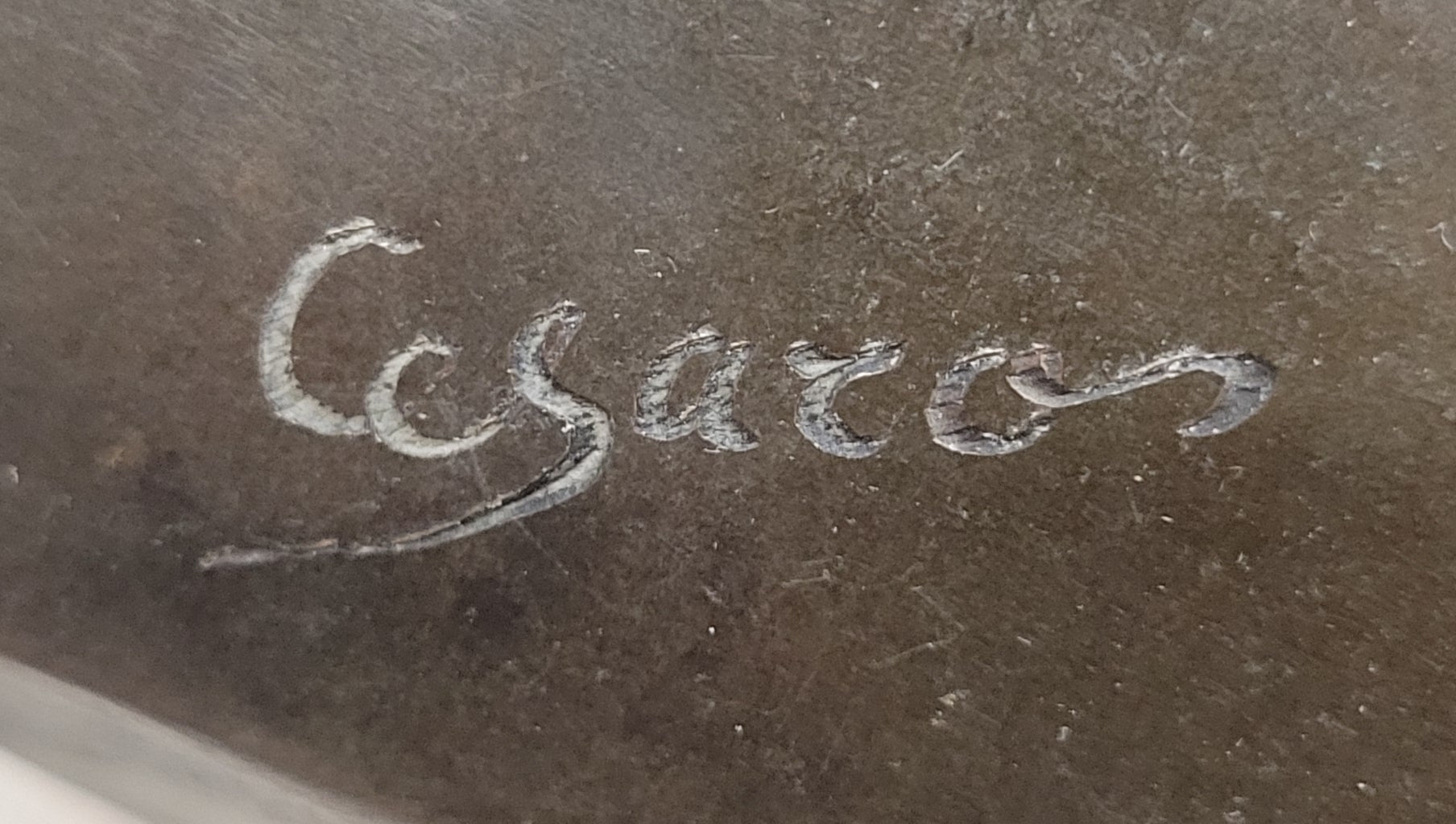 Signed by the artist Cesaro, this sculpture is meticulously handcrafted using the traditional lost-wax casting method, a time-honored technique that ensures exceptional detail and durability. The rich brown patina enhances the intricate textures of the drapery and highlights the subtle contours of the figure, giving the artwork warmth and dimension.