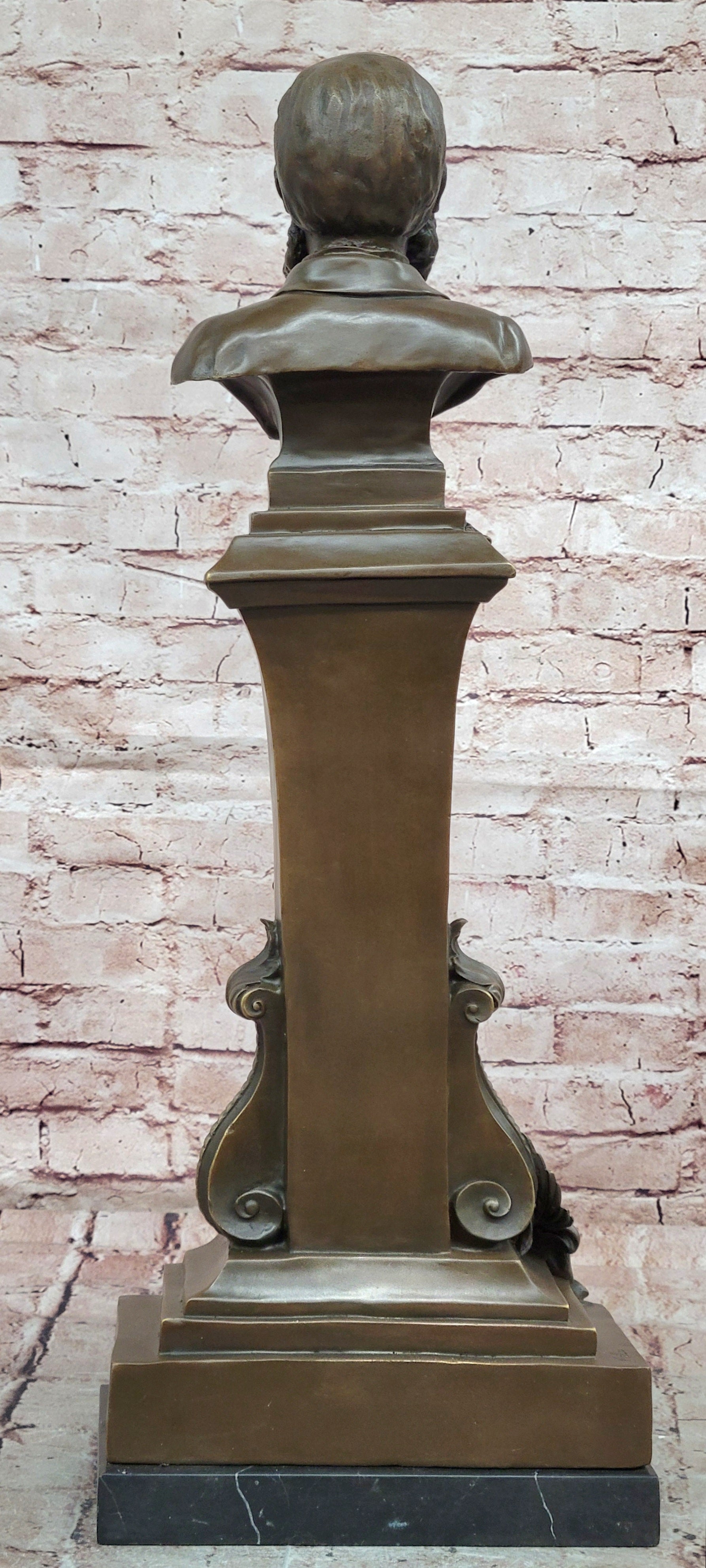 Beneath the composer’s bust stands a graceful maiden holding a flower, symbolizing inspiration, lyricism, and the poetic beauty of music. The elegant pairing creates a harmonious and meaningful composition, blending classical portraiture with allegorical artistry.