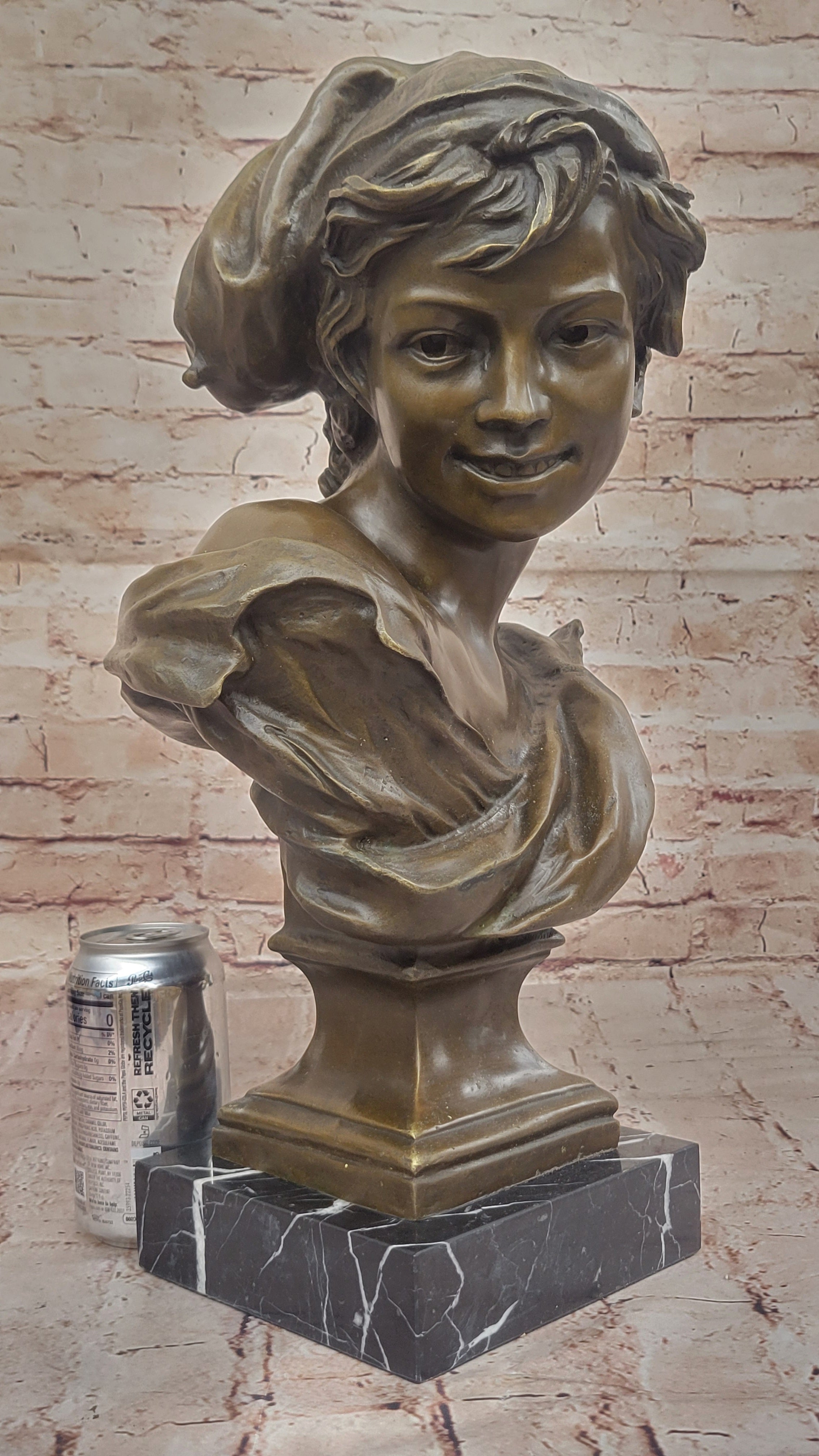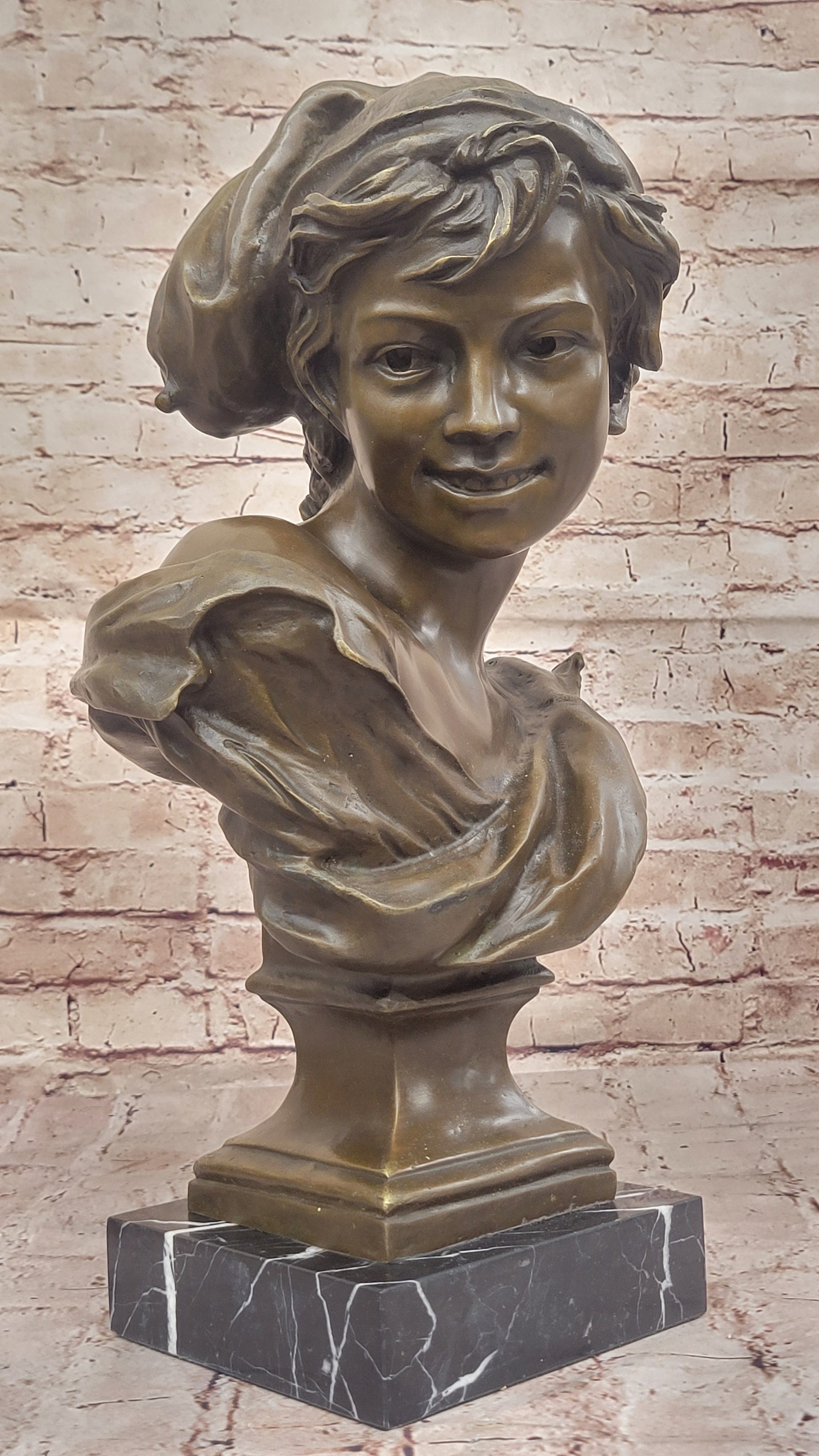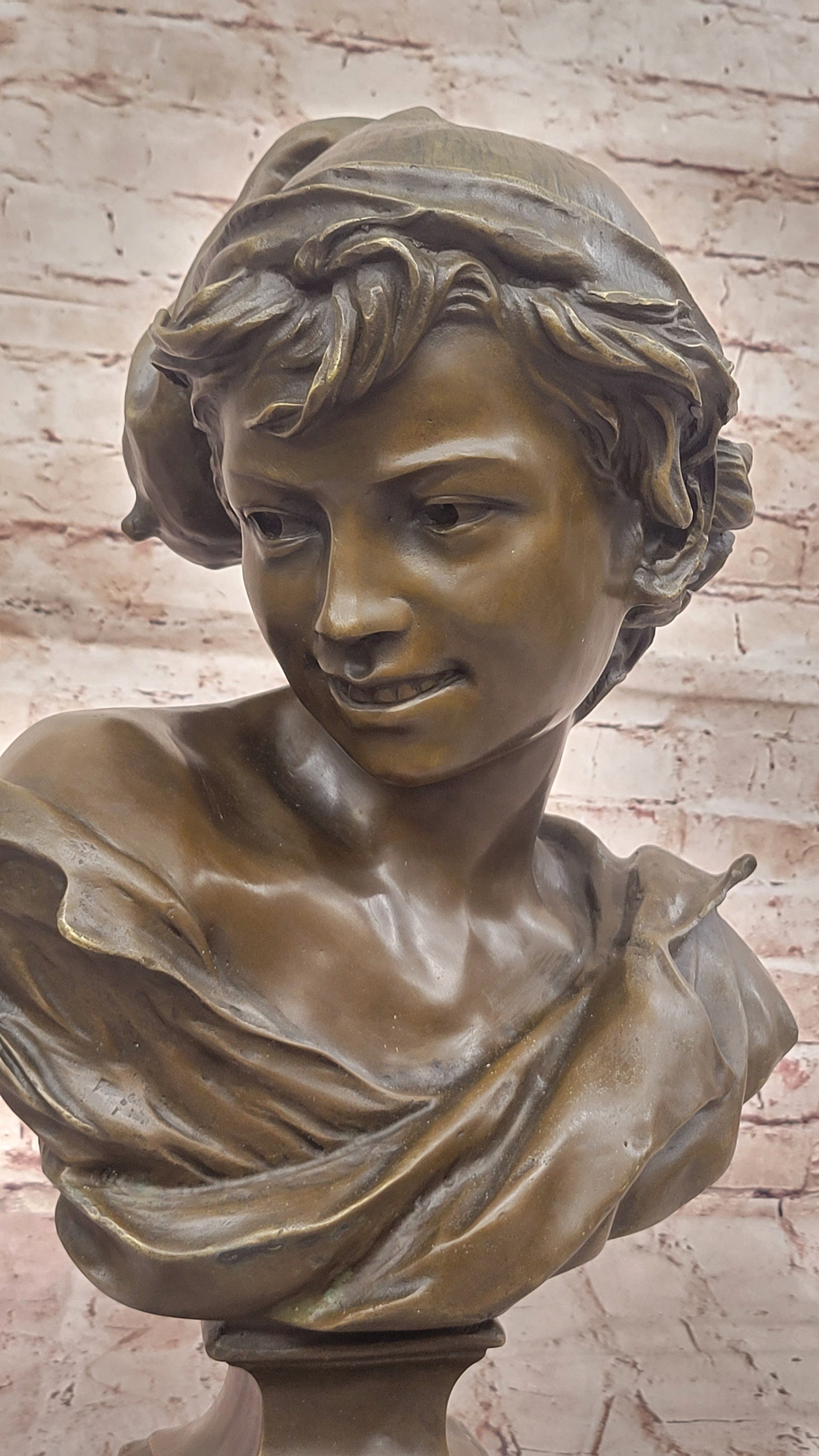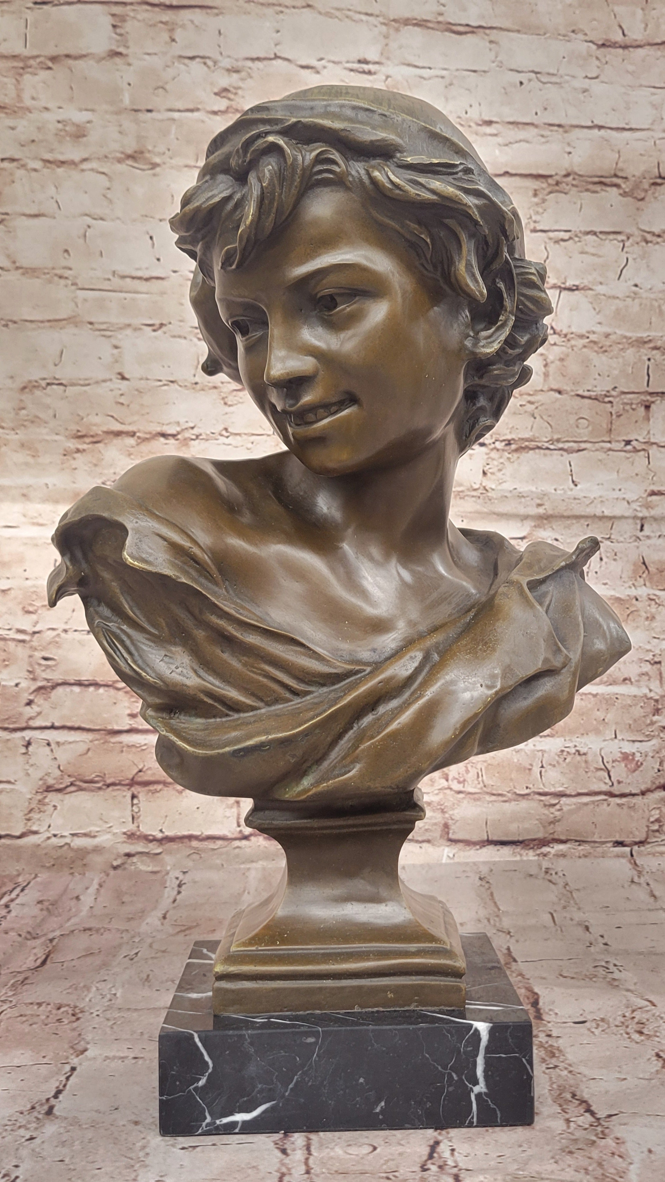 Charming Smiling Boy Bronze Bust Sculpture with Marble Base by Dalou