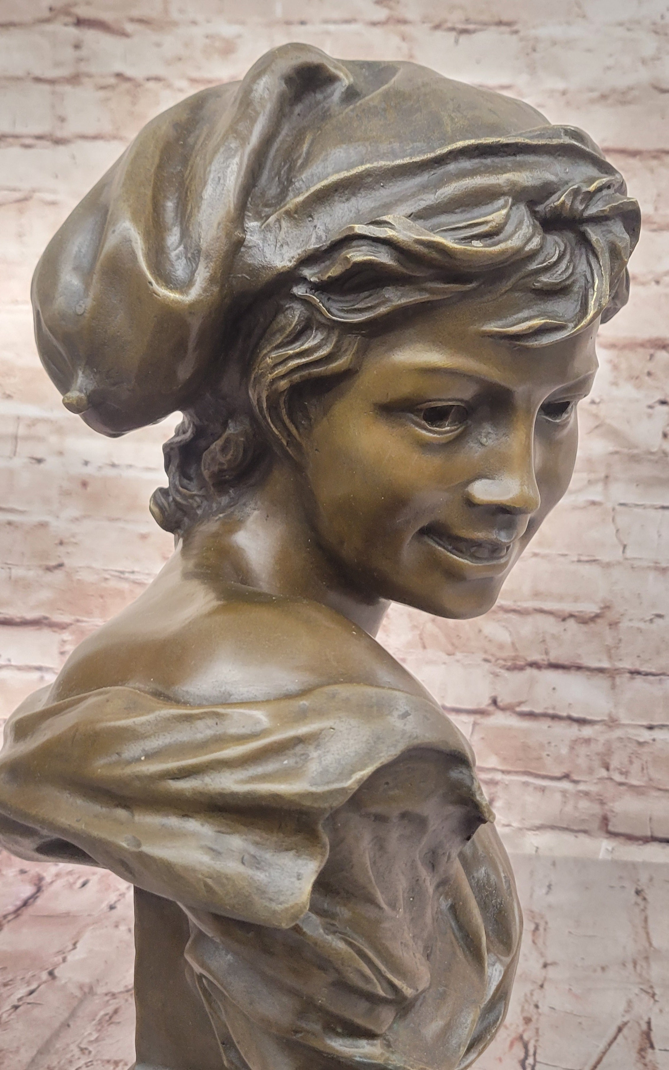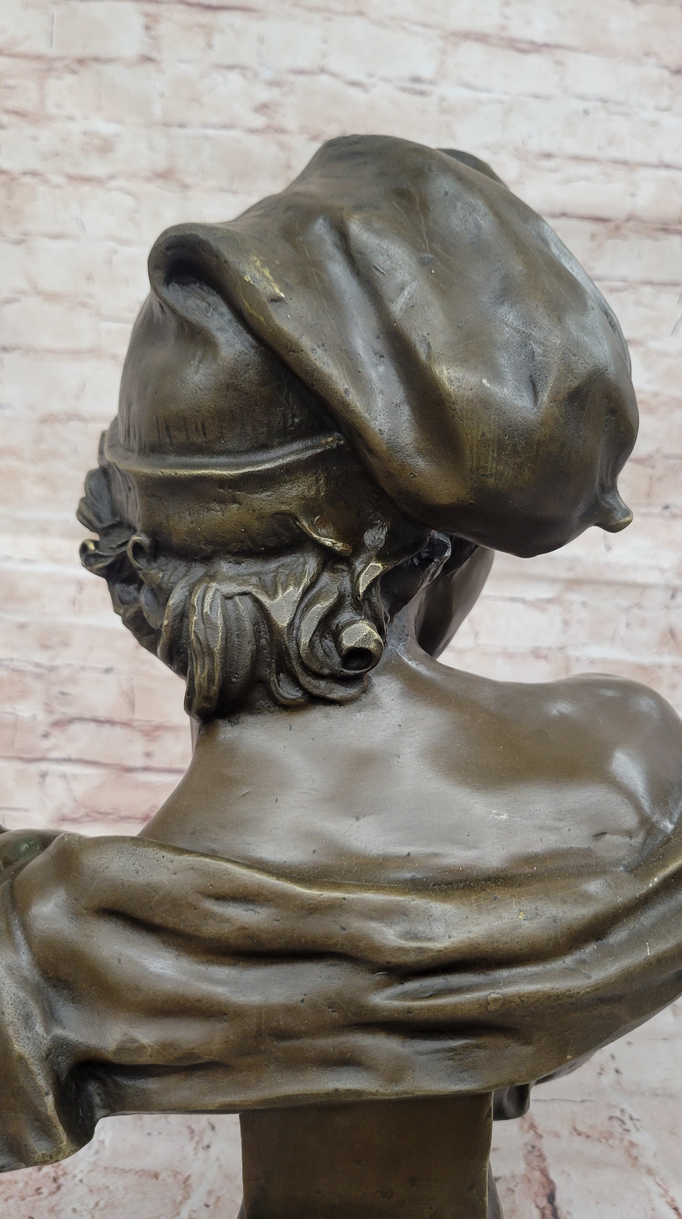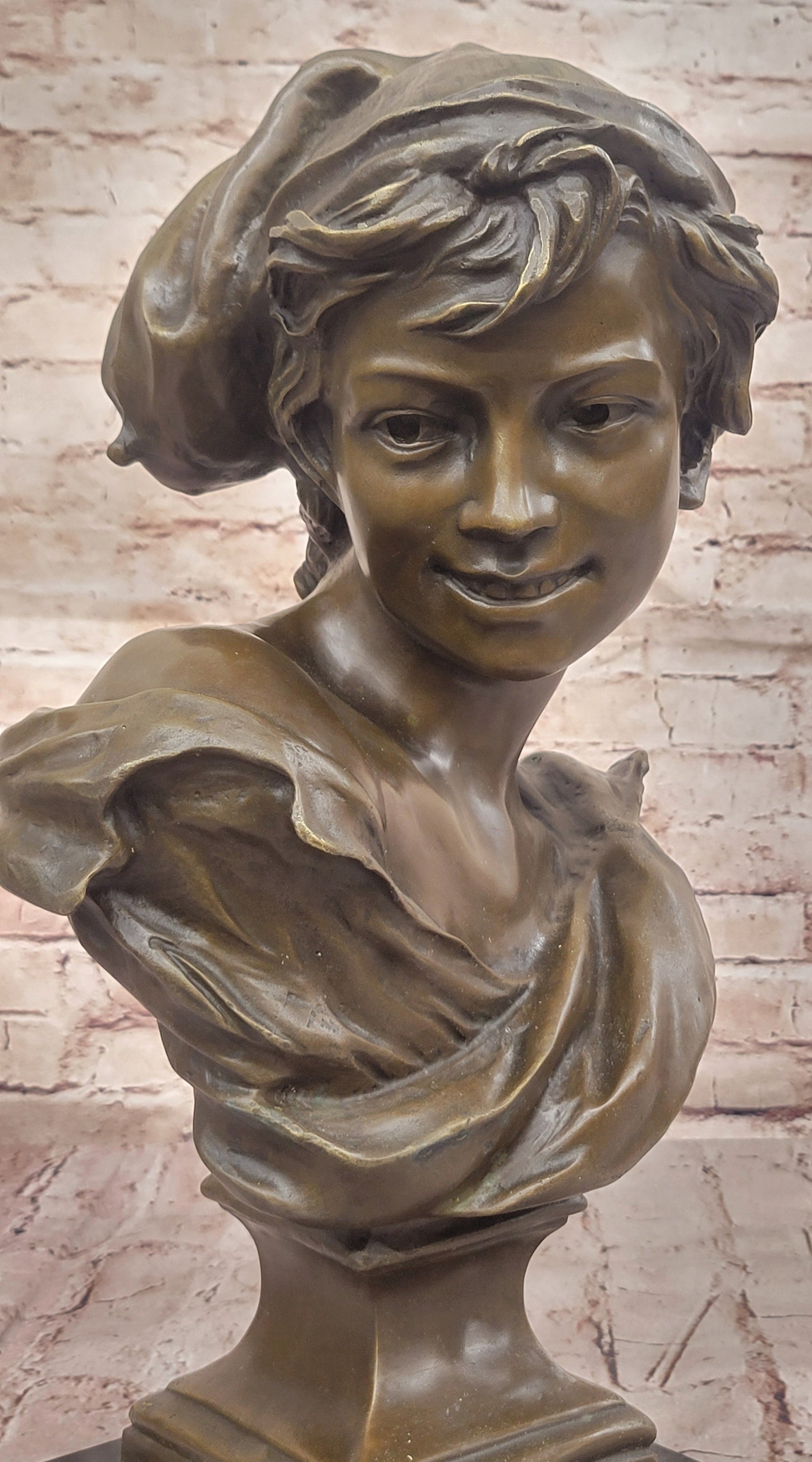 This exquisite bronze bust, designed by Dalou, captures the essence of an Italian adolescent boy from a bygone era. Dressed in the attire of simpler times, with a cap adorning his head and a cloth casually draped around his shoulders, the sculpture beautifully evokes a sense of nostalgia and innocence. The boy's facial expressions are a testament to the artist's mastery of detail and emotion. There's a delightful shyness in his gaze, as if he has just engaged in a charming encounter, leaving him feeling giddy and bashful. The bronze material adds depth and texture to the sculpture, making it feel as if the boy might come to life at any moment. Crafted using the age-old "Lost Wax Method," this piece is not only a work of art but also a historical and cultural representation of a particular time and place. Set on a black marble base, it stands as a timeless tribute to the enduring charm of youth and the artistry of Dalou. The sculpture is signed by the artist, further enhancing its quality and collectability. It's a perfect addition to any art collection or decor, inviting viewers to step back in time and savor the beauty of a moment frozen in bronze.