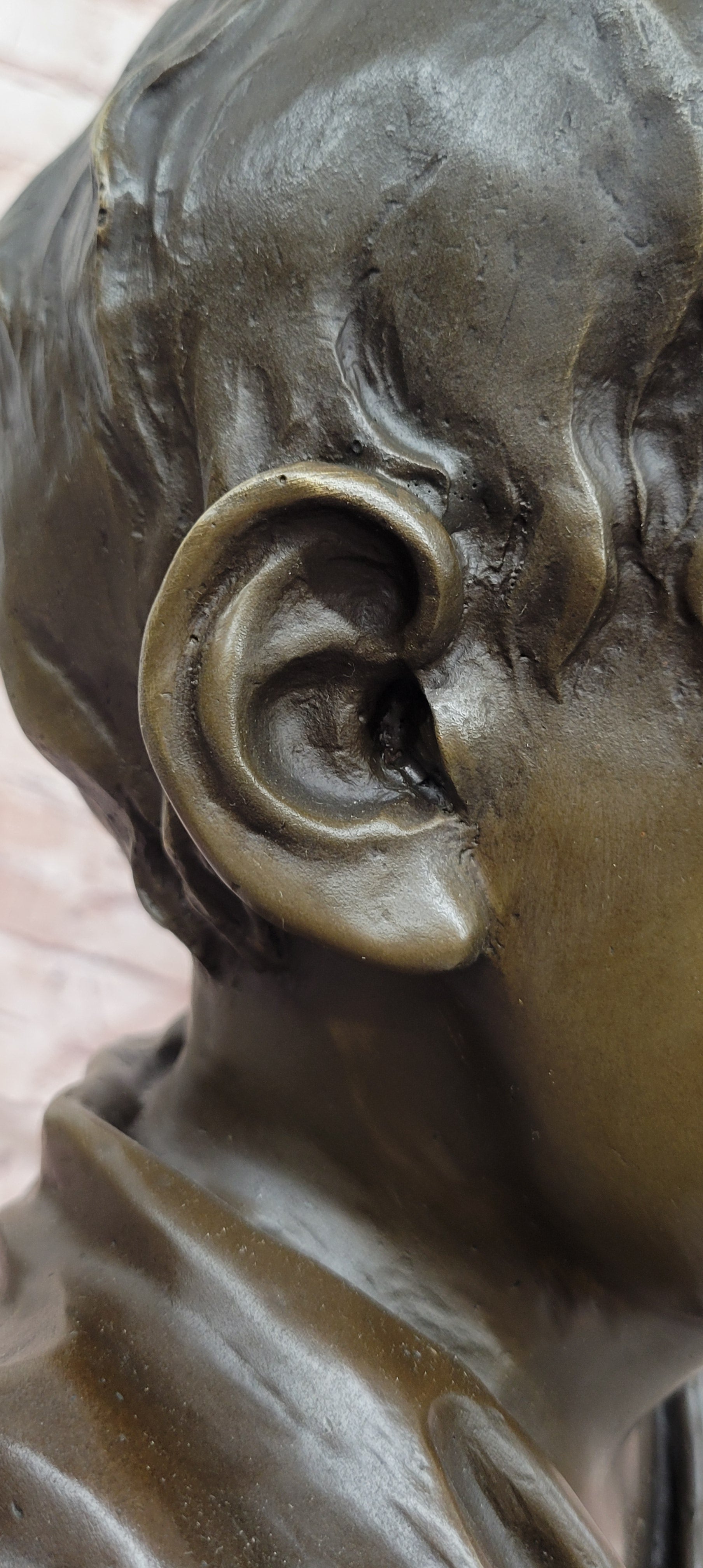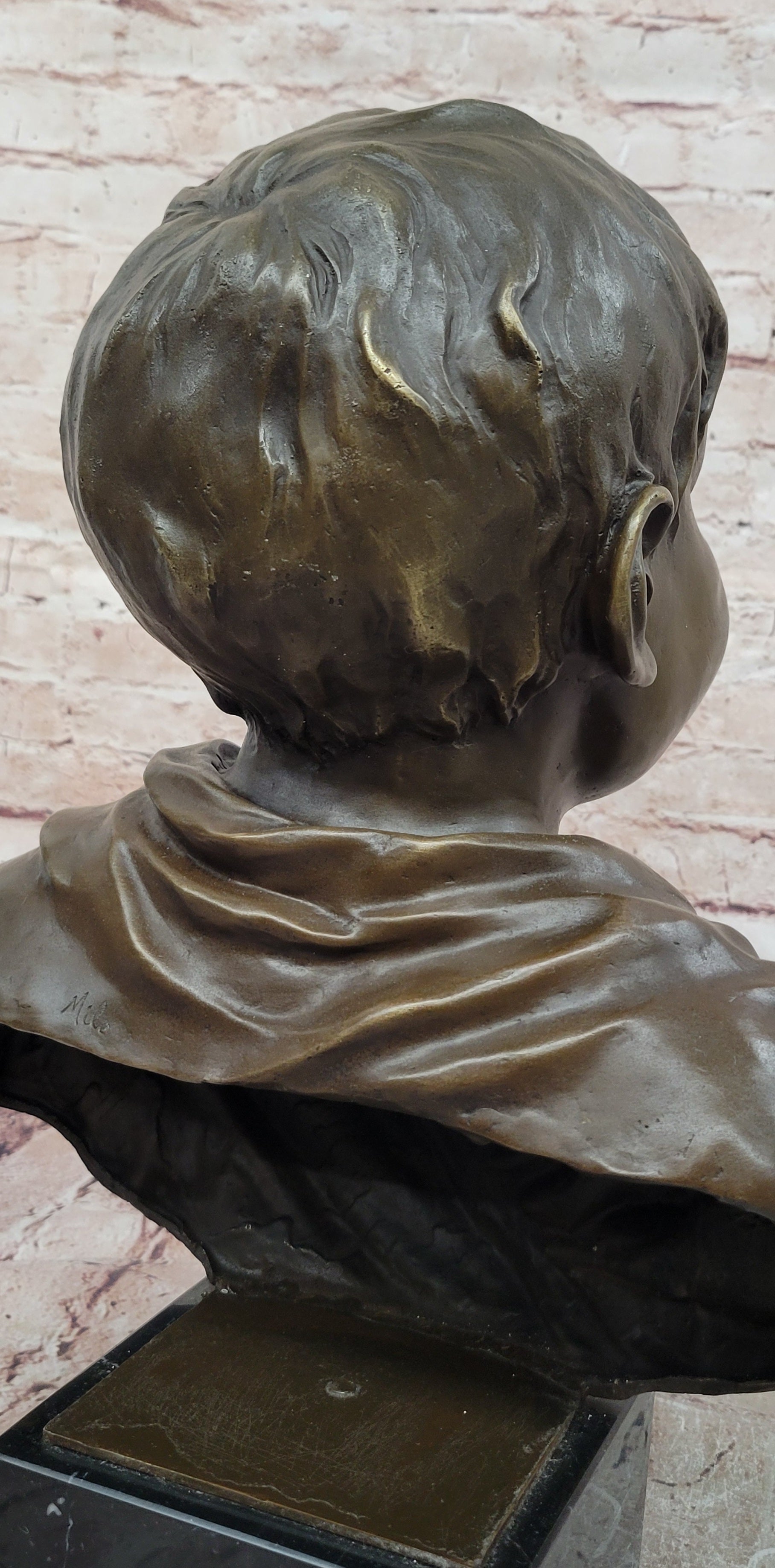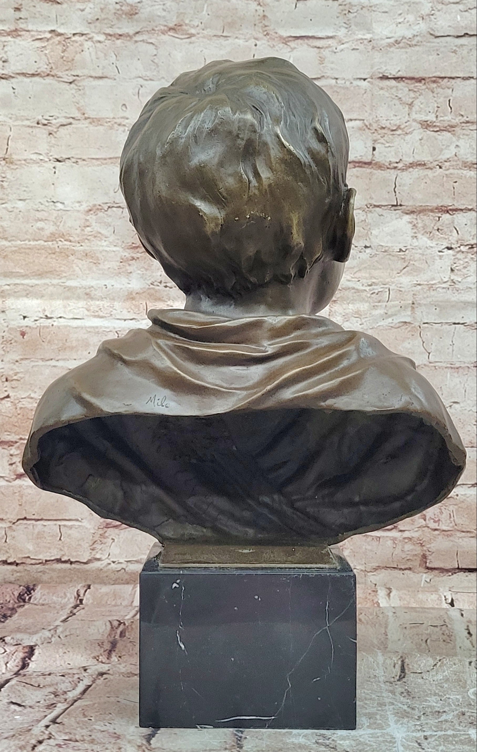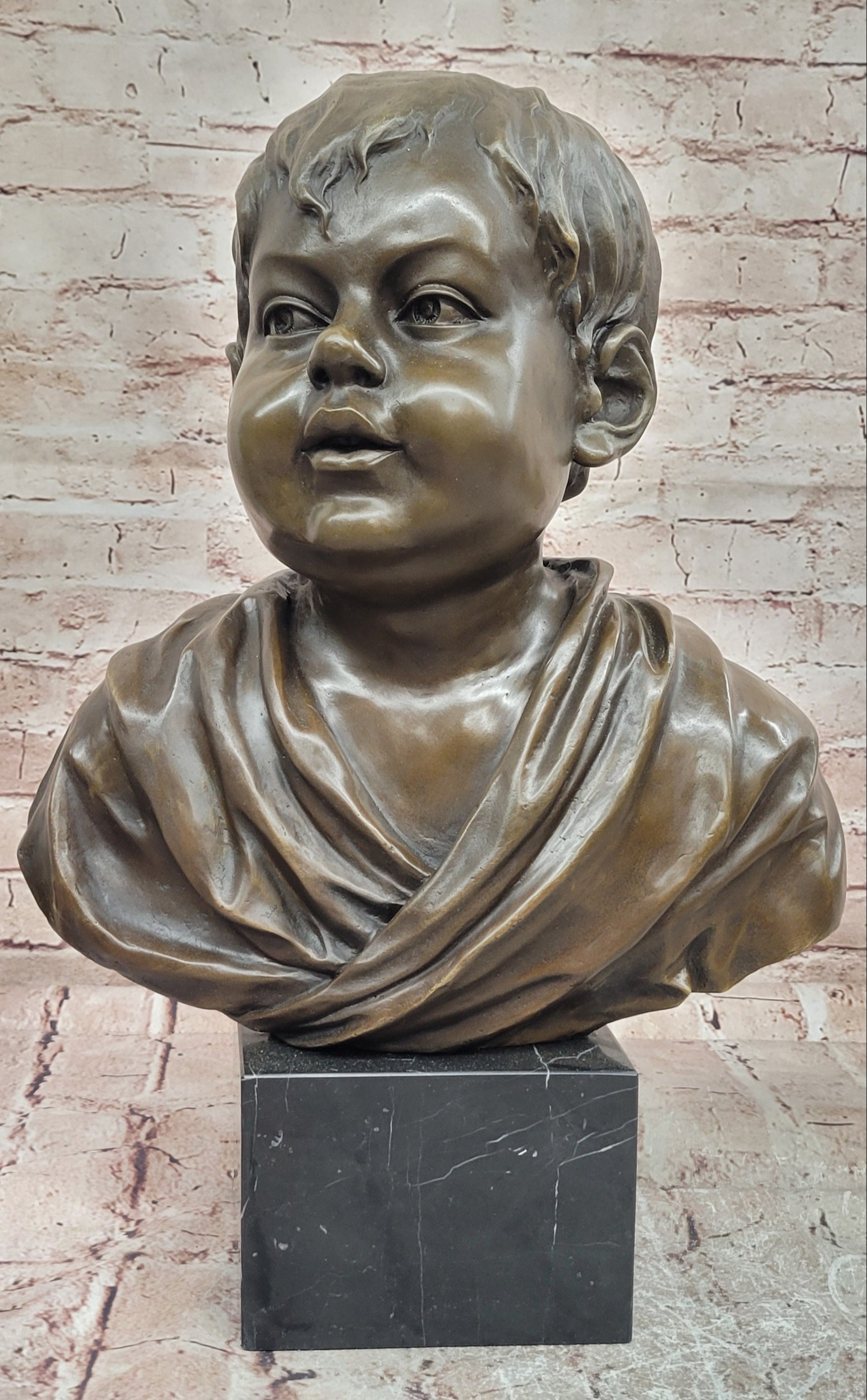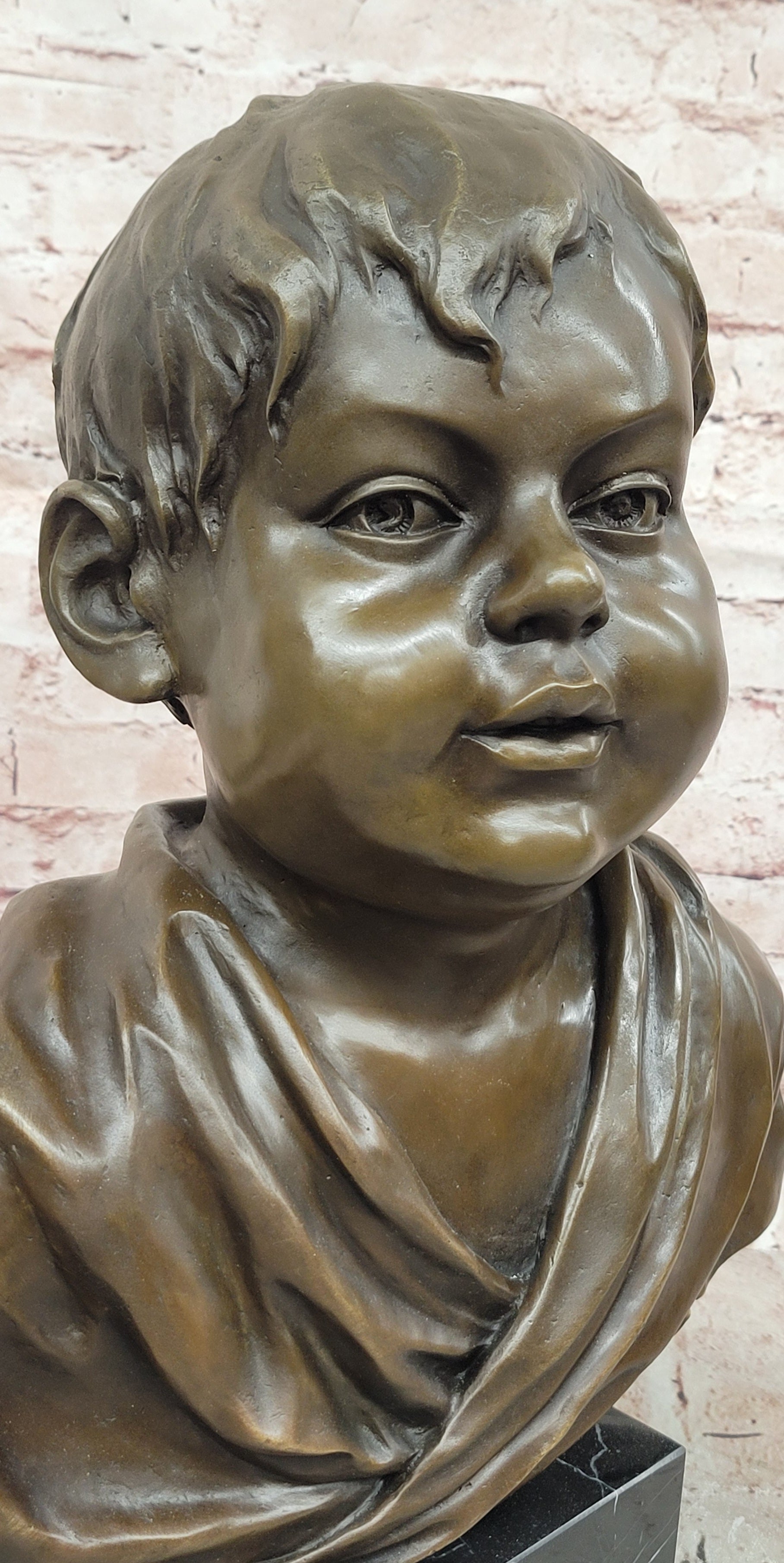 Crafted using the traditional lost-wax casting method, this genuine bronze sculpture demonstrates exceptional quality and attention to detail. The rich brown patina enhances the depth and texture of the boy’s features, highlighting subtle expressions and adding warmth to the overall presentation. The smooth finish and precise modeling showcase the artistry and craftsmanship behind the piece.