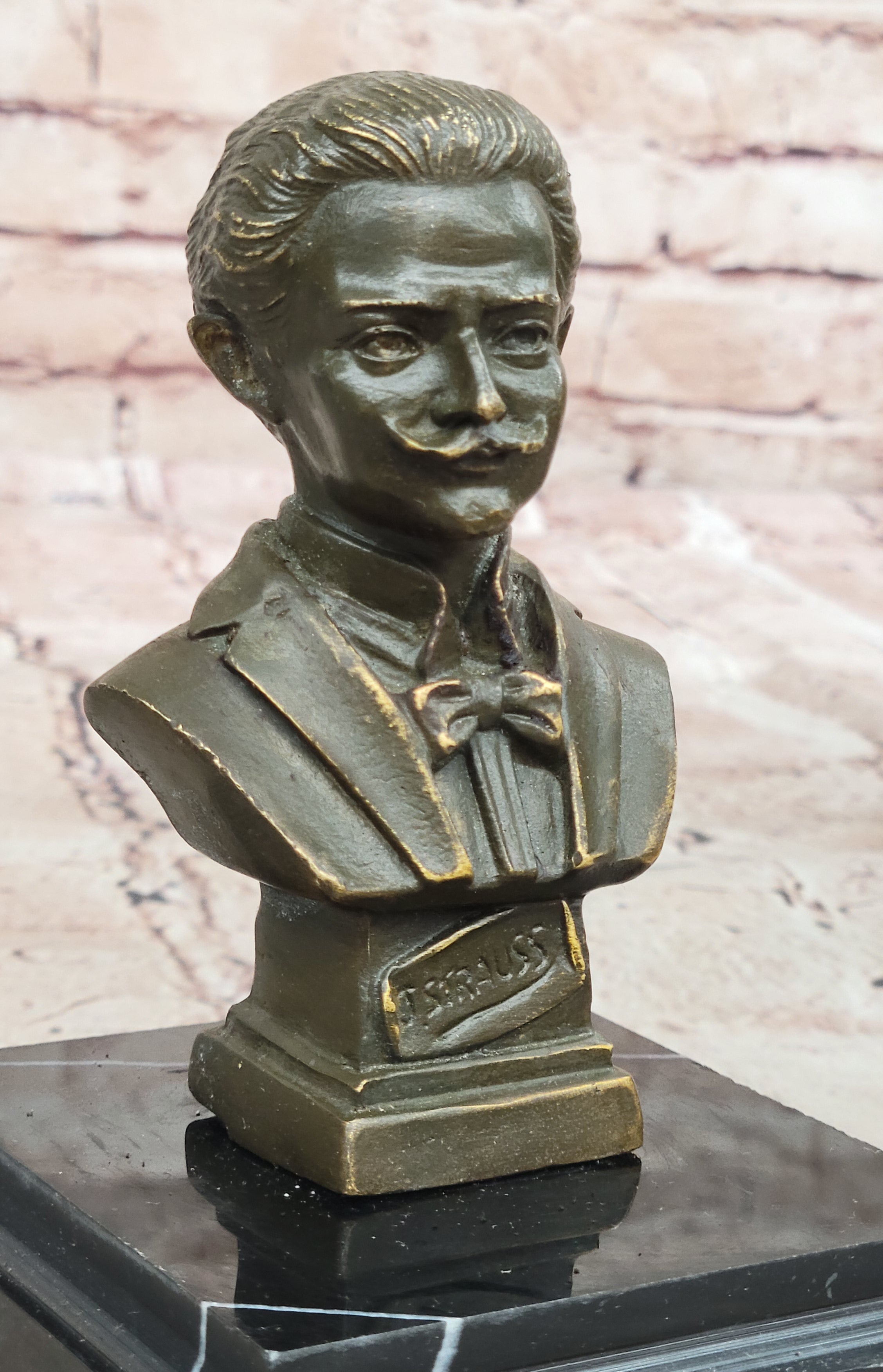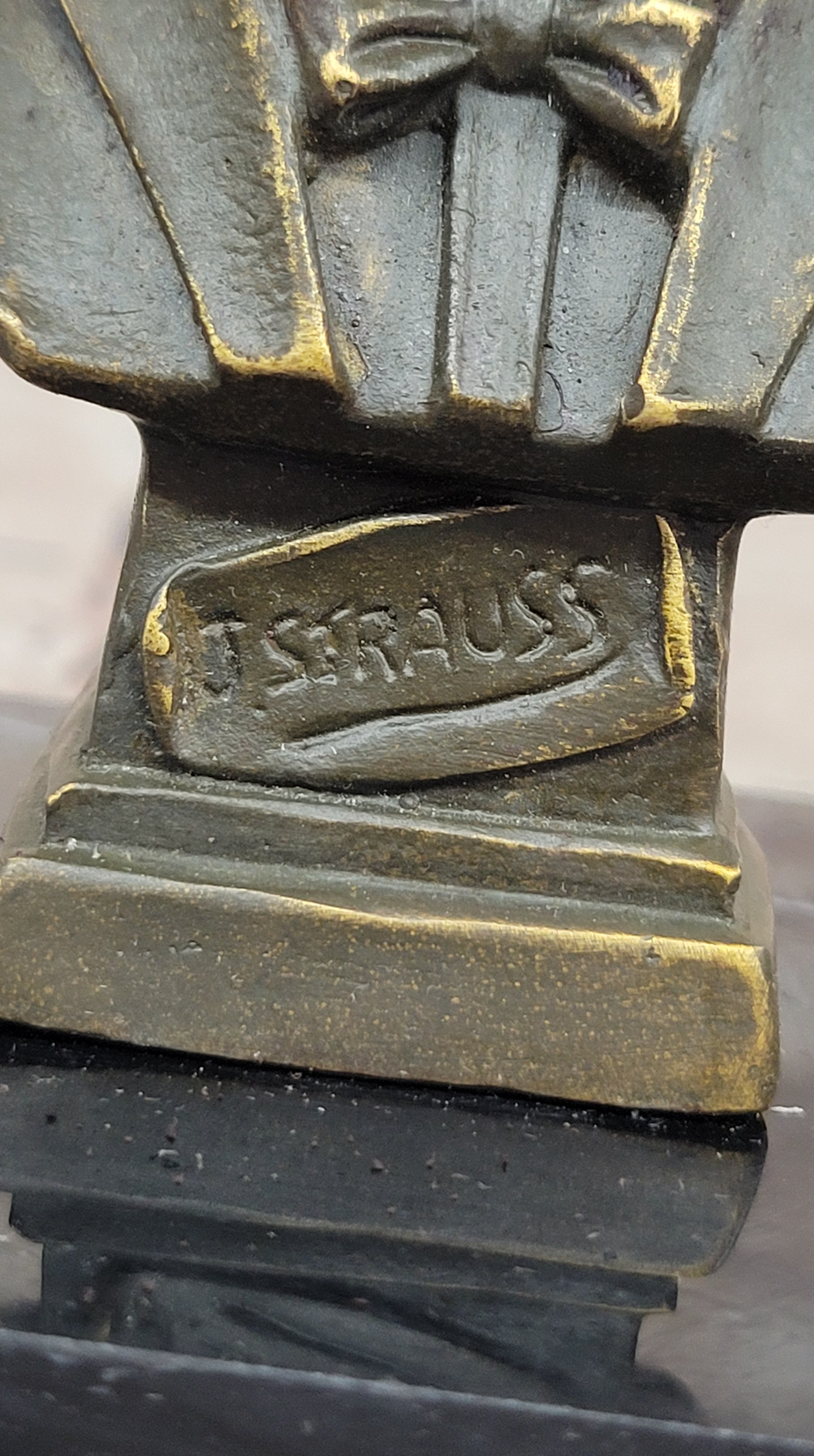 Rendered with exceptional detail, the sculpture captures Strauss I in a moment of poised contemplation. His finely modeled features, from the enigmatic smile to the thoughtful downward gaze, reflect his artistic depth. Dressed in formal evening attire, complete with a meticulously sculpted bow tie and coat, the bust evokes a timeless elegance. The base of the sculpture bears his name in a respectful nod to his lasting contributions to classical music.