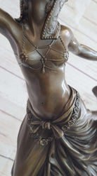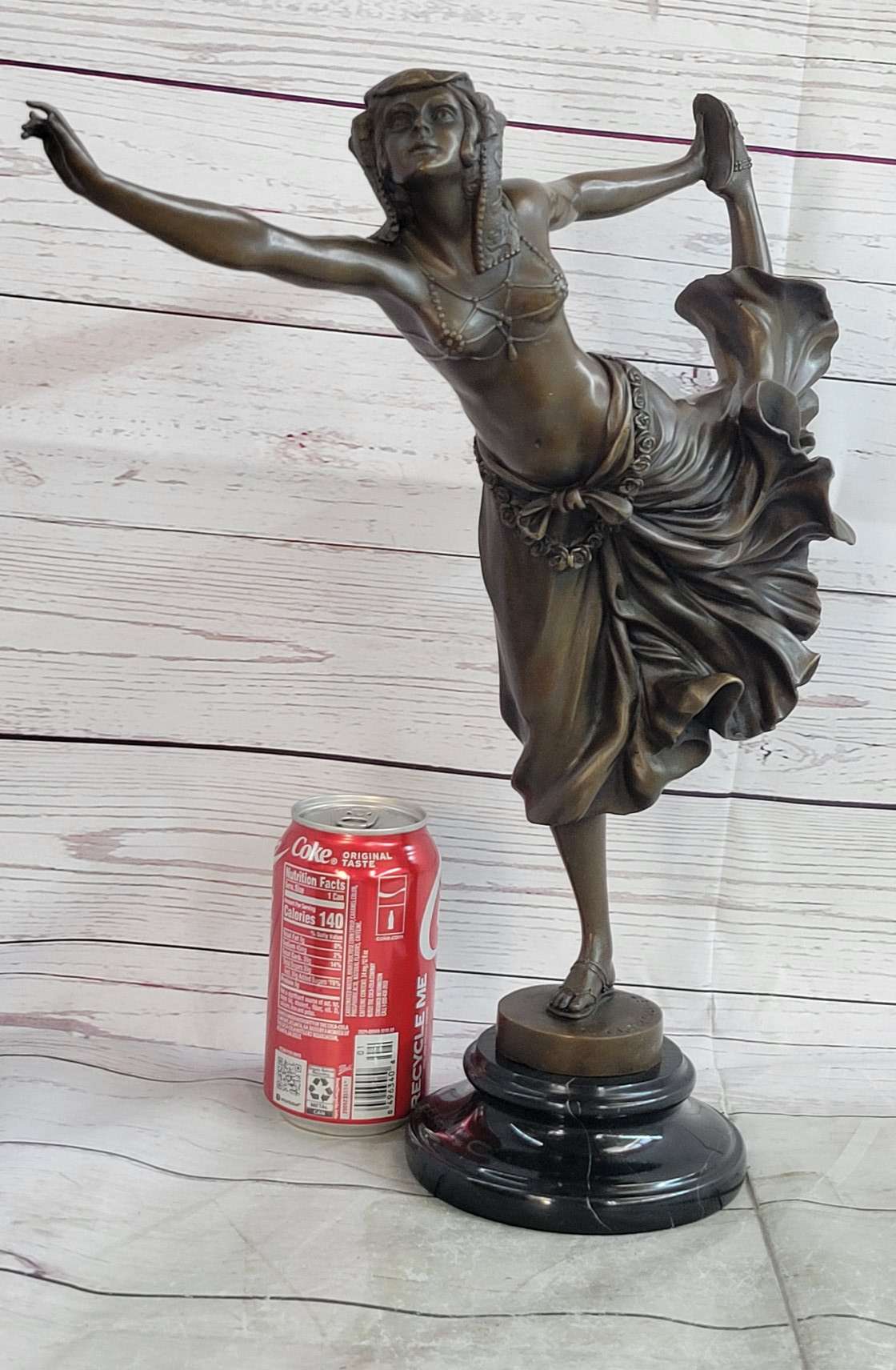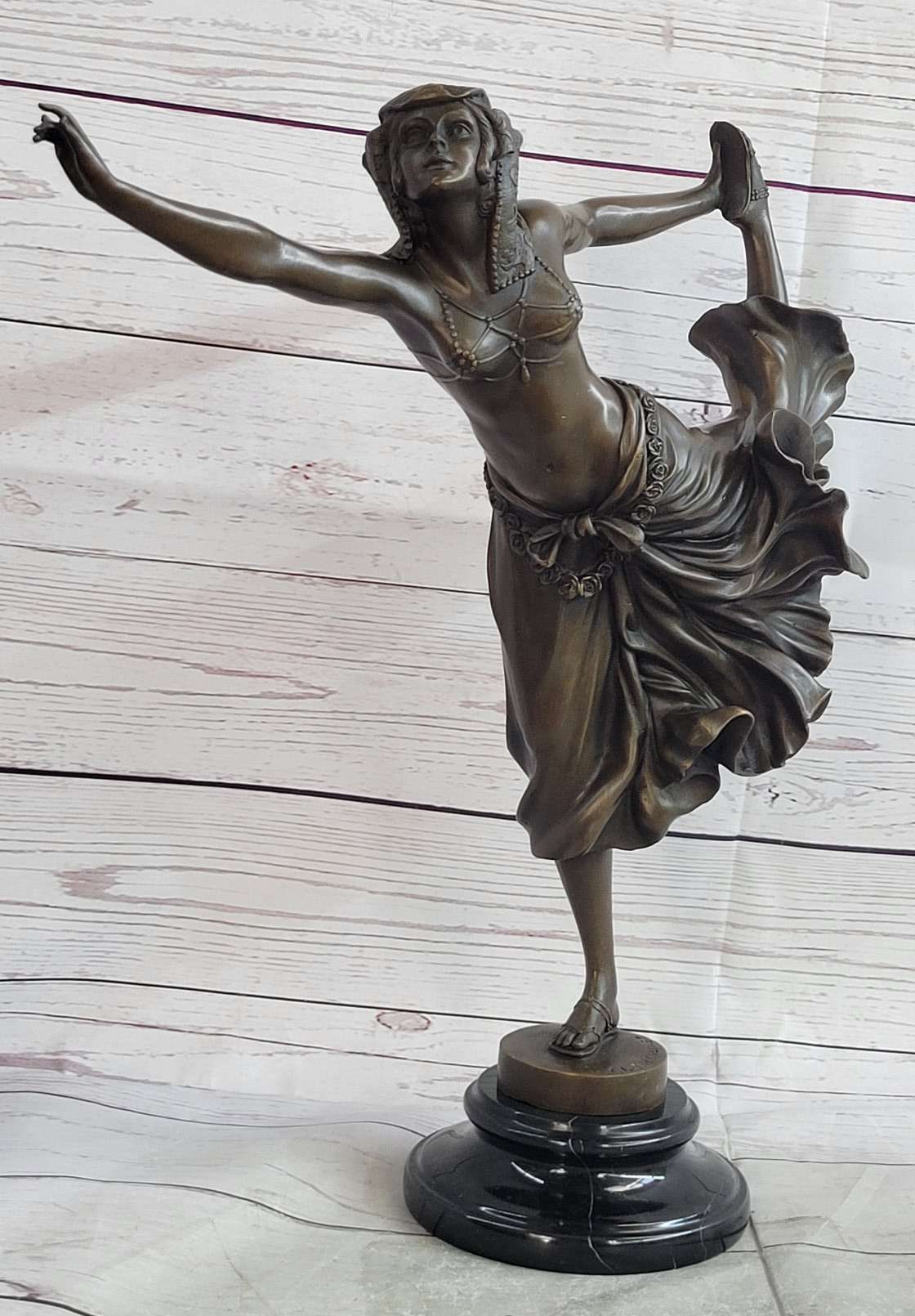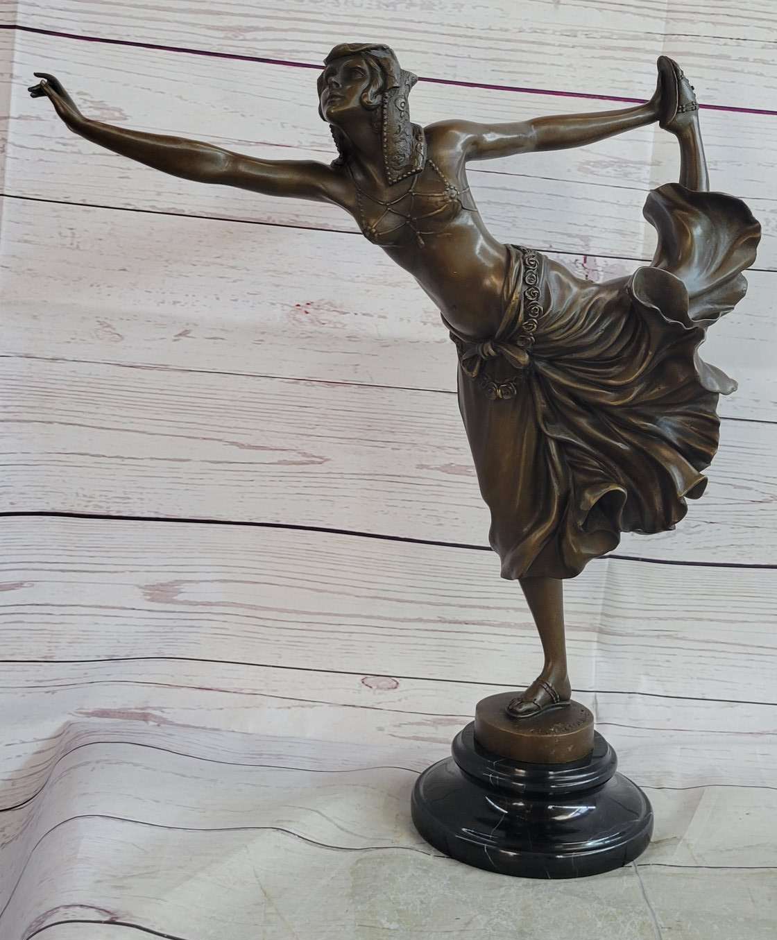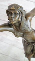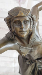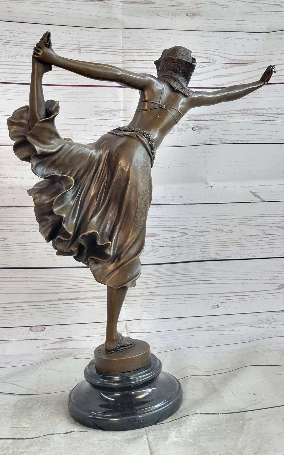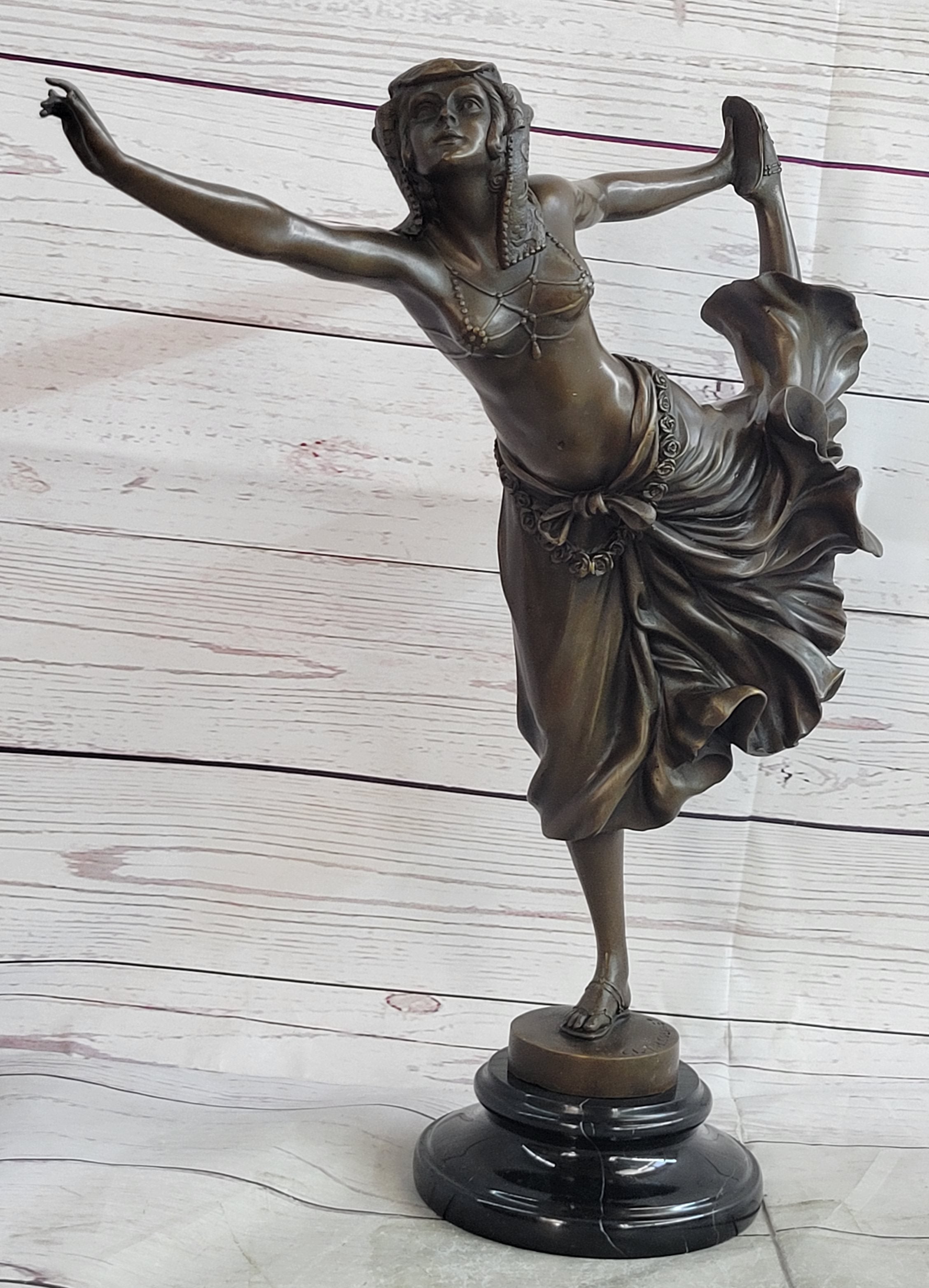 This exquisite bronze sculpture by Claire Jeanne Roberte Colinet captures a moment of expressive movement and elegance, featuring a semi-nude dancer in an Egyptian headdress. Balanced gracefully on her right foot with her left leg raised, the figure extends her arms in a dramatic pose that embodies both strength and fluidity. The sculpture highlights the dancer's flexibility and grace, freezing a fleeting moment of performance in timeless bronze.