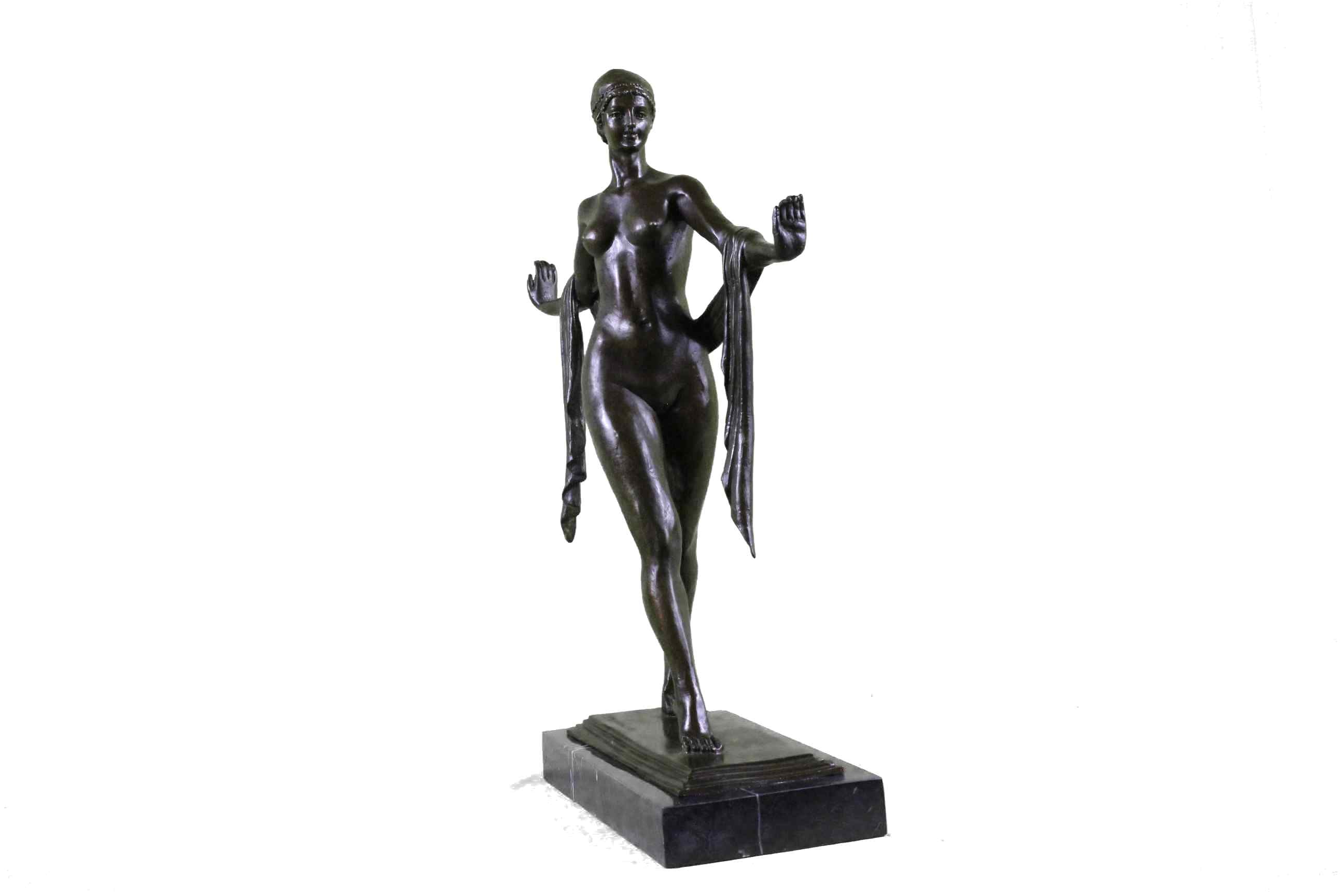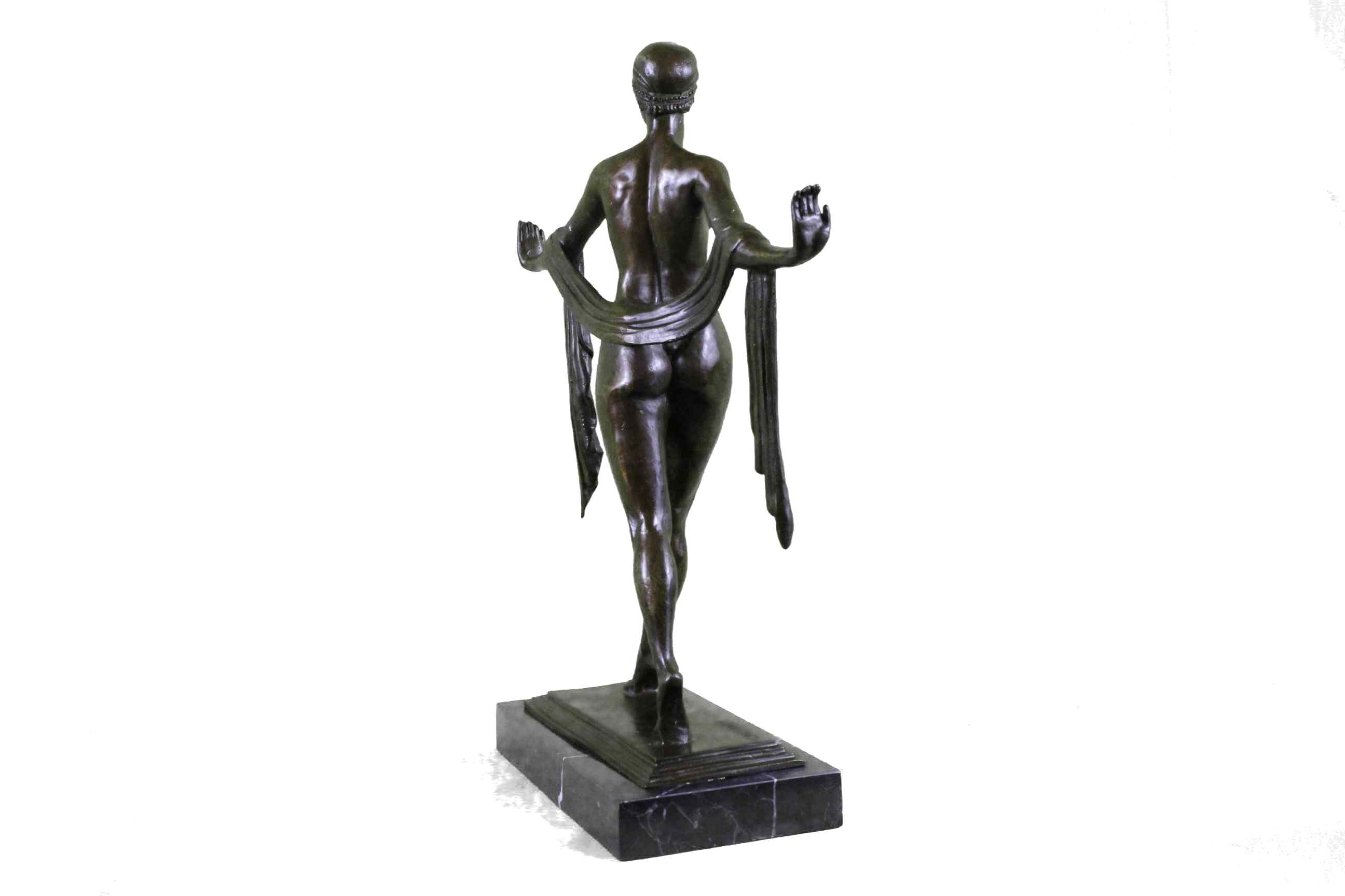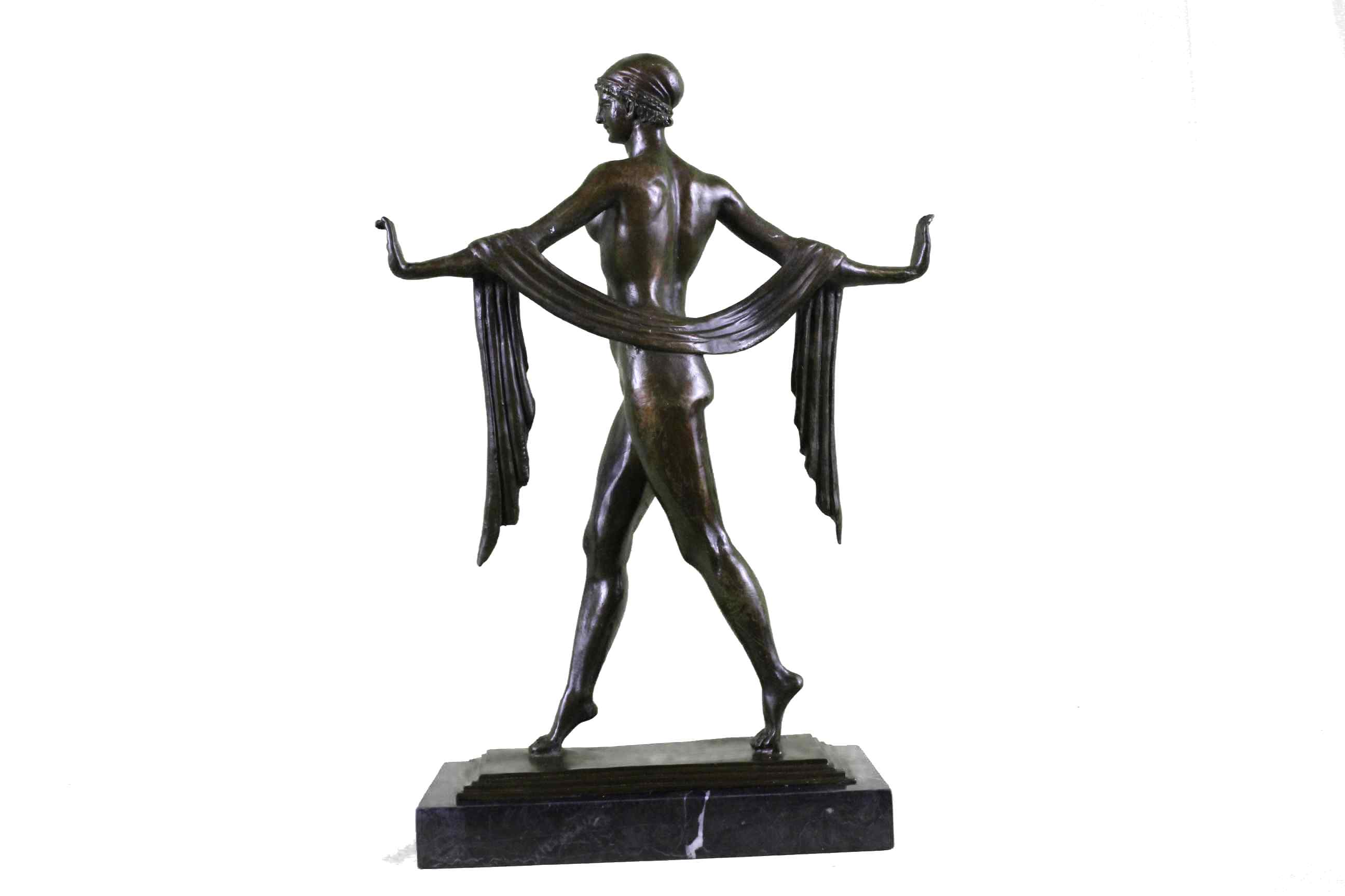 Born in Stuttgart, Germany, on December 20, 1890, Carl Paul Jennewein, came to the United States in 1907 and studied at the Art Students League in New York from 1908 to 1911. He returned to Europe and received the Prix de Rome in 1916. During four years of advanced study he produced a number of distinguished works including Cupid and Crane in 1925 as a companion piece to Cupid and Gazelle to celebrate the birth of his third child, Alessandro. Jennewein returned to the USA and executed an important sculptural commission, a polychromed terracotta in the Hellenistic style, for the west wing of the Philadelphia Museum of Art. While designing that work on a trip to Rome, Jennewein created the Art Deco classic you see here, The Greek Dance. In order to secure commissions, Jennewein necessarily applied traditional styles for his larger works, but he was strongly influenced by Modernist styles for his smaller works. One of his designs defiesBronze Dimensions with Marble Base:Height 16" x Width 12"
