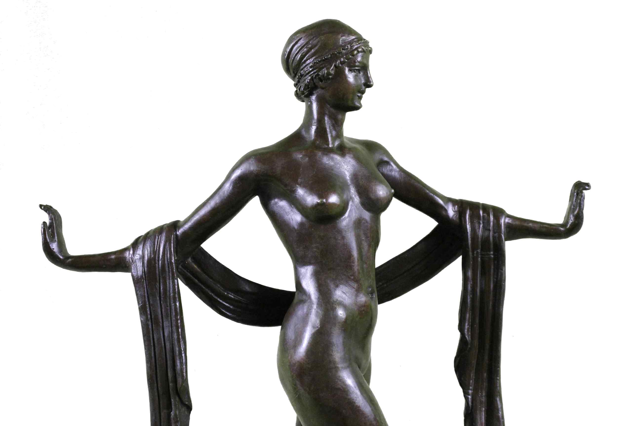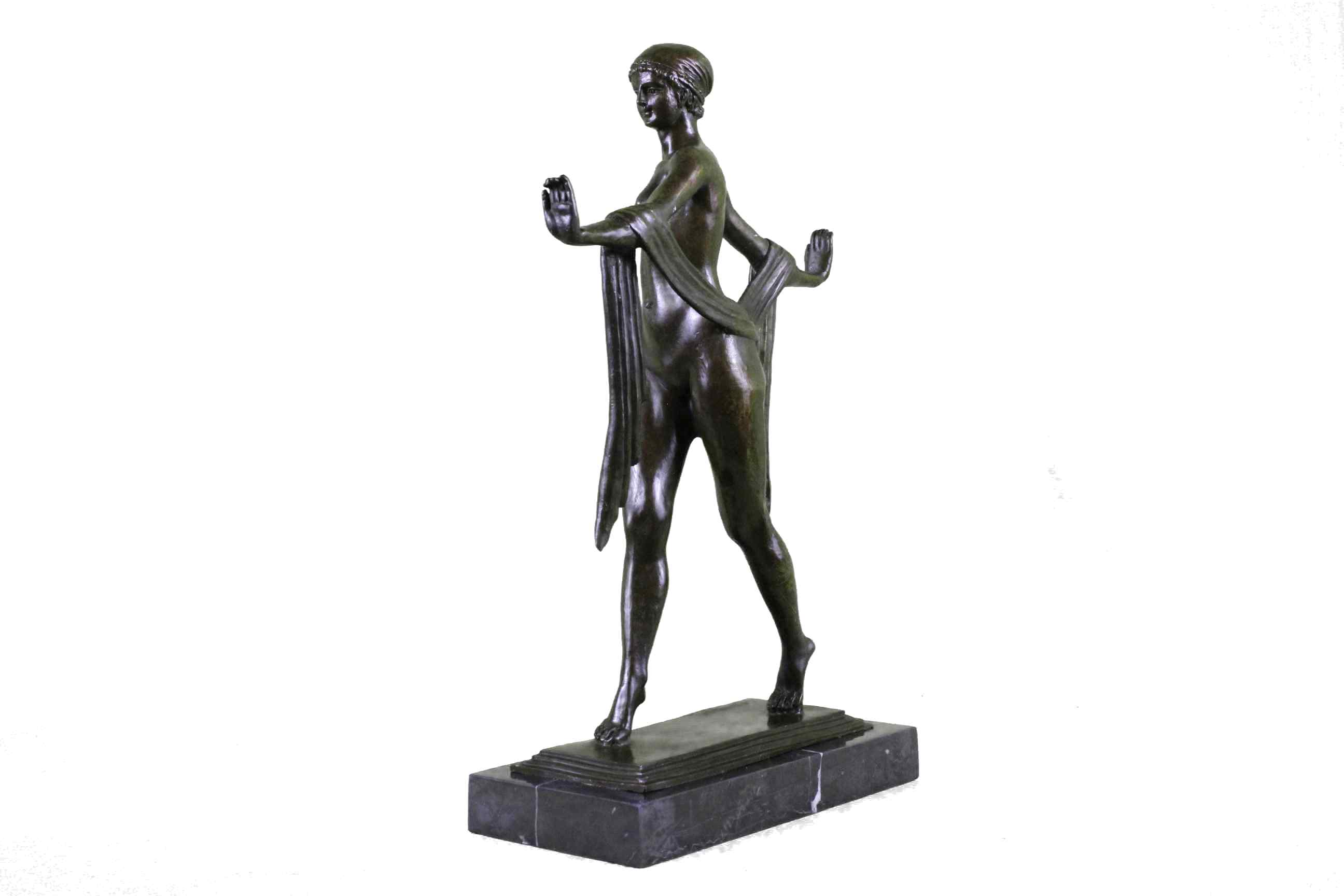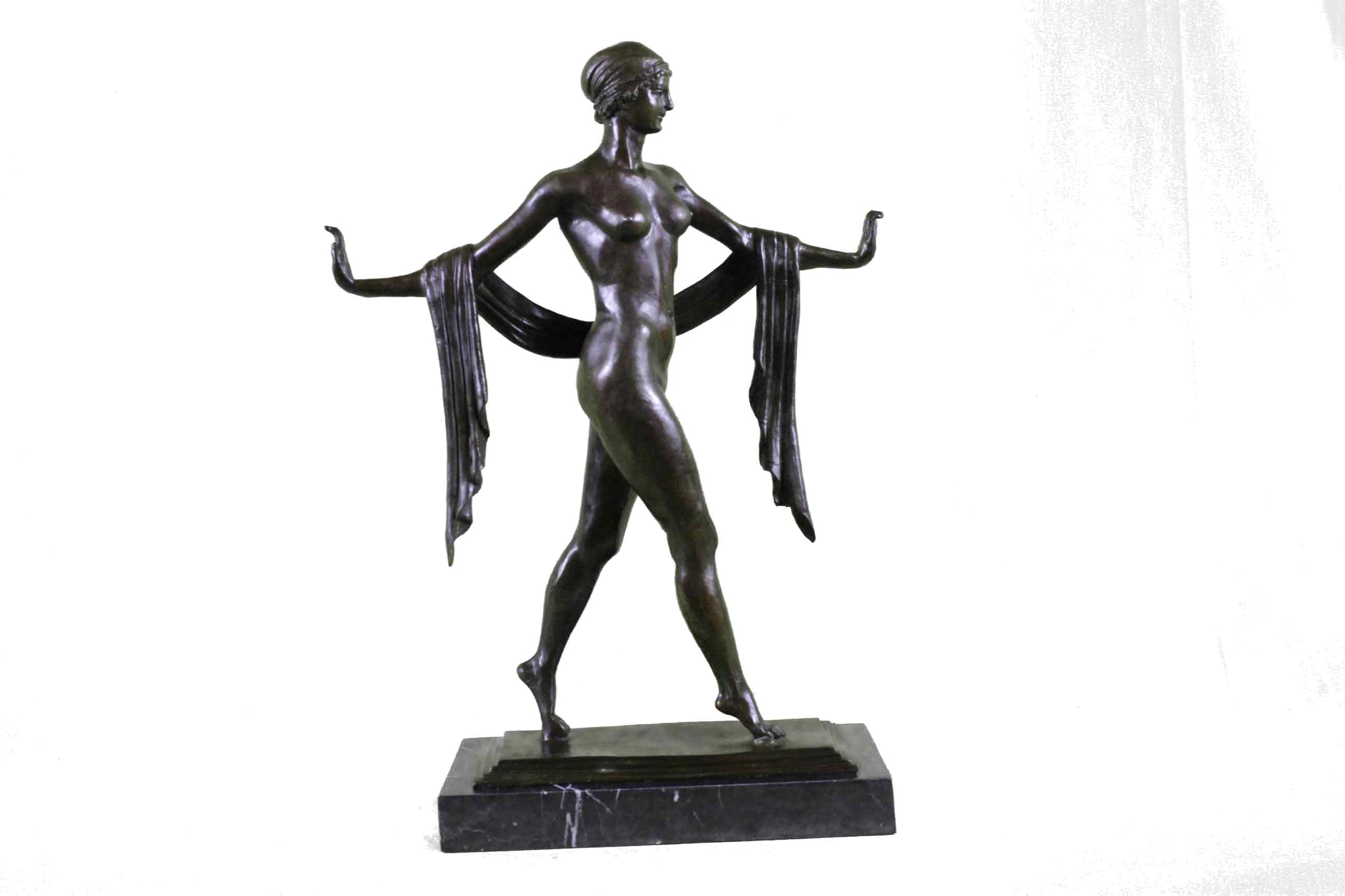 Born in Stuttgart, Germany, on December 20, 1890, Carl Paul Jennewein, came to the United States in 1907 and studied at the Art Students League in New York from 1908 to 1911. He returned to Europe and received the Prix de Rome in 1916. During four years of advanced study he produced a number of distinguished works including Cupid and Crane in 1925 as a companion piece to Cupid and Gazelle to celebrate the birth of his third child, Alessandro. Jennewein returned to the USA and executed an important sculptural commission, a polychromed terracotta in the Hellenistic style, for the west wing of the Philadelphia Museum of Art. While designing that work on a trip to Rome, Jennewein created the Art Deco classic you see here, The Greek Dance. In order to secure commissions, Jennewein necessarily applied traditional styles for his larger works, but he was strongly influenced by Modernist styles for his smaller works. One of his designs defiesBronze Dimensions with Marble Base:Height 16" x Width 12"