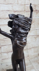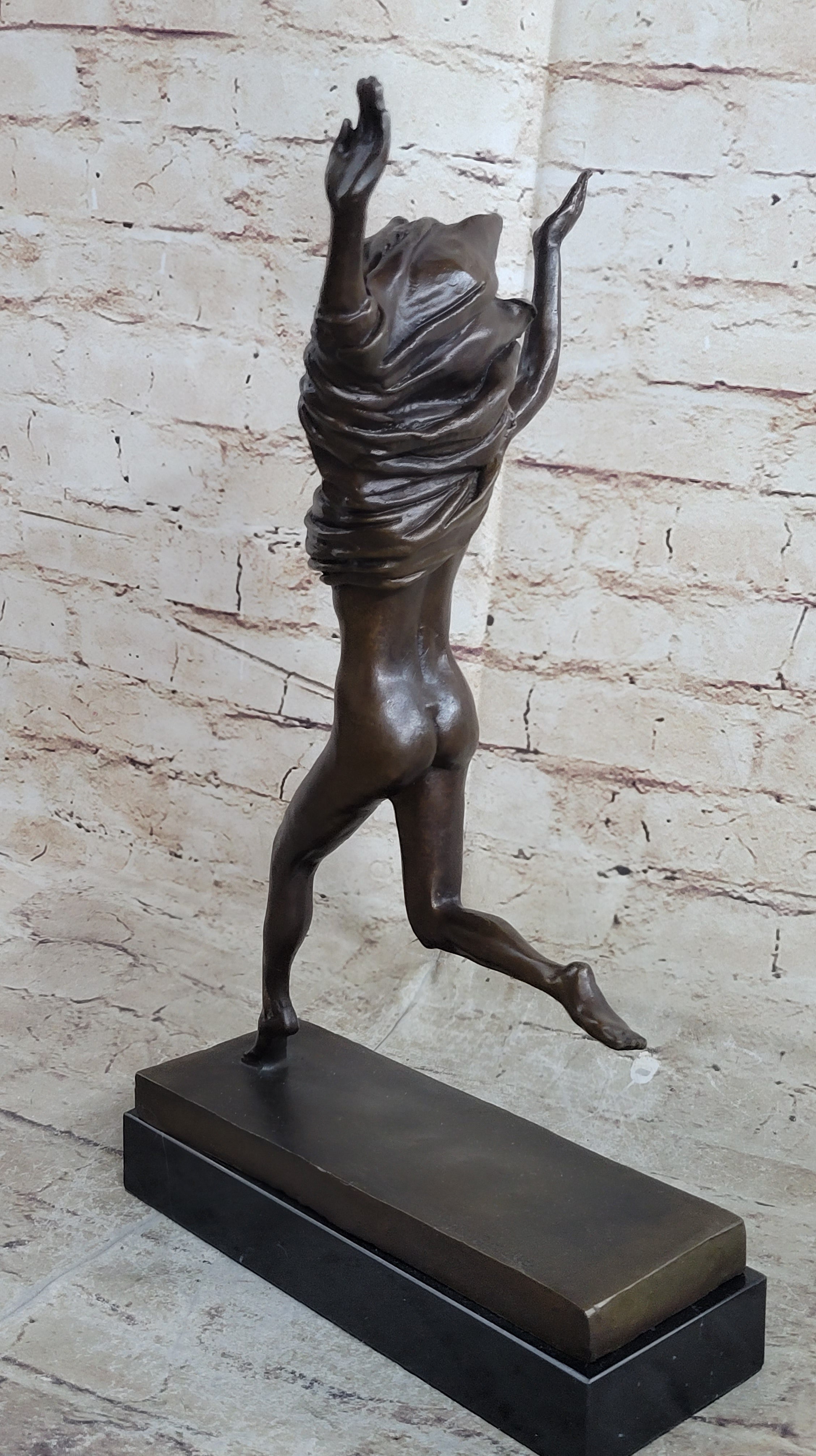 This captivating bronze sculpture portrays a nude woman running through the streets, enveloped in a flowing cloth that covers her head. With grace and power, she attempts to break free, as her left hand peeks through the top of the fabric. Her body exudes dynamic tension as she stretches her pointed legs in opposite directions—one long leg extended vertically, while the other rests tiptoed on the ground, forming a perfect 90-degree angle.