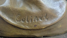 Ease and composure emanate from this Art Nouveau sculpture. It`s a wonderfully designed and executed work of art, from the delicately poised stance of the woman with both arms above her head, to the immense details of her garment exposing most of her body. Her face stays focused on a point ahead of her in a look that seems to emanate intense confidence and concentration, further complemented by her regal pose and decorative headpiece. Simply marvelous. Cast in bronze, set atop a black ornamental marble base and is signed E. Segar. This piece is a must-have that will surely be a treasure for years to come. Get one for the refined lady in your life.