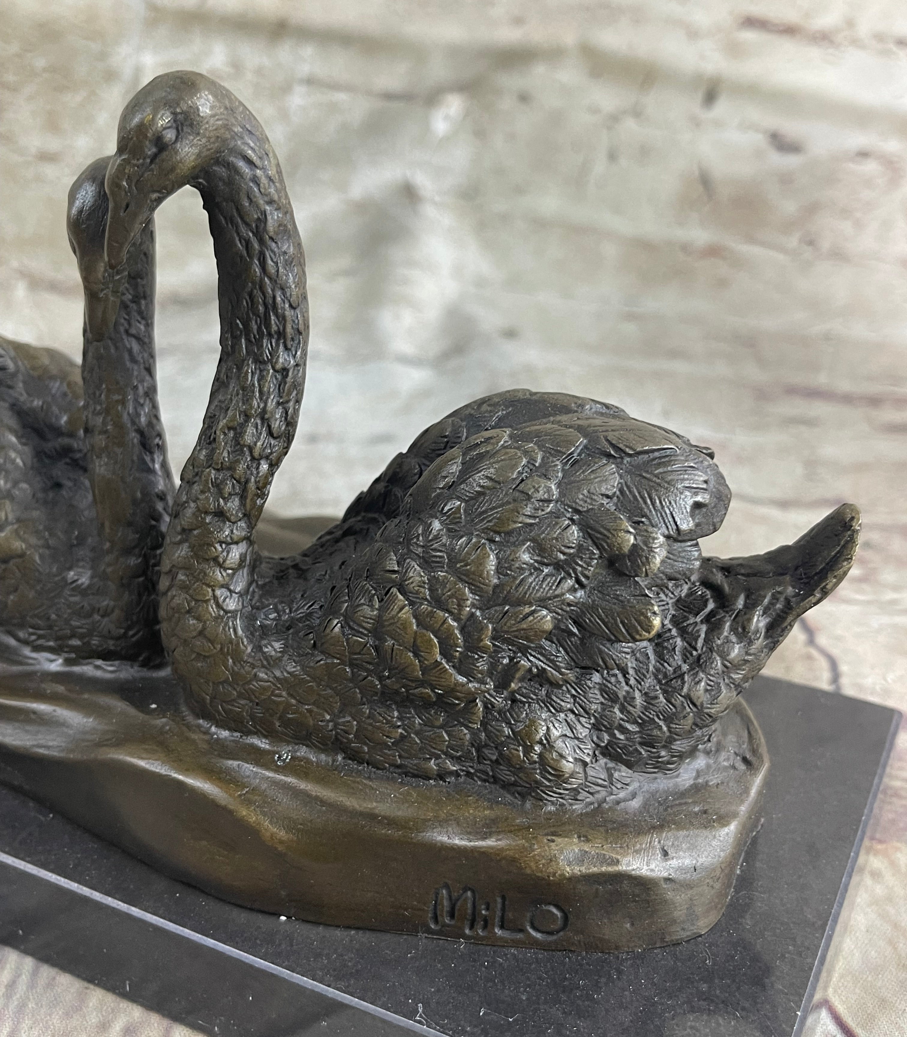 Beautiful and detailed statue of two SWAN, posing up in nest of branches and flowers. Elegant with a majestic and mistic position as if they ready to be in love and conquer new horizons ! These birds are well detailed. The body proportions are excellent, the featherly body details and the tail are lovely! It has been cast of the finest pure bronze by the talented artisans working in our European art foundry, and features great attention to detail. Signed by Artist Milo.Bronze Dimensions with Marble Base:Height 5 1/2" x Width 7 1/2"