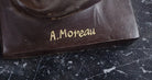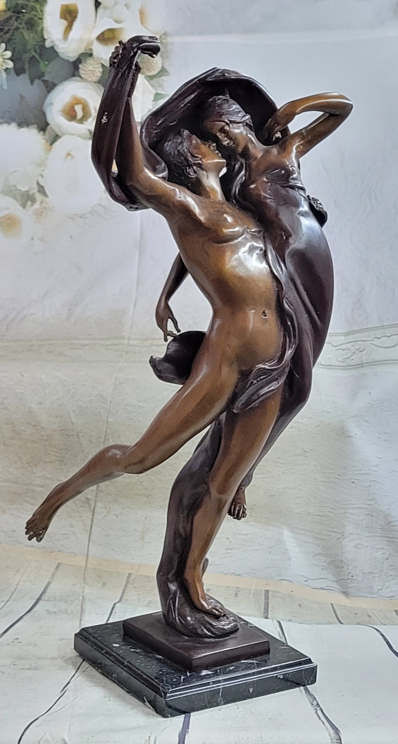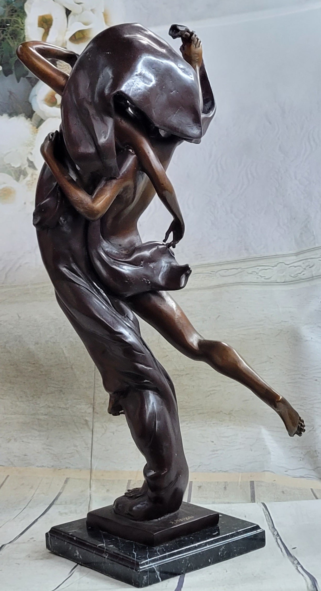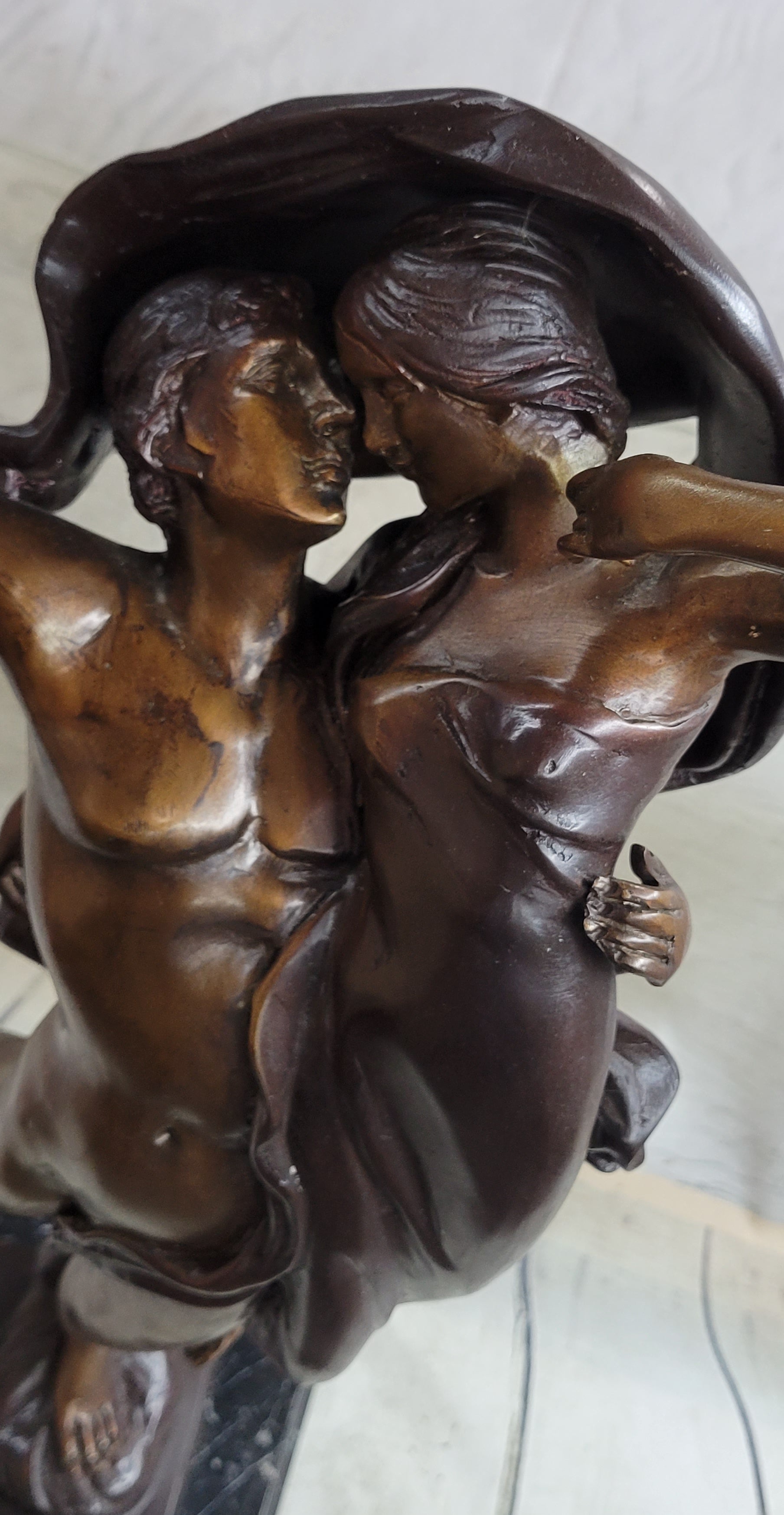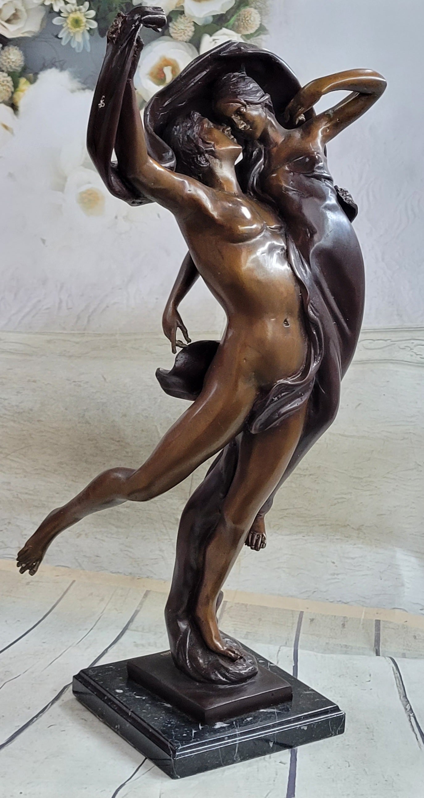 A loving couple shares a tender embrace. Lifelong soul mates cling to each other in a lover's waltz. He stands beside her and cradles her fragile body in his arms, lifting her gently from the ground. Their bodies move in unison. Her flowing dress, drapes over his nude body. They gaze deeply into one another eyes, sharing every breath and heartbeat. 100% bronze and handmade, this two-toned brown patina sculpture was cast using the "Lost Wax Method" and mounted on a marble base and is signed A. Moreau.Bronze Dimensions with Marble Base:Height 24" x Width 11"