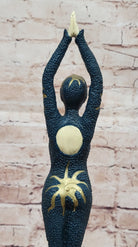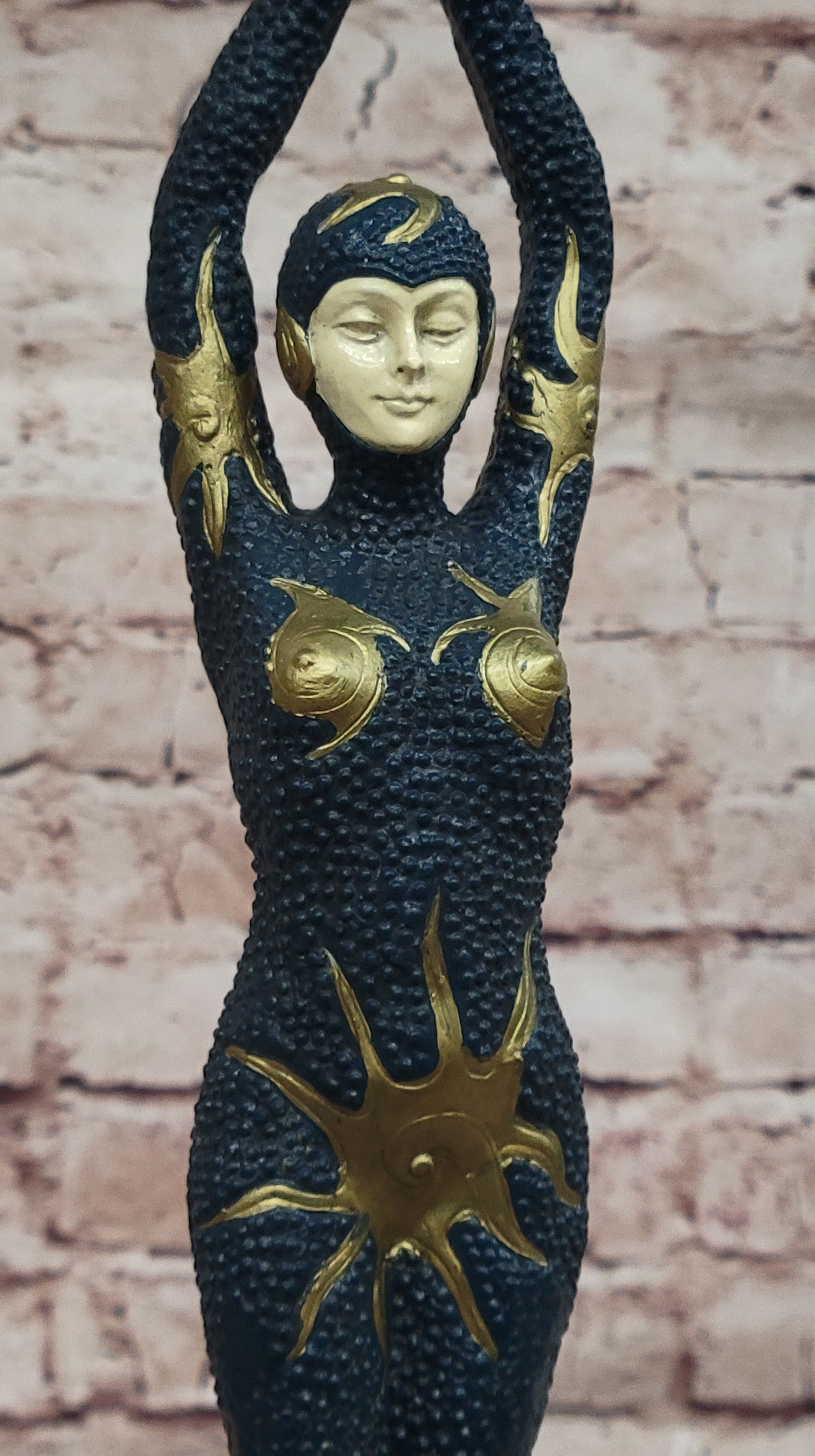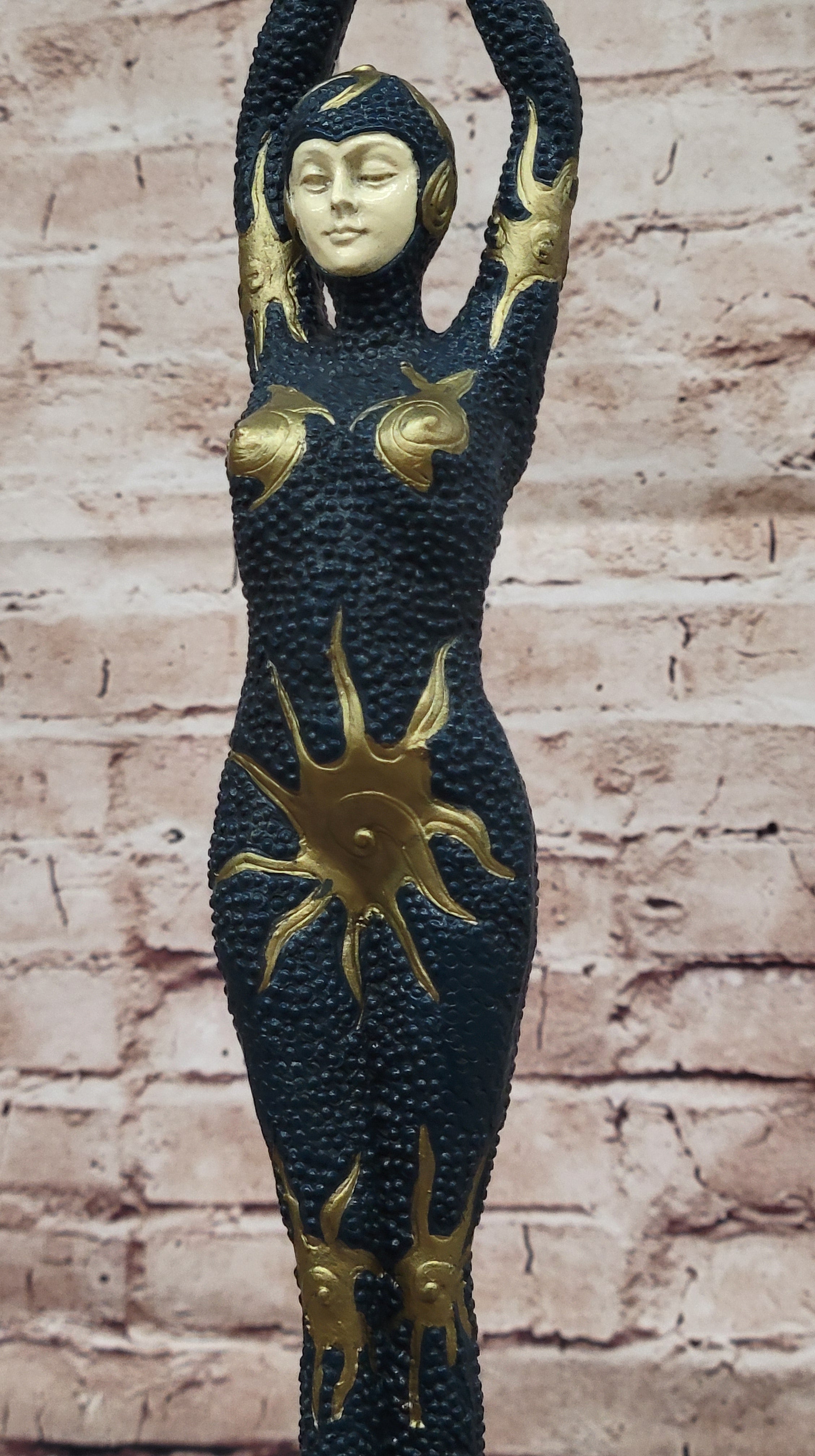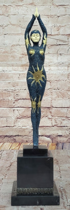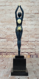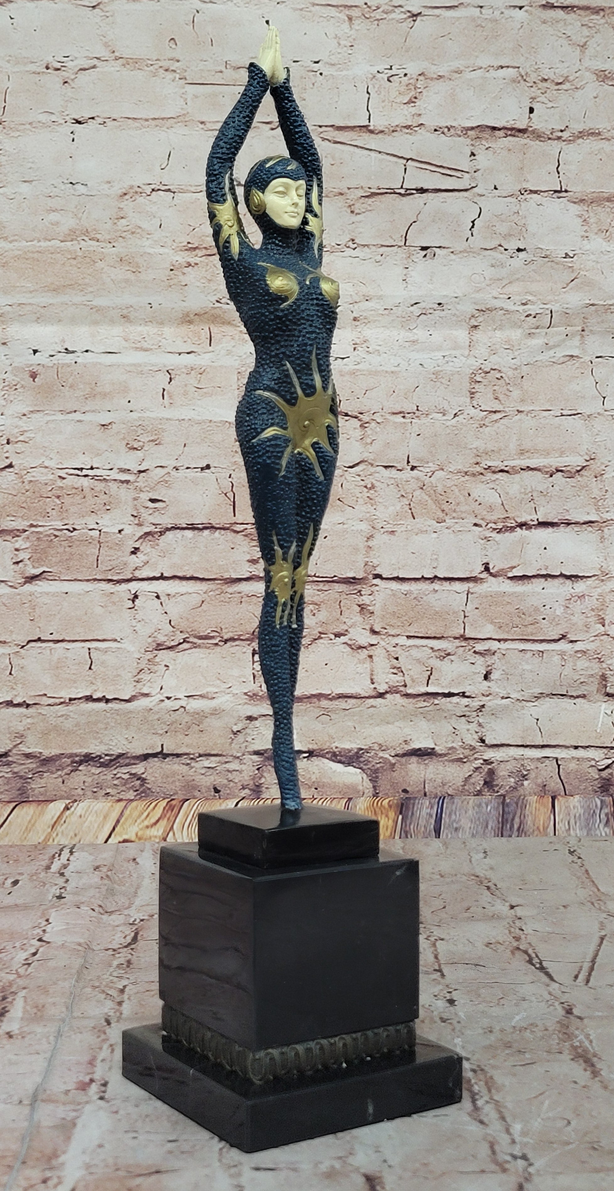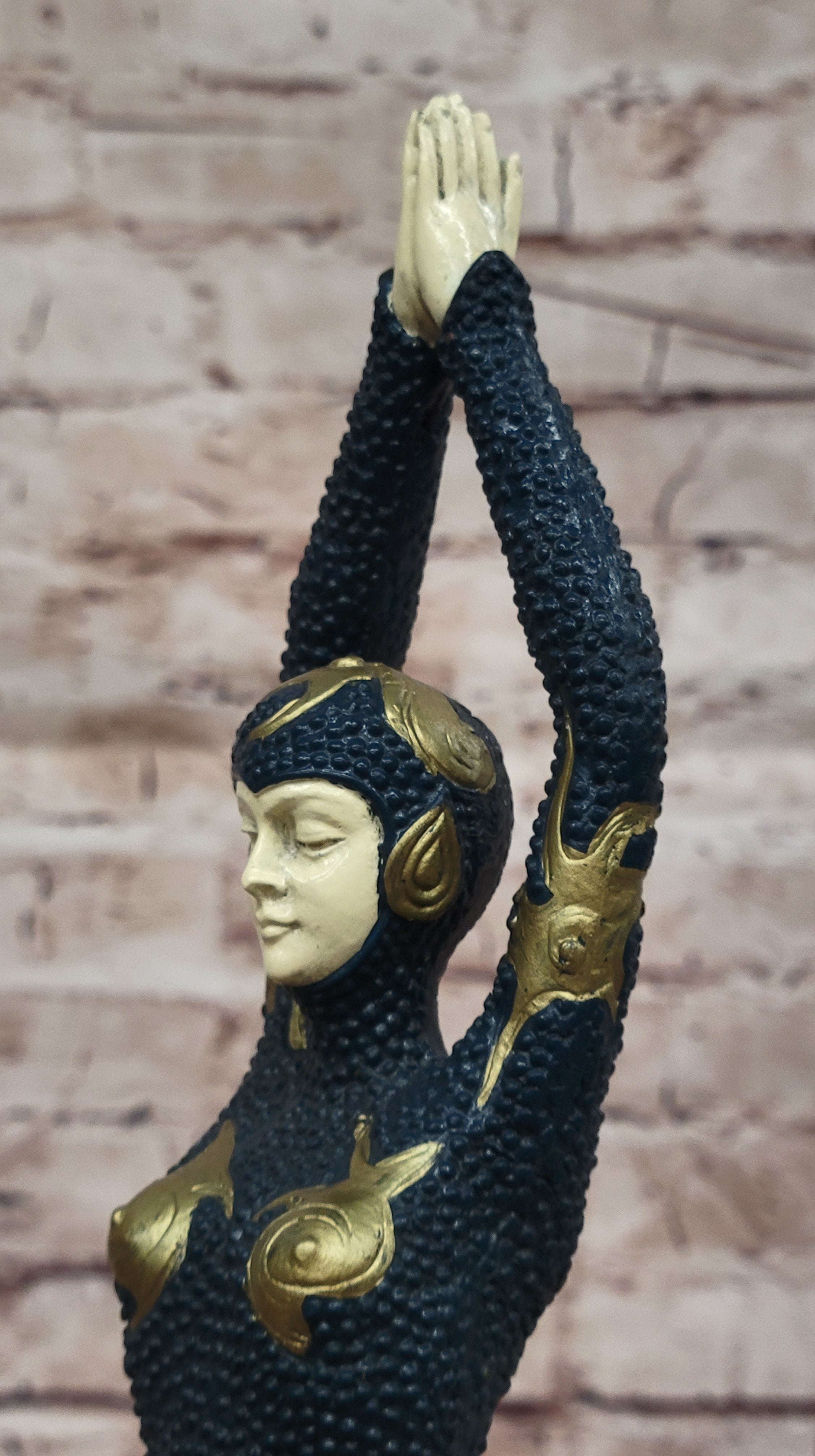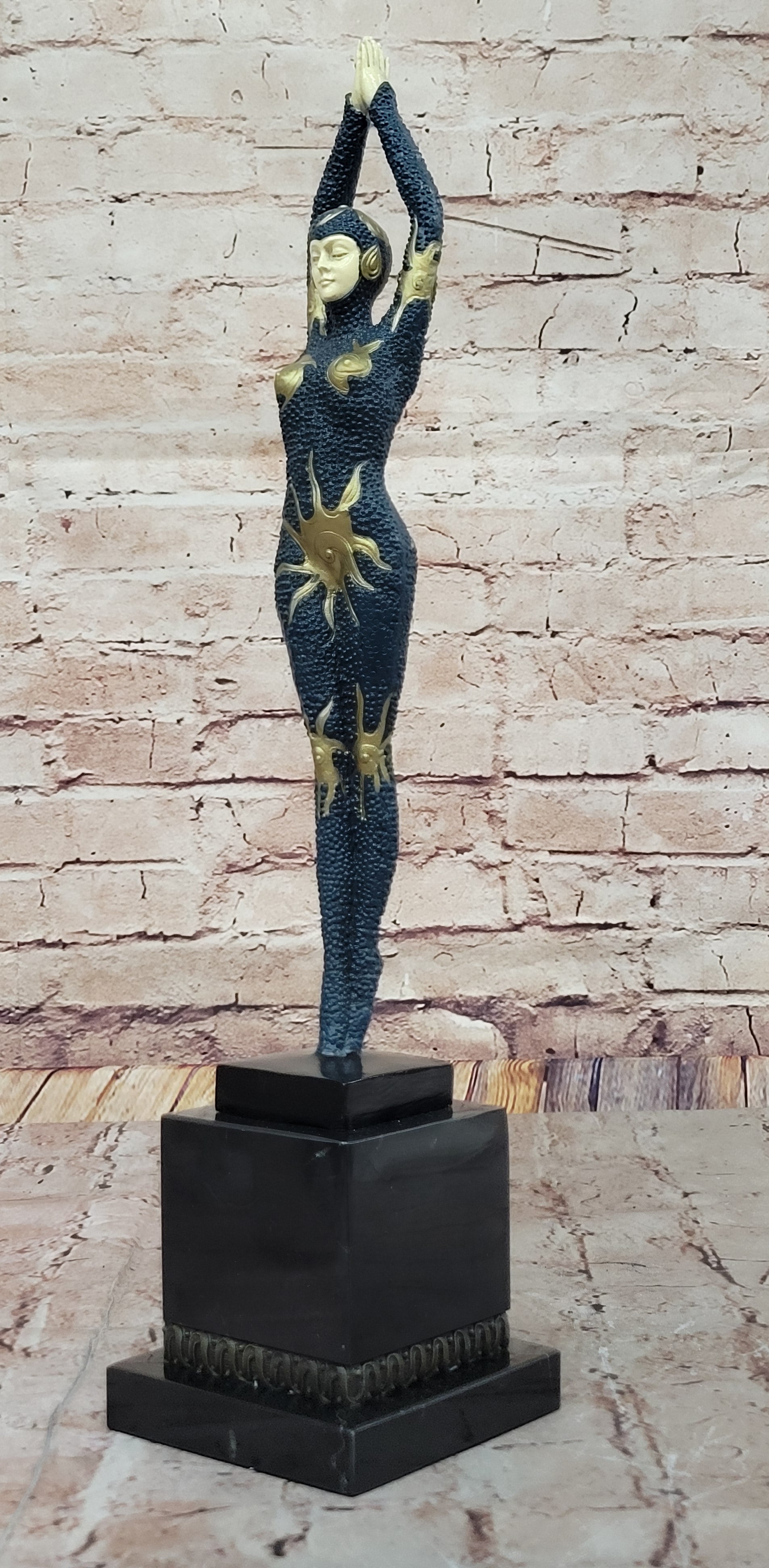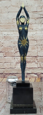 This stunning bronze sculpture captures the elegance and poise of a female Egyptian dancer, delicately balanced on tiptoe in a graceful pose. Her intricate outfit, adorned with starfish decorations, adds a touch of exotic charm and enhances the fluidity of her movement. Every detail of her posture and attire reflects the timeless allure of Egyptian artistry, blending seamlessly with the refined aesthetics of the Art Deco era.