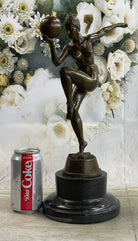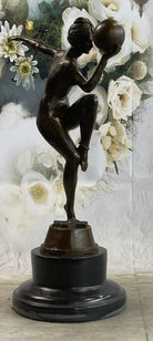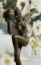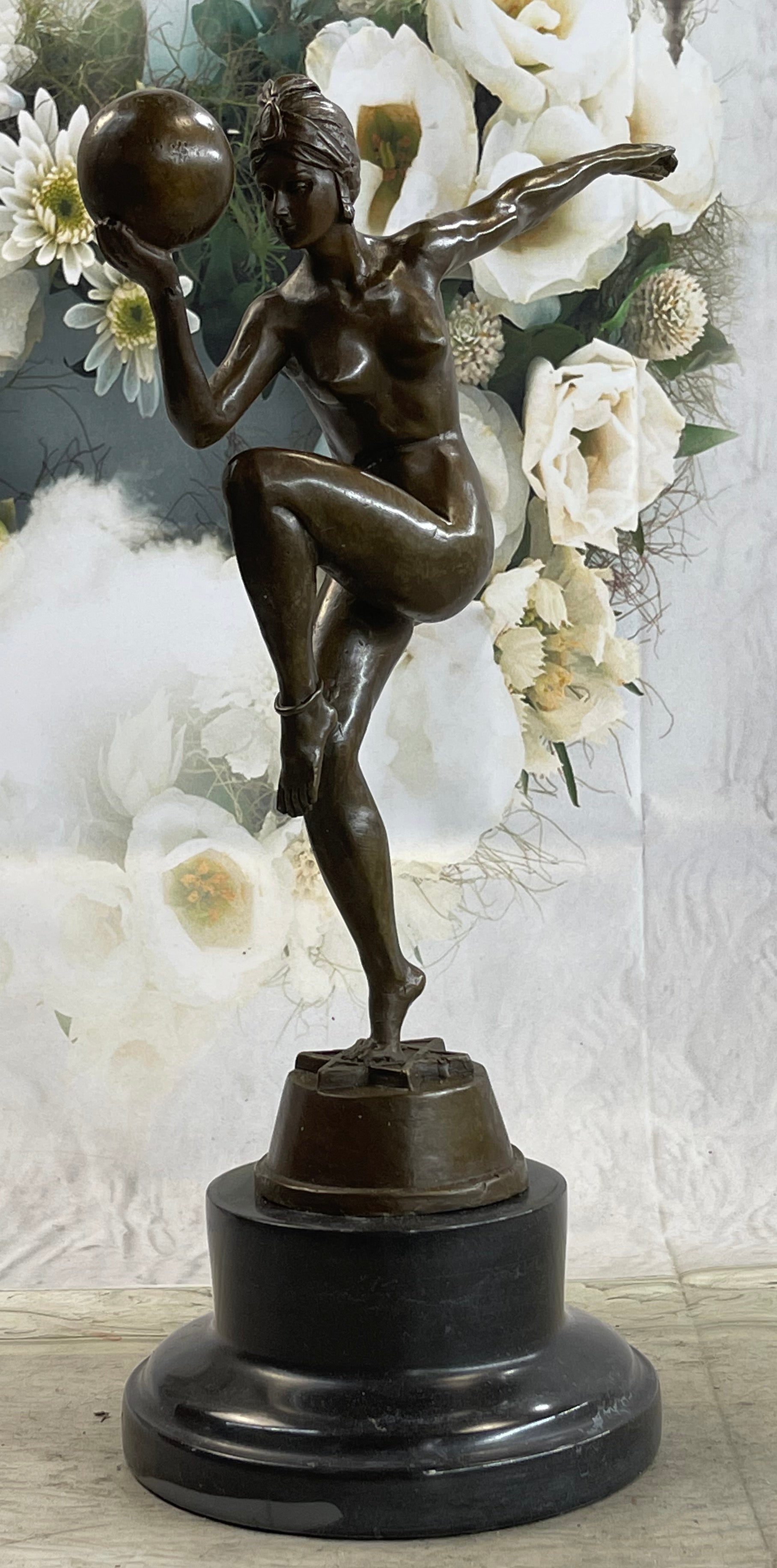 This captivating bronze statue, titled "Turbaned Ball Star" and crafted by artist Maurice Riviere, presents a striking portrayal of a balancing nude woman. Handmade using the esteemed lost wax method, this sculpture captures the artist's attention to detail and skill in depicting the human form. The woman, adorned with a turban, balances effortlessly as she holds a ball, showcasing her poise and grace.