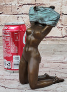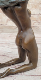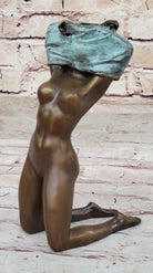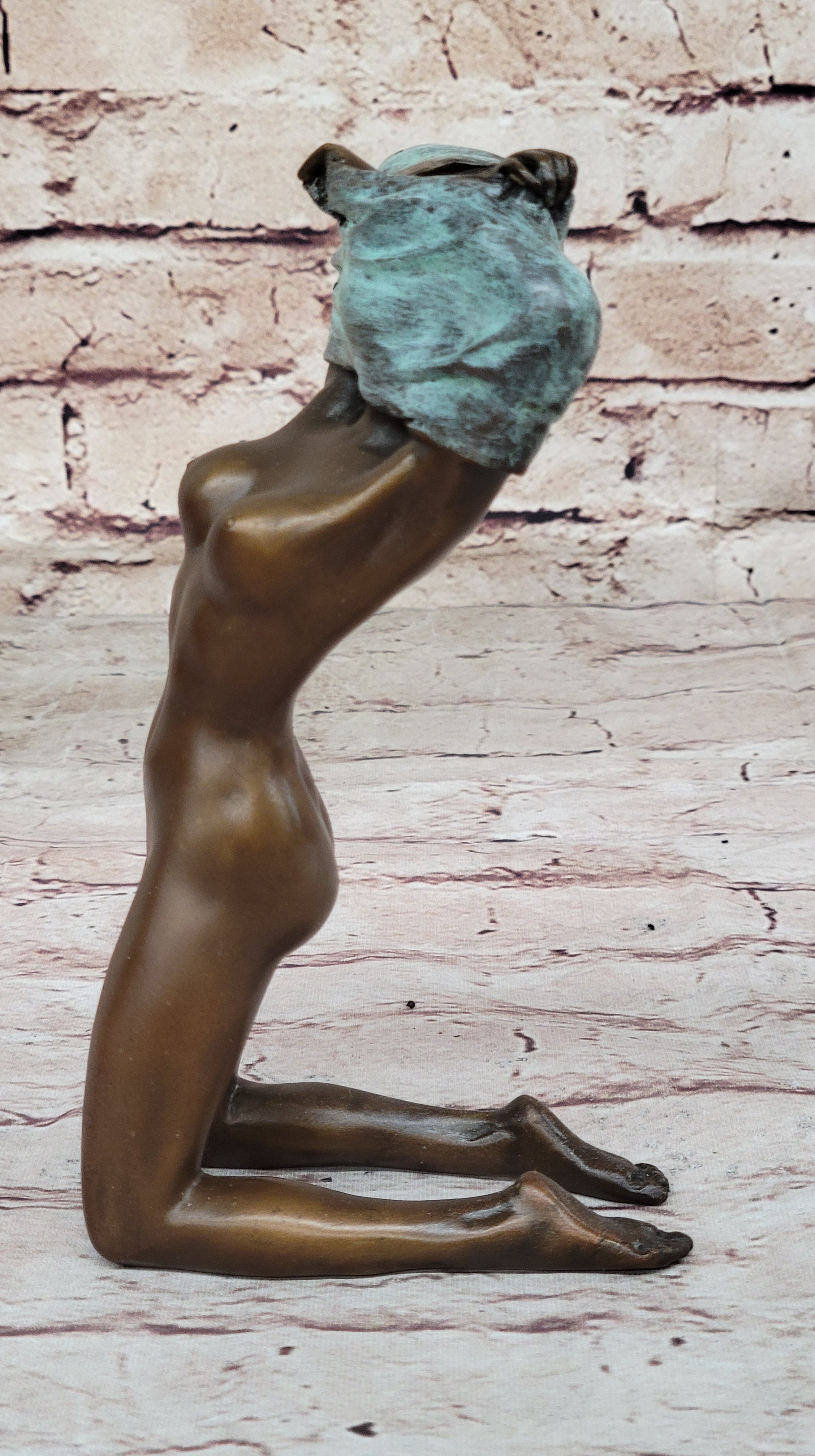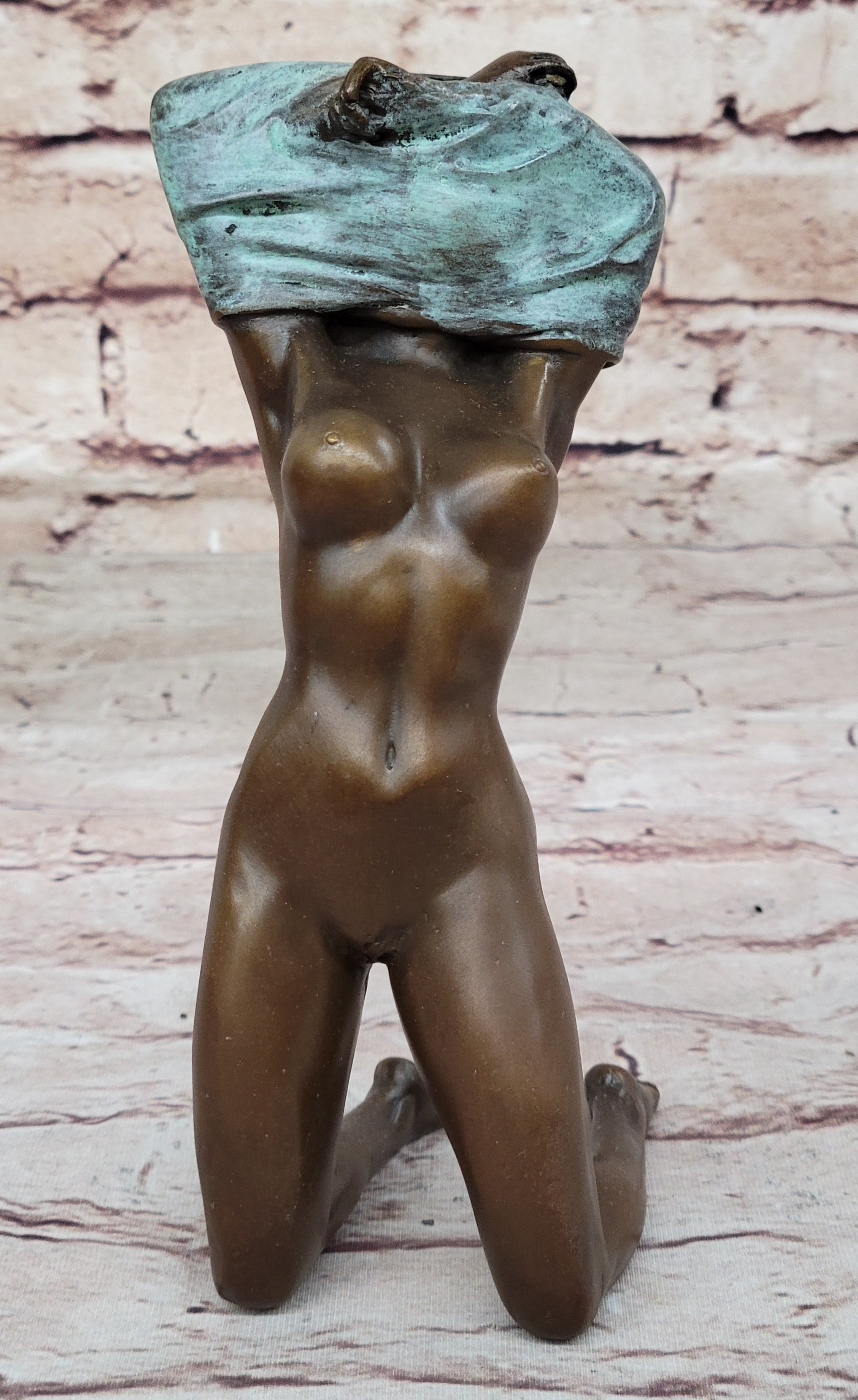 Introducing an alluring bronze sculpture that embraces the sensual beauty of the female form. This captivating piece depicts a woman in a kneeling pose, delicately removing her clothing to reveal her ample breasts. Every curve of her body accentuates her femininity, from the voluptuous breasts to the small waist and plump derriere, captivating viewers with its tactile allure.