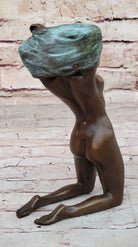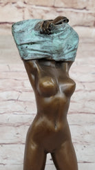 Created using the traditional lost-wax casting method, this sculpture embodies the timeless artistry and craftsmanship. The meticulous attention to detail is evident in the intricate contours of the woman's figure, bringing to life the sensuality and allure of the human form. The sculpture features a brown patina finish that enhances the warmth and lifelike quality of her skin, while her shirt is coated in a contrasting green patina, adding depth and visual interest to the piece.