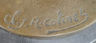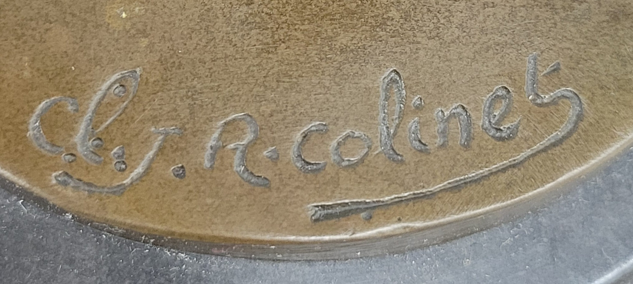 Resting proudly on a round black marble base, the sculpture becomes a captivating focal point. The choice of the brown patina adds depth and warmth to the bronze, enhancing the overall appeal of this fine art piece. The handcrafted nature of the sculpture ensures that each curve and contour is delicately preserved, allowing for a unique and authentic representation of Colinet's vision.