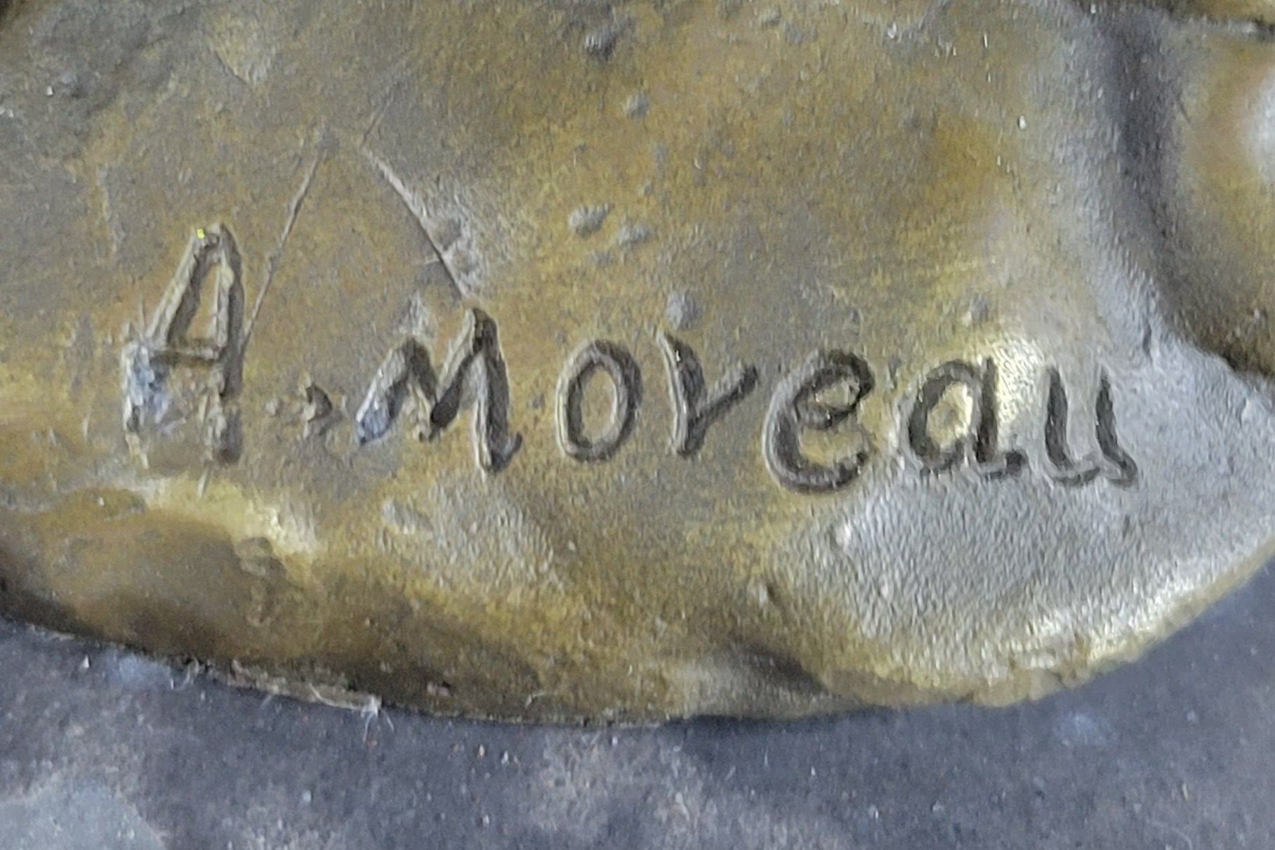 The captivating allure of this exquisite art nouveau dancer sculpture is a testament to the harmonious blend of fine craftsmanship and sheer presence. Whether one is drawn to the intricate details of the sculpture or the undeniable charisma exuded by the art nouveau dancer, the piece effortlessly captivates the observer. The lithe figure, adorned with flowing tresses, is expertly captured in quality bronze, positioned atop a circular marble base designed for admiration from every angle within your home or gallery. The meticulous attention to detail is evident in the marvelous use of varied patina hues, enhancing the bronze sculpture with a realistic presence reminiscent of the 1920s. The artist's skill is showcased through the beautifully detailed and well-proportioned rendering of the mademoiselle, setting this piece apart from re-casted bronzes. Crafted in Europe with longevity in mind, the sculpture bears the signature of A. Moreau, indicating its quality and artistic pedigree. These castings exemplify a singular quality achieved through the lost wax bronze casting method. Employing various techniques to produce a range of polychrome finishes, each piece undergoes meticulous craftsmanship to achieve classic proportions. The marble bases further contribute to the opulence and richness of the overall effect, creating a bronze sculpture that stands as a masterpiece of refined artistry.