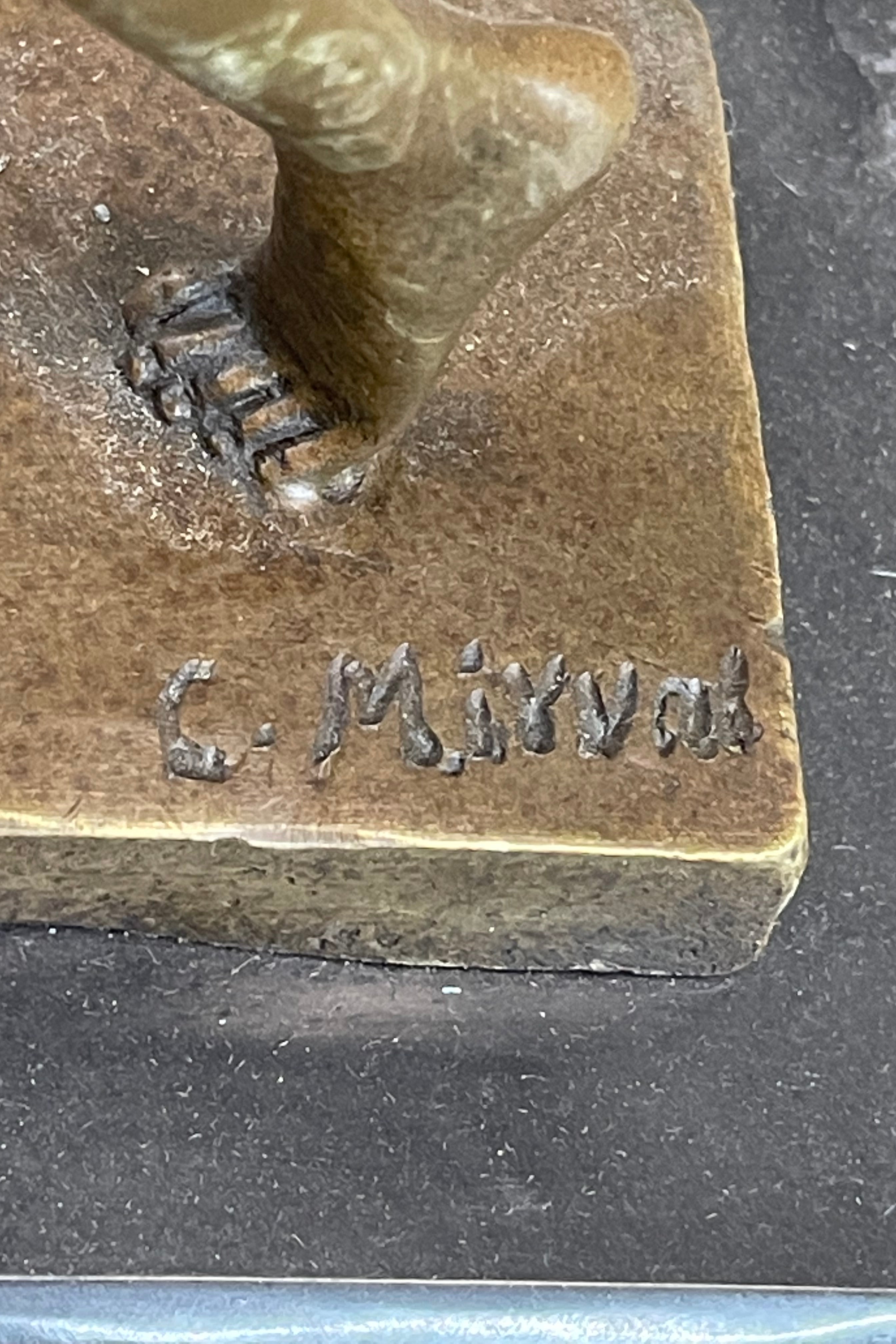 Mounted on a marble base, this sculpture not only celebrates the art of belly dancing but also serves as a testament to the skilled craftsmanship involved in the creation of bronze sculptures. Signed by the artist C. Mirval, this piece is a delightful addition to any collection, captivating viewers with its dynamic portrayal and vibrant details.Bronze Dimensions with Marble Base: Height 17" X Width10"