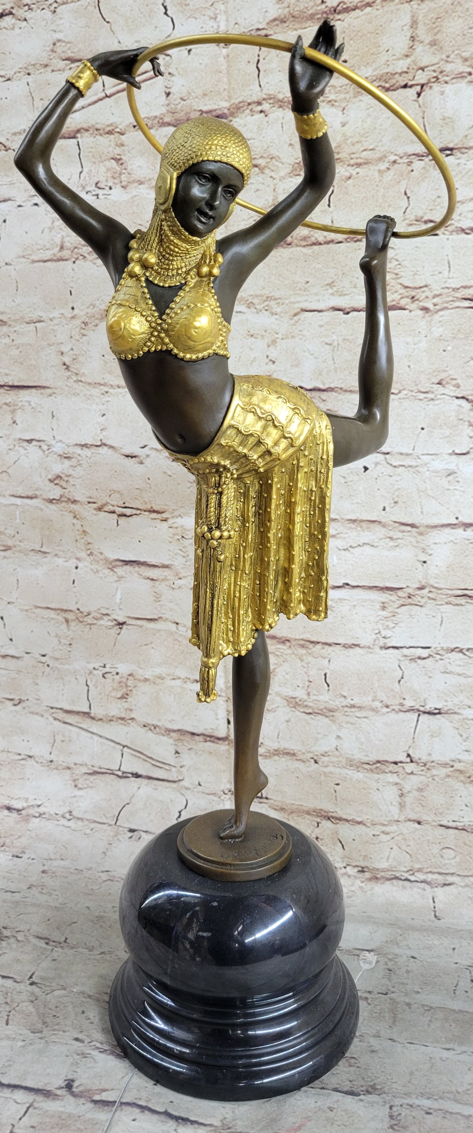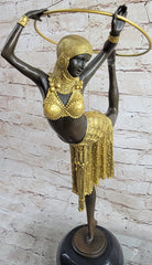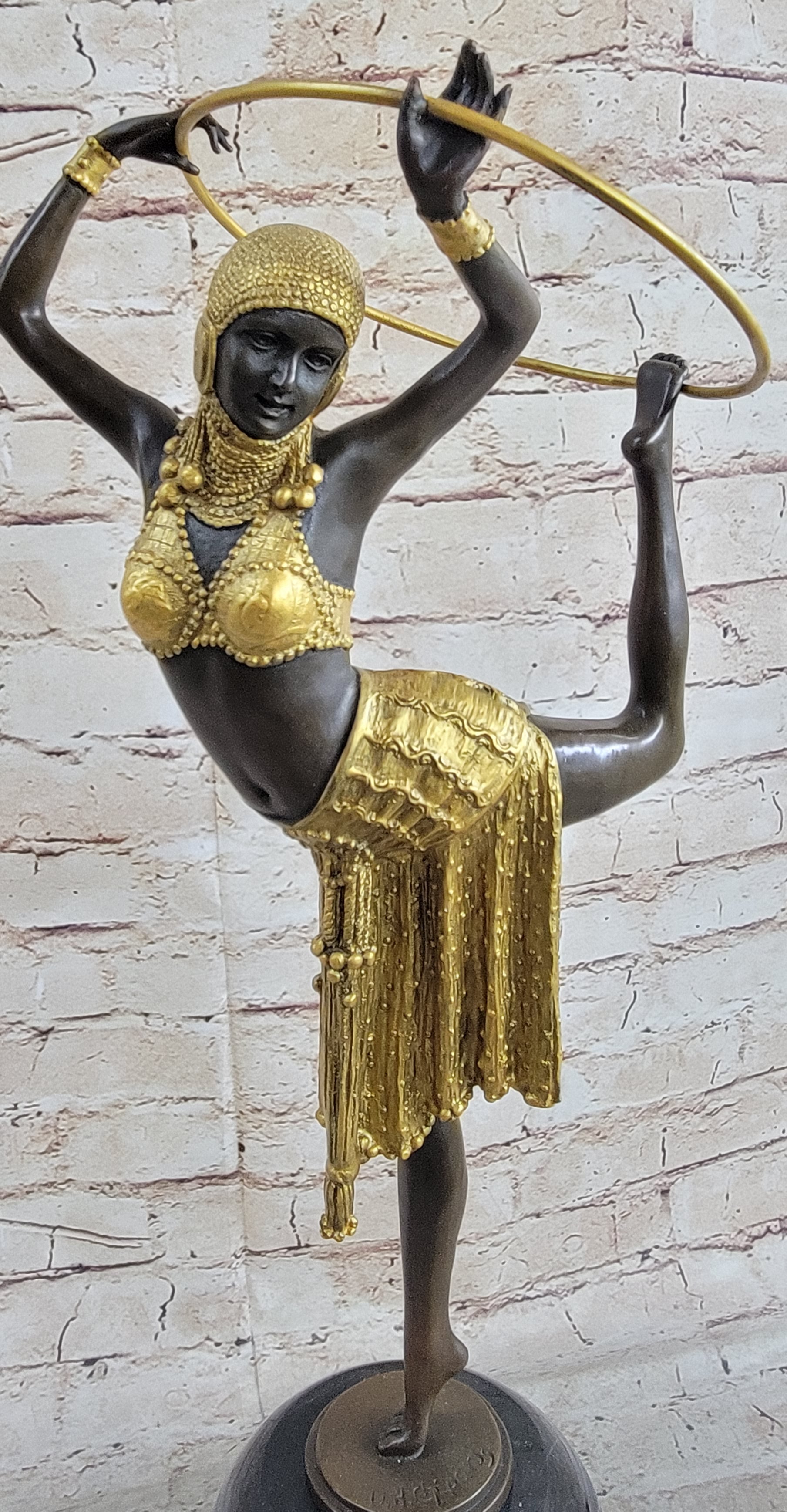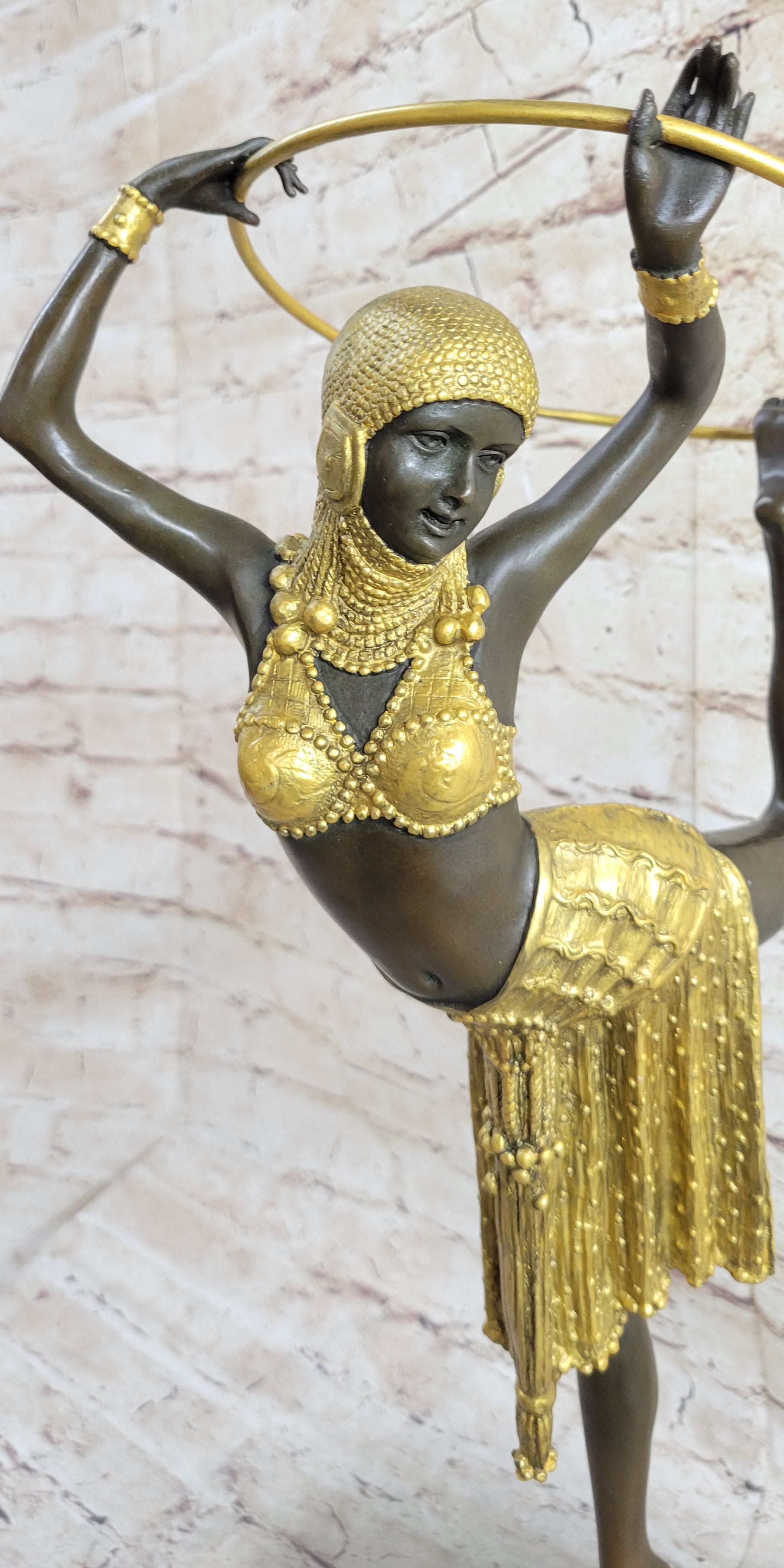 Flexible and nimble on the tips of her dancers toes, this graceful belly dancer will remind you of the scandalous Mata Hari. She twirls a hoop above her head, stretching her long leg behind her and looping her toes through the center, resting them on the rim. Her delicate hands don’t grip the hoop, allowing it to glide through her palms. She wears a beaded headdress that covers her entire head and neck. Her bra and shimmy skirt are beaded as well, leaving her round belly exposed. Her skirt flows down the length of her leg with the fine detail of the sequins on it. A thick sash wraps around her curvy waist and the strings are gathered together in the front. 100% bronze and handmade, this brown patina sculpture was cast using the “Lost Wax Method” and is mounted on a round black marble base. This sculpture was signed by the artist D.H. Chiparus.Bronze Dimensions with Marble Base: Height 20 " x Width 10"