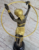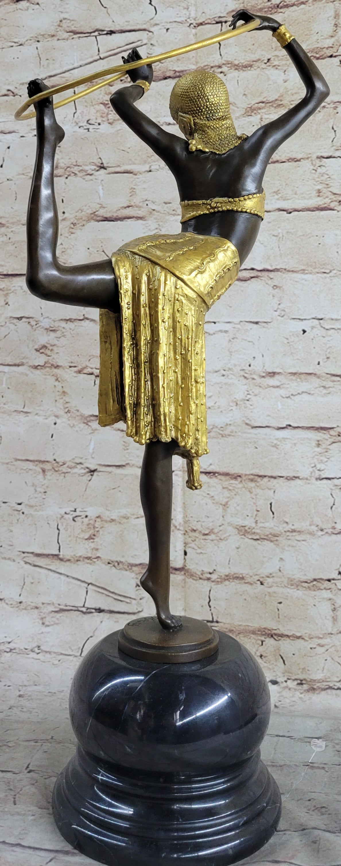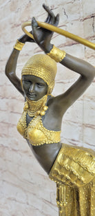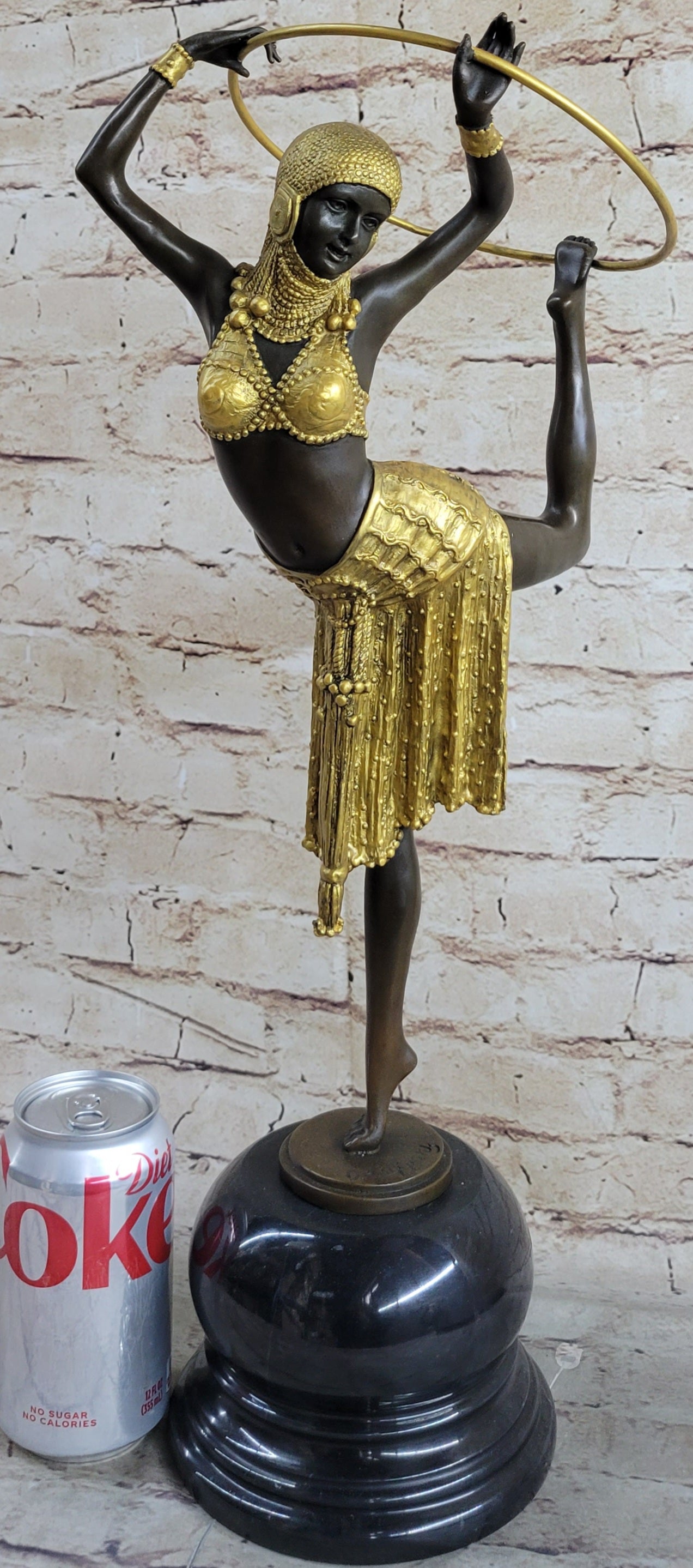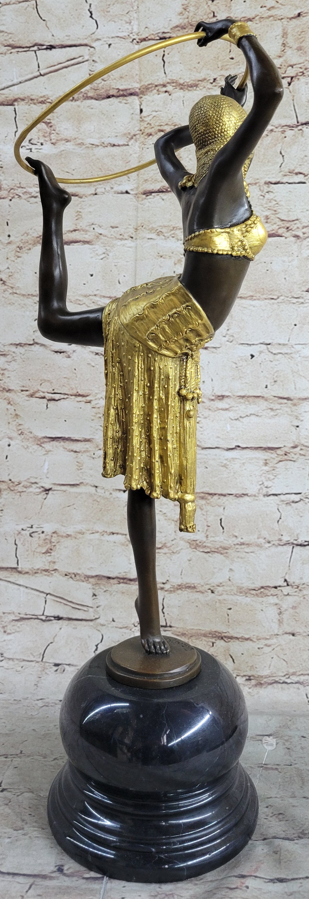 Flexible and nimble on the tips of her dancers toes, this graceful belly dancer will remind you of the scandalous Mata Hari. She twirls a hoop above her head, stretching her long leg behind her and looping her toes through the center, resting them on the rim. Her delicate hands don’t grip the hoop, allowing it to glide through her palms. She wears a beaded headdress that covers her entire head and neck. Her bra and shimmy skirt are beaded as well, leaving her round belly exposed. Her skirt flows down the length of her leg with the fine detail of the sequins on it. A thick sash wraps around her curvy waist and the strings are gathered together in the front. 100% bronze and handmade, this brown patina sculpture was cast using the “Lost Wax Method” and is mounted on a round black marble base. This sculpture was signed by the artist D.H. Chiparus.Bronze Dimensions with Marble Base: Height 20 " x Width 10"