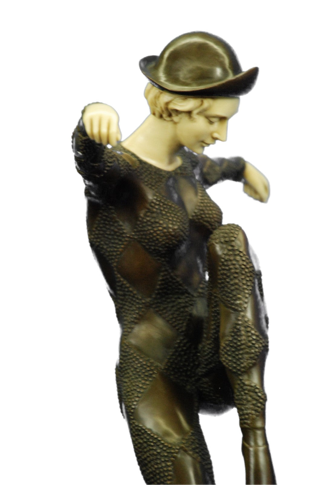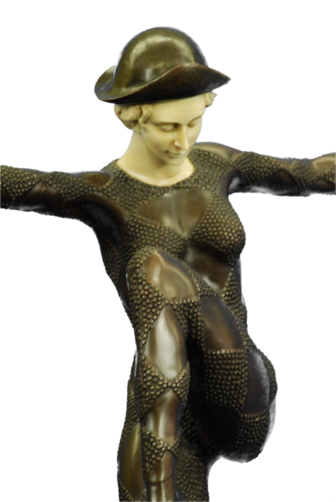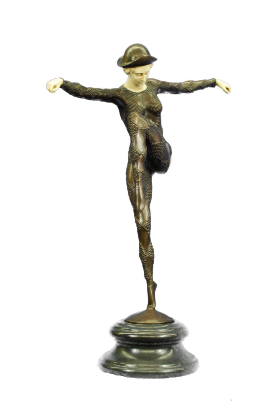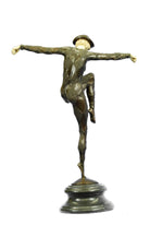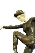 An exciting bronze study of a dancer in dramatic balanced pose and wearing a full dance costume from the Paris Dance Halls of the Art Deco era. The figure is raised on black marble plinth. Signed D.H. Chiparus.Bronze Dimensions with Marble Base:Height 28" x Width 20"