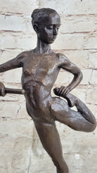 Crafted using the revered "Lost Wax Method," this sculpture pays homage to age-old techniques that result in a striking work of art. The brown patina finish preserves the sculpture's form and adds depth to its details. Every aspect of this piece, from its handmade creation to its intricate design, showcases the artist's dedication to capturing movement and emotion in bronze. Mounted on a black marble base, this sculpture stands as a testament to the artist's skill and vision.
