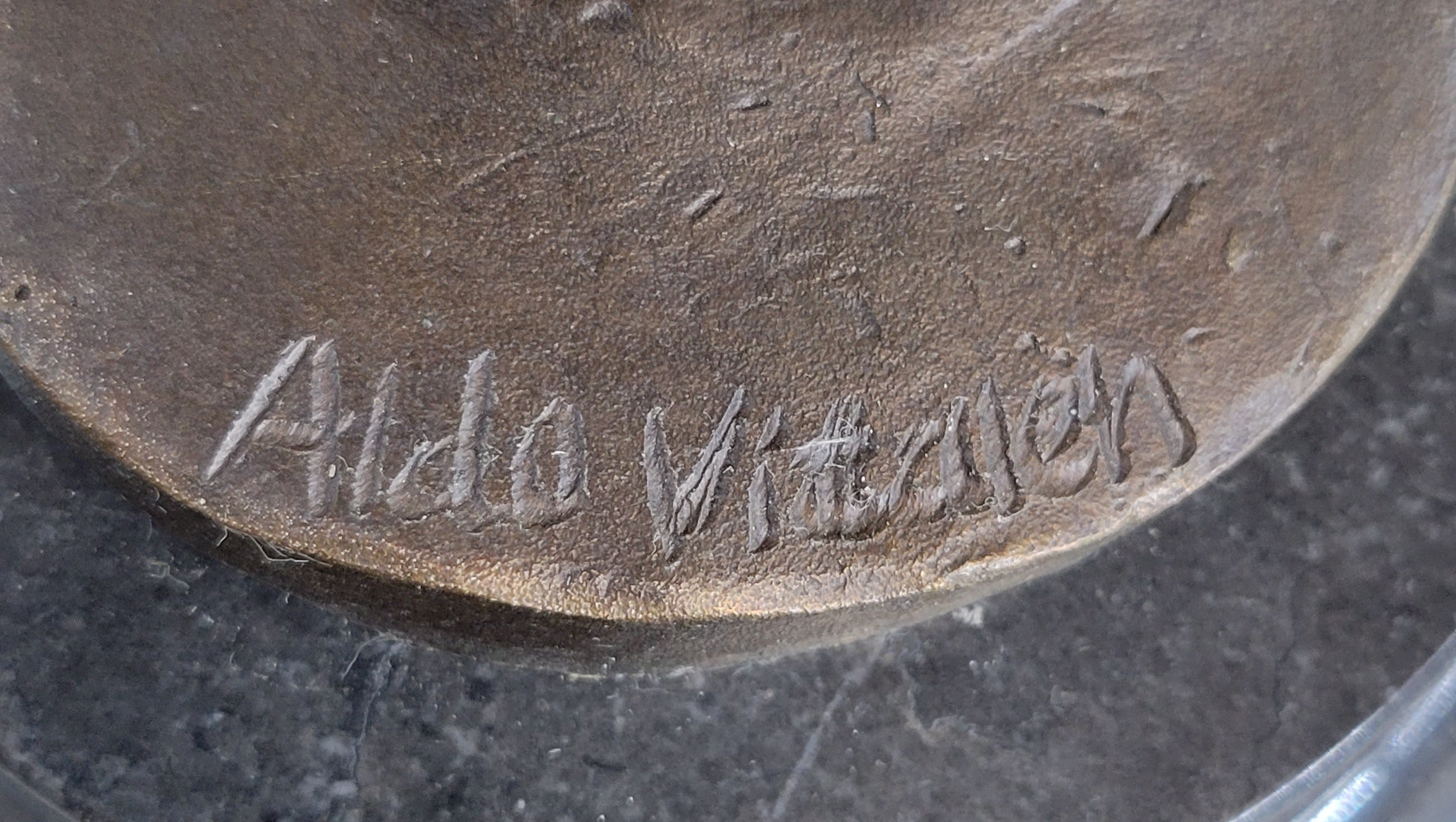 Aldo Vitaleh's signature adorns this masterpiece, marking it as an authentic representation of his artistic talent. This sculpture's fusion of modernity and timeless artistry makes it a captivating addition to any art collection, a reflection of the female form's beauty and the artist's creativity.Bronze Dimensions with Marble Base: Height 14" X Width 8.5"