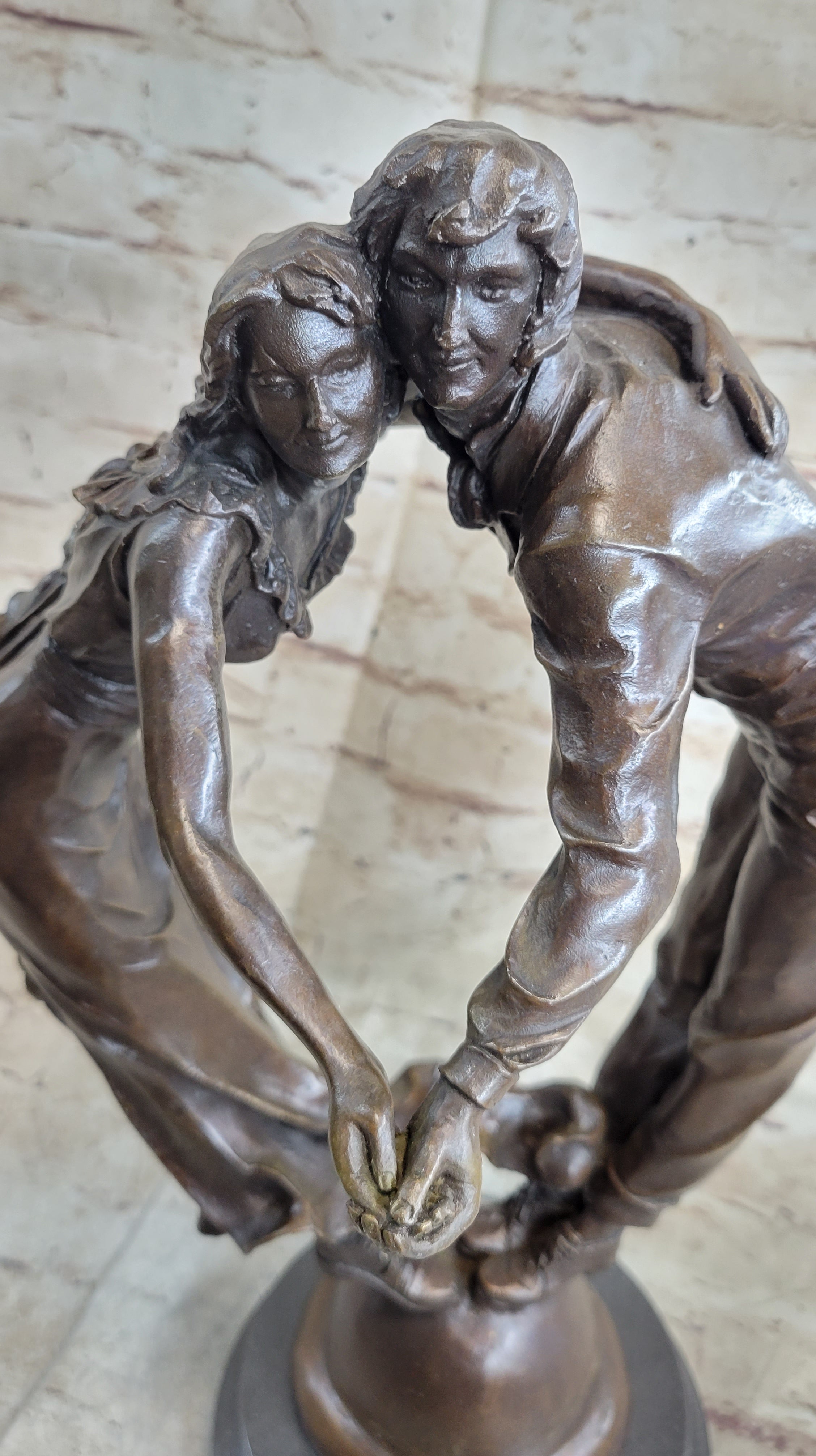 Immerse your space in the timeless elegance of this exquisitely detailed bronze statue capturing a couple in the midst of a graceful dance. The duo holds each other's hands, their heads close together, creating an intimate and connected moment. The woman's dress, which gracefully falls to the floor and ties around her waist, exhibits intricate details, particularly in the finely crafted collar, adding a touch of sophistication to the scene.