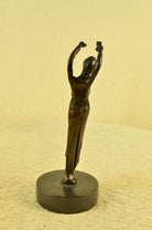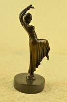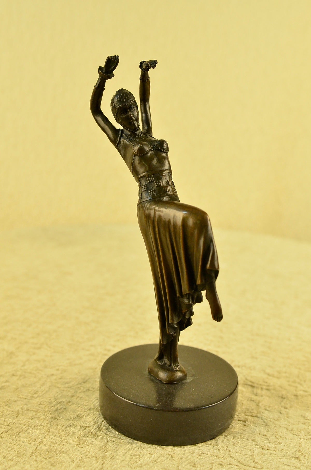 The Bronze, Charming Dancer Is Caught In A Spirited Dance For An Audience. Her Arms Are Expressively Suspended In The Air. Her Right Bended Knee Rises To Then Fall Forward To Make Her Next Dance Step. True To Chiparus`S Style, She Is Inspired By The Russian Ballet Dancers, With The Influences Of The Different Cultural And Historical Designs That Fall Under Art Deco. She Was Captured Using The Archaic Methods Of Lost-Wax Casting And Stained With A Brown Patina Tarnish. She Dances Upon A Black Marble Base With The Artist Demetre Haralamb Chiparus`S Signature.Bronze Dimensions with Marble Base:Height 9 1/2" x Width 4"