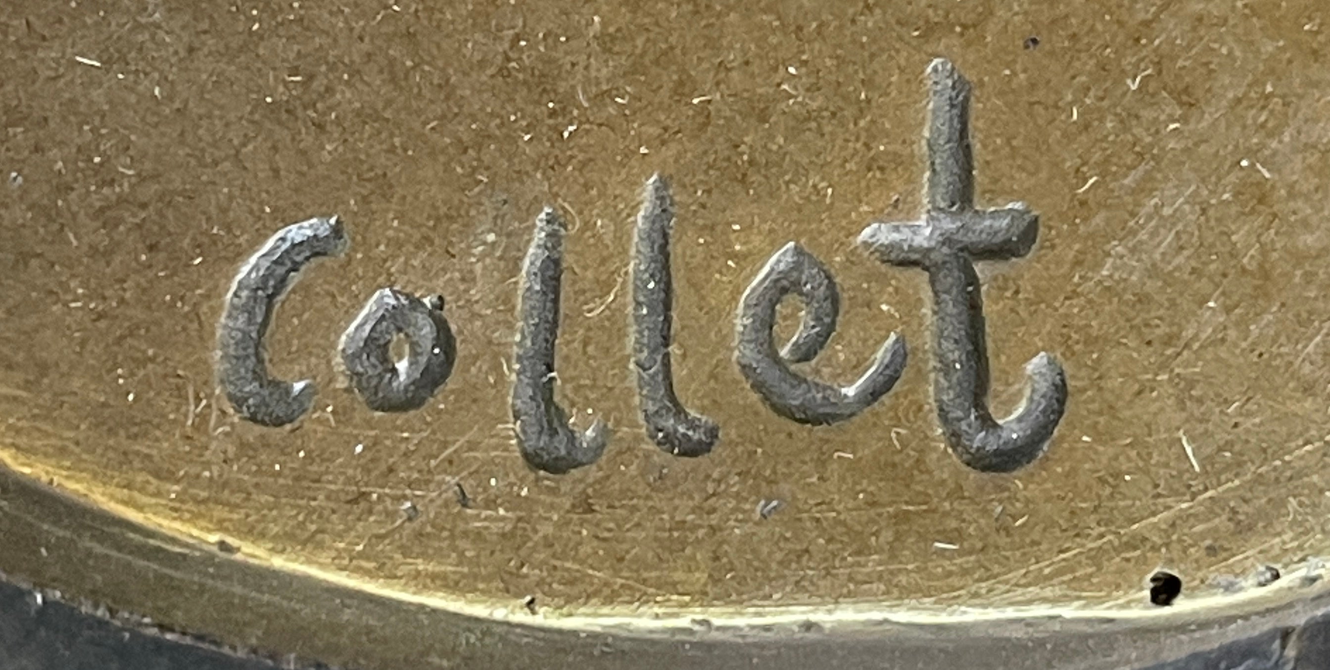 This is a captivating bronze study of the beautiful ballet dancer Natacha Nattova and a depiction of the dance she performed in front of a Prussian Prince who was so captivated that he asked to marry her. When you look over the sculpture and the depth and warmth of the patina meet your eye, it sends a sense of calmness and gracefulness. It’s almost as if the sculpture is a picture of a lullaby in still motion. She points her toe, carefully and gracefully she turns her body, even her fingers are positioned in a polite manner. Her beautifully proportioned body is accented by the ballet dress she wears. Creasing with gravity and fluid movement, the bodice is similar to a corset adorned with beautiful roses by her left shoulder. The skirt is wide and flowing at the hips giving nice dimension to the dancer. On her feet she wears ballet slippers that criss- cross around her ankles and tie. Her hair is tied back split into pigtails and tied up again into such fine proper buns. Her face has delicate features, with high cheeks bones, a small pointy nose, wide innocent accepting eyes and a smile that cannot be forgotten, it’s no wonder why the prince asked for her hand in marriage.You will find the artist signature in the base of the sculpture. The bronze sculpture has a brown patina and is mounted on a round circular marble base and signed by artist Collet.
