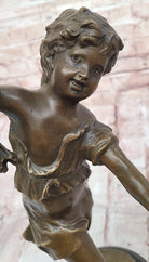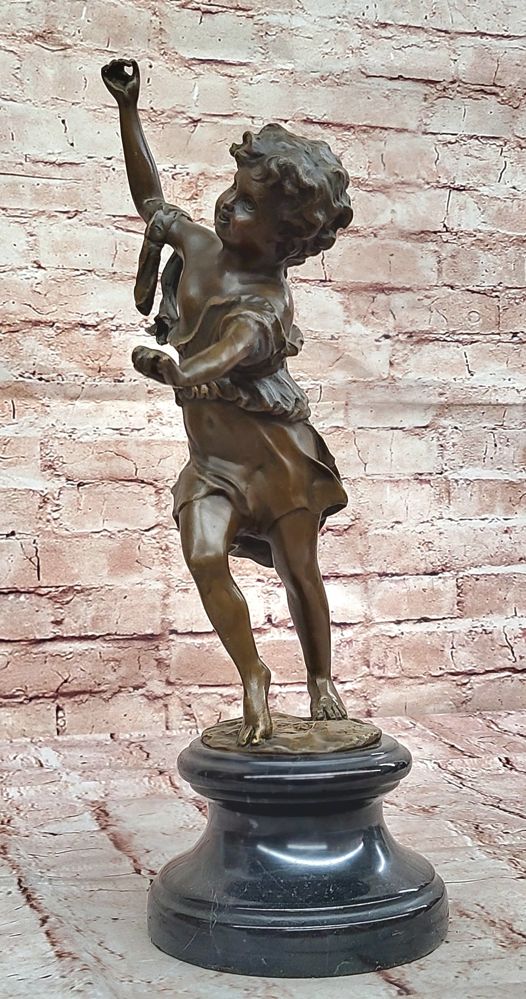 This delightful bronze sculpture titled Happy Child Dancing by Moreau captures the pure joy and carefree spirit of childhood. The young figure is depicted mid-dance, radiating energy and innocence through expressive posture and dynamic motion. The artist beautifully conveys a sense of movement and playfulness, making this piece a charming tribute to youth and happiness.
