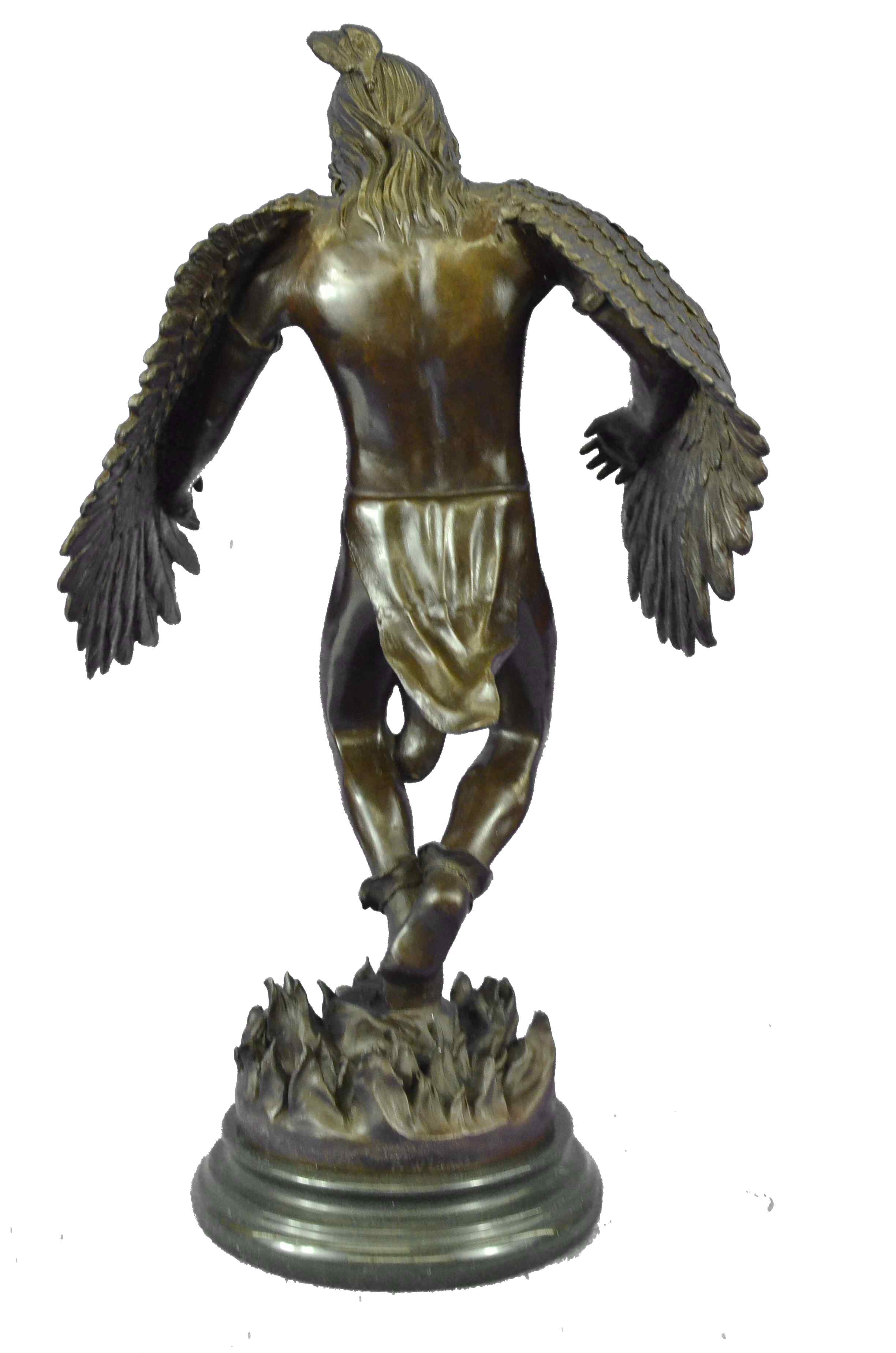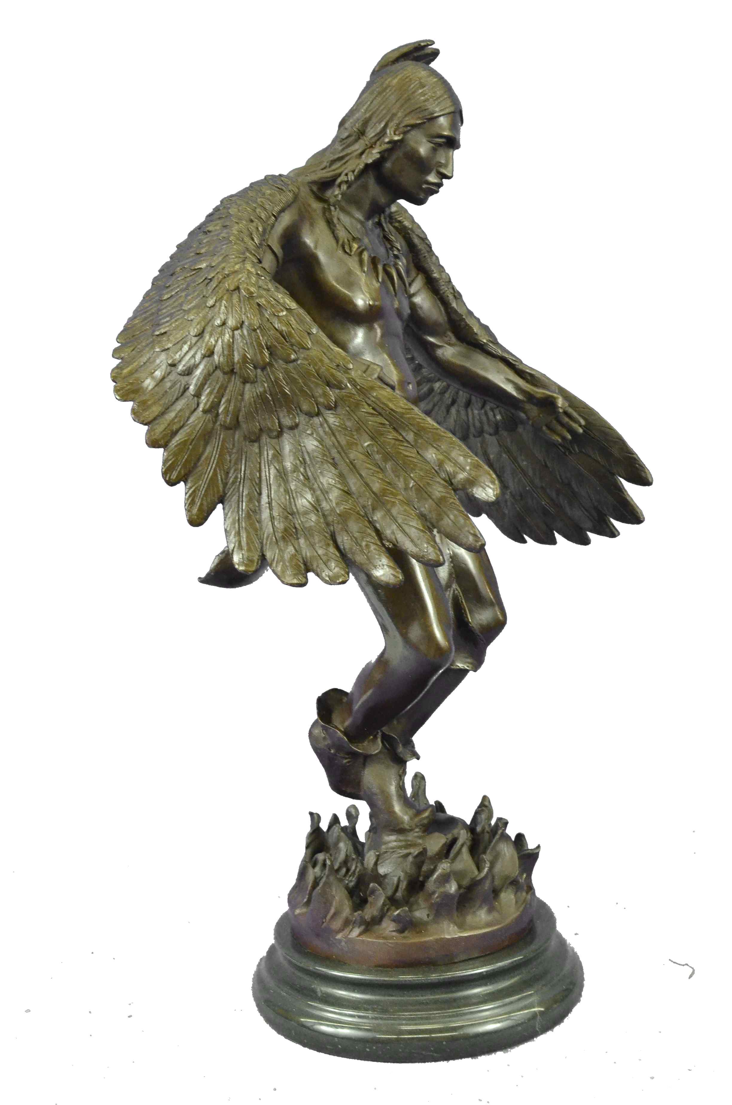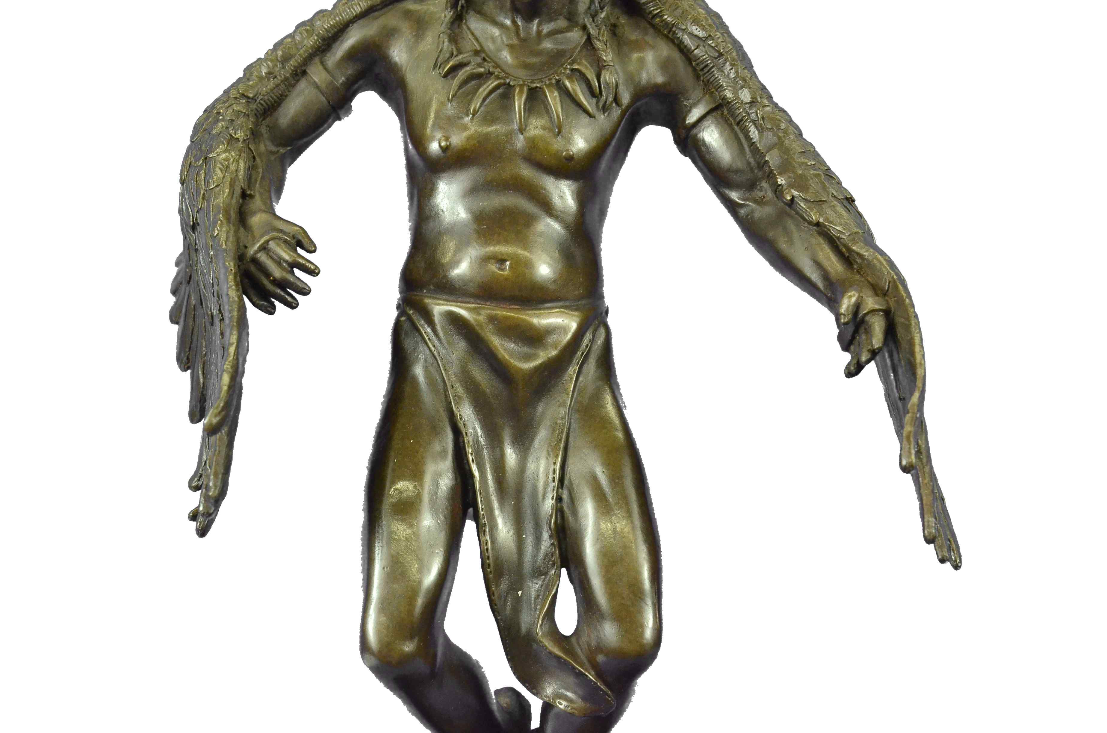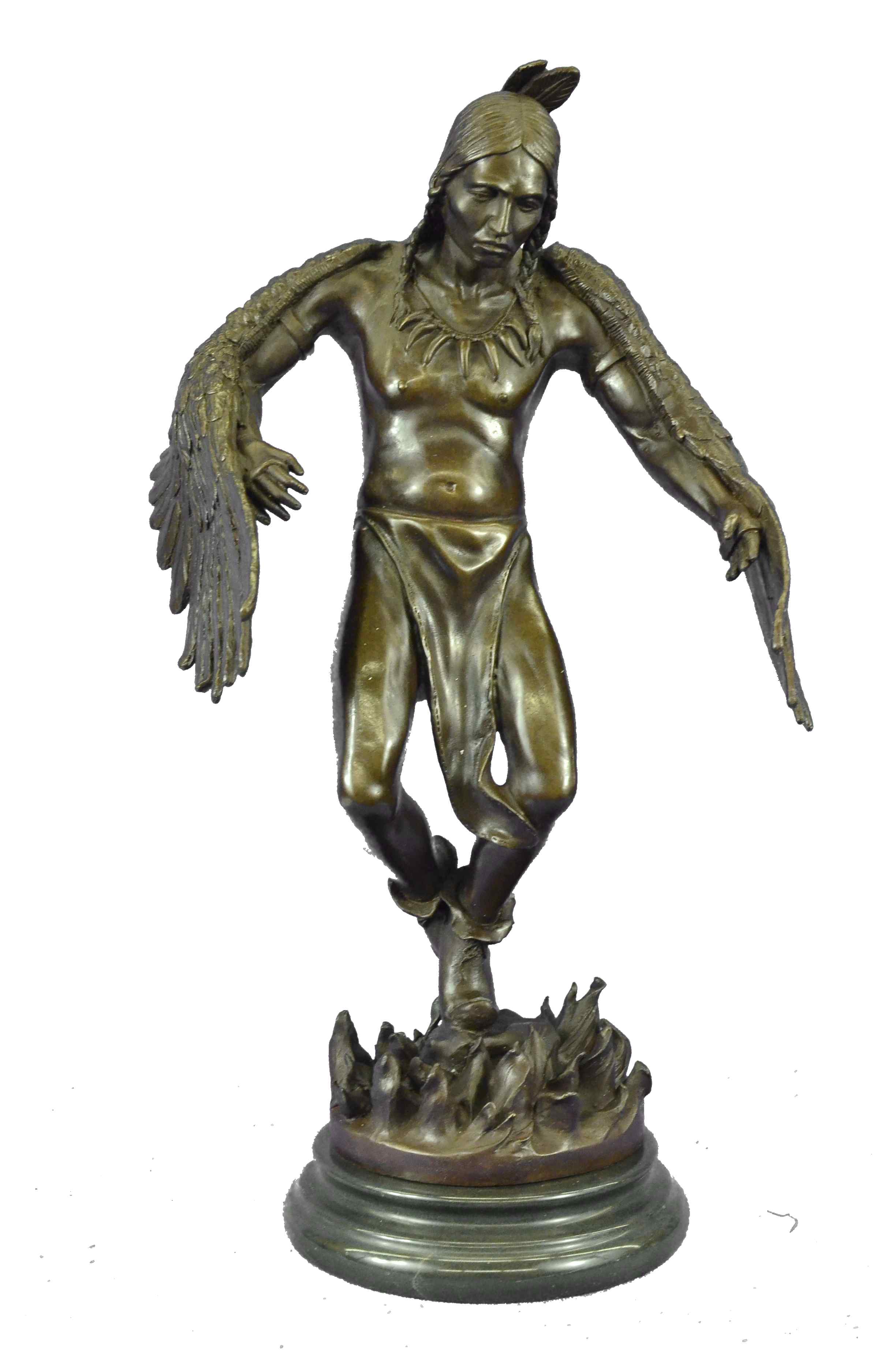 The Native American shaman, or medicine man, stands looking downward, with his arms bent that are attached to eagle wings. The eagle is a sacred messenger, carrying our prayers on its wings to the Creator, and returning with gifts and visions for the people. Eagle feathers assist shamans in connecting with the Spirit for healing. They are deemed the most sacred healing tools, a symbol of power, healing and wisdom. The bronze sculpture was molded using the ancient method of lost-wax casting and finished with a brown patina tarnish. The sculpture is mounted upon a black variegated marble base with the artist R.W. Lange`s signature.Original or Reproduction: Reproduction